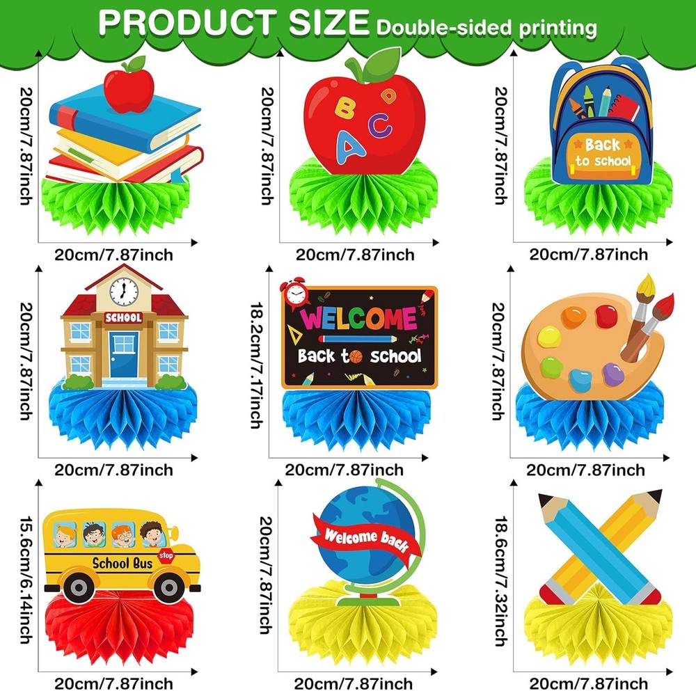 Free eBay listing template designed by dewiso.com 9 Pieces Back to School Party Table Decorations First Day of School Table Centerpieces School Bus Honeycomb Centerpiece Table Topper Welcome Back to School Party Supplies for Home Classroom Decoration FREE AND FAST SHIPPING! About this item Card Stock With Surface Laminated Package Includes: you will get 9 pieces of back to school table centerpieces including chalkboards, books, school buses, pencils, school bags, apples honeycomb centerpieces; These back to school party decorations supplies are vivid enough to make a big hit and create pleasant atmosphere Larger Size: these welcome back to school decorations are about 7.9 x 7.9 inches; They match with most tables and add wonderful atmosphere to the day by setting them on the table, or anywhere you like; These back to school honeycomb centerpieces are impressive enough to be noticed, yet not so tall or big Reliable Material: these welcome back centerpiece are made of sturdy card stock with double side delicate printing and surface laminated; Not easy to be torn, the base is easy to open and can stand firmly on the table for a long time; These first day of school decorations are sturdy, waterproof, safe and odorless, giving you great using experience Easy to Assemble: step1, tear off the sticker of the honeycomb ball; Step 2, stick the honeycomb ball to a fixed area on the card; Step 3, repeat on the other side of the card; Step 4, finally put the table toppers stand on the table, very easy for you to assemble and save a lot of time First Day of School Party Decorations: on the first day of school, with this set of back to school party decorations for classroom or home to welcome your students or encourage your children; These honeycomb centerpieces can be applied as table, home or classroom party decorations, photo props or DIY kits, are suitable for classroom desks, dessert tables, office desks, and more Product We offer a 30-Day Return Policy on items which you are not completely satisfied with. You have the option for a full-refund or an exchange of the item. No returns are available on items shipped outside of the US . Shipping We offer Free Shipping to the US and ship within 2 business days of payment, usually sooner. We use UPS express shipping. That's why your products are usually delivered within 3 days . Contact We try our very best to make sure every customer is completely satisfied. If there's a problem , message us! We're happy to help. 24/7 live chat available.