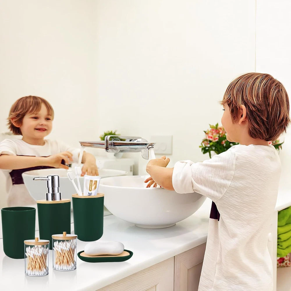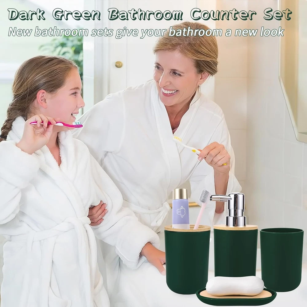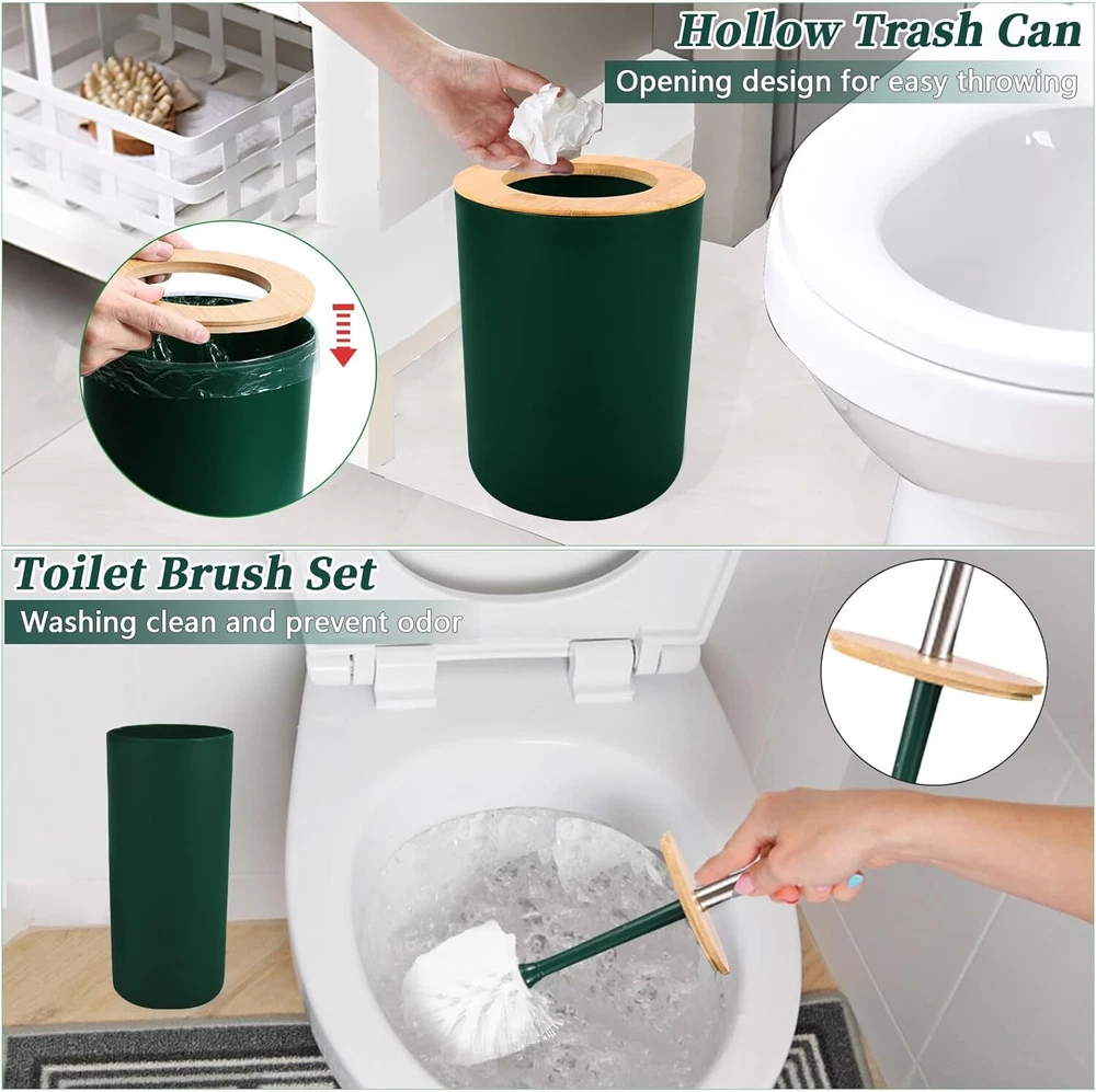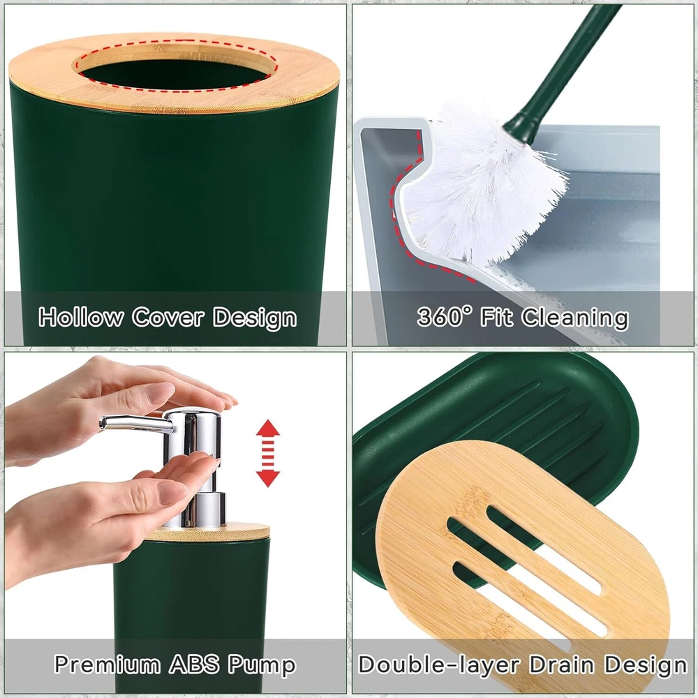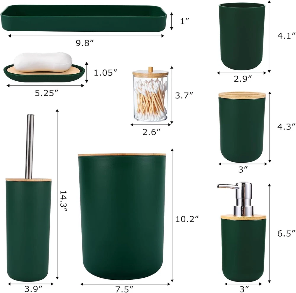9-Piece Dark Green Bathroom Accessories Set with Trash Can, Tray, Soap Dispenser, Toothbrush Holder, Toothbrush Cup, Soap Dish, Toilet Brush and Q-tip Holders for Bathroom/Housewarming Style Traditional Included Components Soap Dispenser Soap Dish Toothbrush Holder Toothbrush Cup Trash Can Toilet Brush and Holder Tray Q-tip Holders Soap Dispenser Soap Dish Toothbrush Holder Toothbrush Cup Trash Can Toilet Brush and Holder Tray Q-tip Holders Plastic 【Hunter Green Bathroom Accessories Sets Complete】9 pieces hunter green bathroom set includes 1 x soap dispenser, 1 x toothbrush holder, 1 x toothbrush cup, 1 x soap dish, 1 x trash can, 1 x toilet brush set, 1 x vanity tray and 2 x qtip holders. Having most of the items you need for your bathroom will make your bathroom more eye-catching. 【Durable and Amazing High Quality】Our dark green bathroom accessories is made of high-quality PP and ABS material, which is not easy to break, more durable and long-lasting, outperforms glass, ceramic, resin, wooden bathroom sets. Premium plastic emerald green bathroom sets are durable and they will stay elegant and new over time. 【Fully Functional Completed Set】Hollow trash can makes it easier for you to throw away garbage. Double-layer hollow design soap dish can keep soap dry. Q-tip holders can put qtips, cotton balls, flossers, bath salts, hair bands or any other bathroom necessities and accessories. Soap dispenser, toothbrush cup, and toothbrush holder are the perfect complement for the bathroom. Bathroom accessories are the perfect addition to your bathroom home-style makeover. 【Easy to Clean & Stay Tidy】This dark green bathroom accessories set with trash can is designed with ease of cleaning in mind, avoiding excessive grooves and hard-to-reach corners. Its smooth surface and simple line make the cleaning easier. Just wash with soapy water and a soft cloth to make your bathroom look like new again. It not only saves your precious time, but also meets the requirements of modern life. Convenient and simple concept make you to enjoy a more comfortable and relaxed life. 【Widely Application】Bathroom set perfect for bathroom decors, dorm, hotel, apartment, laundry room, basement, RV, etc.Perfect for wedding,housewarming/new home gift,birthday gift, mother’s day gift , valentine’s day gift,thanksgiving gift,Christmas gift,bridal or baby shower gifts,friend, sister, co-worker or just about anyone to use all year round.