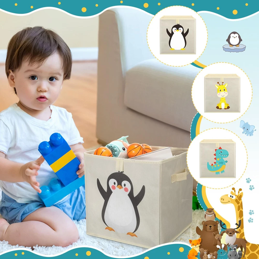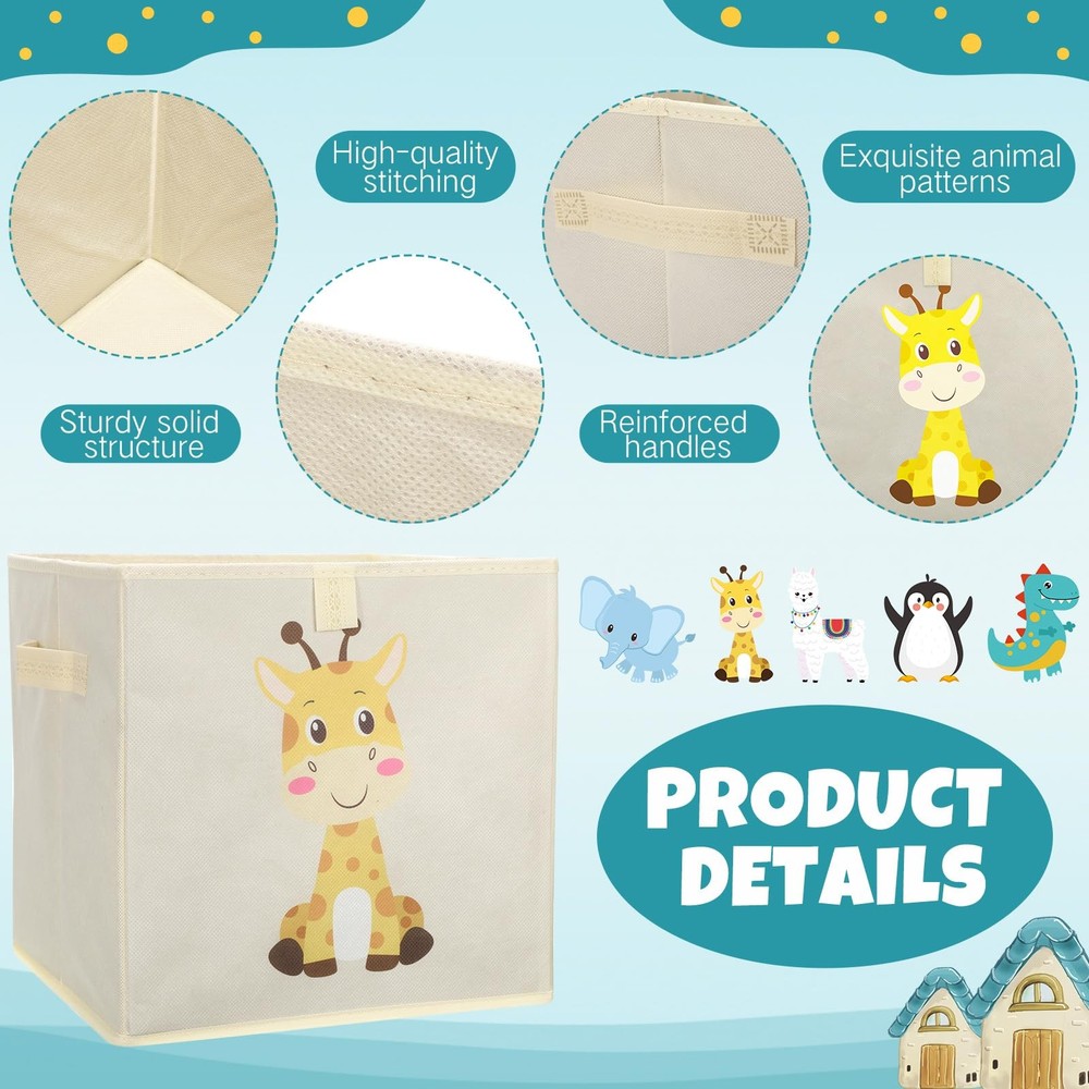 Features: The animal storage basket can be regarded as book storage boxes, toy storage organizer, clothes boxes and more, practical and adorable. These toy containers for kids are designed with an open top and 2 sturdy handles for easy access and convenient pulling or pushing. Specifications: Material: quality non woven fabric, with sturdy cardboard support at bottom Color: as shown in pictures Size: about 11 x 11 x 11 inches Package includes: 9 x Kids cube storage organizer Notes: Manual measurement, please allow slight errors on size. The color may exist a slight difference due to different screen displays. Unmatched Convenience for Everyday Use: to ensure easy access, each kids storage bin is designed with an open top; The inclusion of 2 sturdy handles allows for convenient pulling or pushing; This user friendly design enhances the bins' convenience and ease of use, simplifying the process of tidying up Quality Construction Ensuring Durability: crafted from quality non woven fabric, our animal toy box organizer are designed to last; A sturdy cardboard support at the bottom ensures long term durability and keeps your items well secured, highlighting the products' quality material and reliability Suitable Storage Solution with Large Size: featuring a size of approximately 11 x 11 x 11 inches, these kids cube storage organizers offer ample space to store toys, books, clothing, and other items; With the set including 9 bins, they make organizing easy and clutter free, fulfilling customer needs for sufficient storage solutions Adorable Animal Pattern Design: delivering both functionality and aesthetics, these nursery storage bins are decorated with charming animal patterns; They blend well with children's rooms or playrooms, providing a fun decorative touch to any setting; Their appealing design and foldable feature hold multifunctional use, doubling as both storage and a decorative element Multipurpose and Versatile: not only does our package offer a sufficient quantity of 9 kids storage cubes, but these bins also serve versatile purposes; They provide an ideal storage solution for children's' rooms, nurseries, bathrooms, offices, and other indoor spaces; Their multipurpose usage also includes storing books, toys, clothes, accessories, and other small items, adding function and charm to your various storage needs