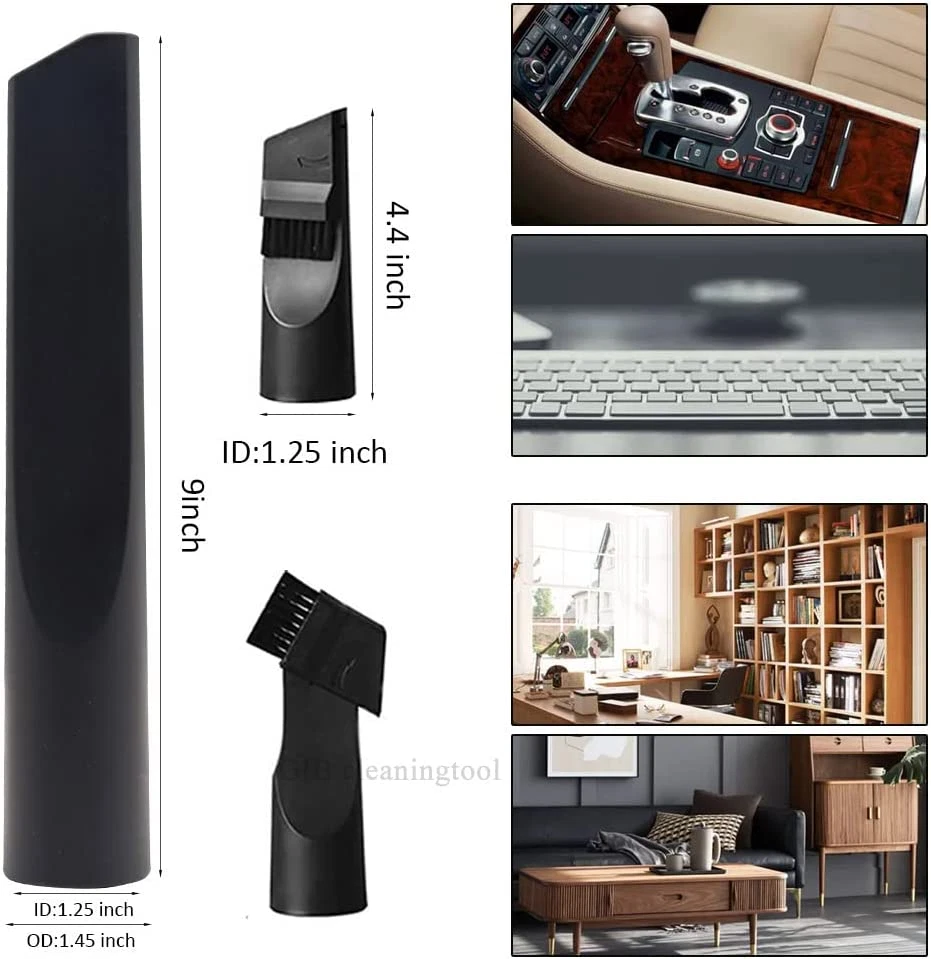 Vacuum attachments are compatible with Most Vaccum (Not All ) with standard 1 1/4 inch (32mm) and 1 3/8inch (35mm) inner diameter, (May not fit for Bissell,not for Shark, not for Hoover, not for Dirt Devil, not for Craftsman.), The attachments include 32 mm (1 1/4") to 35 mm(1 3/8") vacuum attachment adapter, 1 1/4" (1.25") horse hair vacuum attachment, 1 1/4" crevice tool, 1 1/4" upholstery tool attachment, 1 1/4" utility nozzle with removable plastic brush, 1 1/4" brush & nozzle combination tool. Vacuum Hose Adapter - The small end of adapter is suitable for vacuums hose or wand with 1.25" (32mm) inner diameter and the big end of the adapter is suitable for vacuums wand with 1.34" (34mm) outside diameter. Attach your vacuum hose or wand with other vacuum cleaner accessories providing an all-around cleaning for your home, office or car. 1 1/4 Vacuum Attachments & Brushes - Horse hair vacuum attachment is great for hard surfaces such as counter tops, dust tables, vertical blinds, air and heating vents etc. Removable Utility Nozzle, Brush & Nozzle combination Tool and Upholstery Tool Brush are suitable for soft or uneven surfaces without damaging the object such as curtains, sofas, lighting equipment, pet hair, etc. Vacuum Extension Wand - The outside diameter of the small end is 1.22"(31mm), so the inner diameter of the vacuum attachments you want to connect to the small end should be 1.25"(32mm). The inner diameter of the large end is 1.25" (32mm), the outer diameter is about 1.34" (34mm). So the outside diameter of the vacuum attachments you want to attached with the large end should be 1.22" (31mm) or 1.21 (30.7mm), inner diameter should be 1.37"(35mm). The small end of our vacuum extension wand can also be attached to our crevice tool, upholstery tool attachment and brush. And the length of the GIB cleaningtool extension wand is 14.6". So great tool to help cleaning high and low places. Vacuum attachments are suitable for Most Vaccum (not all) with standard 1 1/4 inch(32mm) and 1 3/8 inch (35mm) inner diameter, fit for shop vac accessories with 1 1/4 inch inner diameter . Not Fit For 1 1/2, 1 7/8, 2 1/2 inner diameter vacuum cleaner and vacuum attachments May not fit for Bissell, May not fit for Shark, May not fit for Hoover, May not fit for Dirt Devil, May not fit for Craftsman. The GIB cleaningtool vacuum attachement set includes 32 mm (1 1/4 inch) to 35 mm(1 3/8 inch) vacuum attachment adapter, 1 1/4 inch(1.25") horse hair vacuum attachment, 1 1/4 inch crevice tool, 1 1/4 inch upholstery tool attachment, 1 1/4 inch utility nozzle with removable plastic brush, 1 1/4 inch brush & nozzle combination tool. The 3 vacuum extension wand and the vacuum attachements are held together by friction.