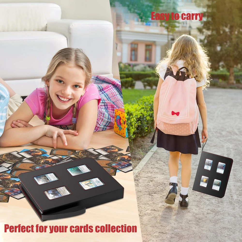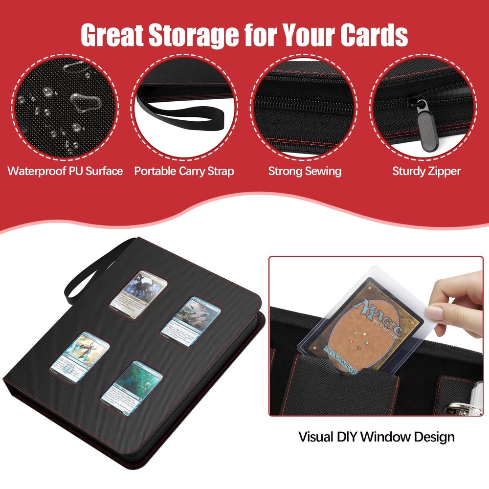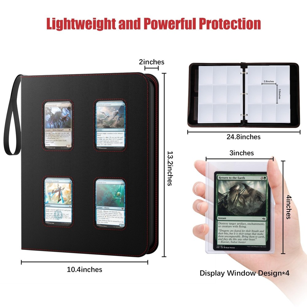 Organize your collection of trading cards, baseball cards, or other precious card items with this sturdy 9 pocket card binder. Designed with multiple pockets, this binder allows you to neatly store and display your cards while protecting them from damage. The clear plastic pockets provide a secure fit, keeping your cards firmly in place. With its durable construction and ample storage capacity, this binder is an essential accessory for any serious card collector or enthusiast. Easily transport your prized possessions and showcase your collection with pride. 【Unique Display Design 】 The trading card binder features 4-window display system. The unique cover window design to proudly showcase your favorite Card, integrated visual windows enable instant card type recognition. 9 pocket binder holder trading card, fits 720 cards with 40 removable sleeves. The 3-ring design is allows effortless sleeve addition or remove sleeves and meets all your collection needs. 【Premium Details】Our card binder is crafted with waterproof PU leather and reinforced edges, providing ultimate protection against wear, tear, and potential damage, durable quality. The card sleeves are acid-free, non-toxic, and highly transparent, ensuring card safety. The superior quality allows you to see all the cards clearly without taking them out, making it easy to show them to your friends. 【Great Portability】 The binder designed with wristband design ensures convenient portability wherever you go. You can take the card binder to school or friends' homes to share your favorite cards with your good friends or classmates at any time. The wristband has a smooth surface that won't hurt your wrists. 【Unique Gift Idea】Our card holder Book has a unique design. The sleek cover not only make a statement but also reflect your unique style. Smooth zipper benefits to zip up or expand, again preventing card from slip off and protecting privacy. It is perfect for gifting to children, fathers, as a birthday gift, Thanksgiving or Christmas gift, and more. 【Wide Application】Holds standard sized cards with 2.8inches*3.9inche/3inches*4 inches or smaller. Designed to accommodate various card sizes, the trading card case is compatible with most popular Baseball Cards, MTG Cards, Football Star Collect Card and Game Cards.