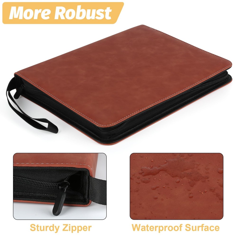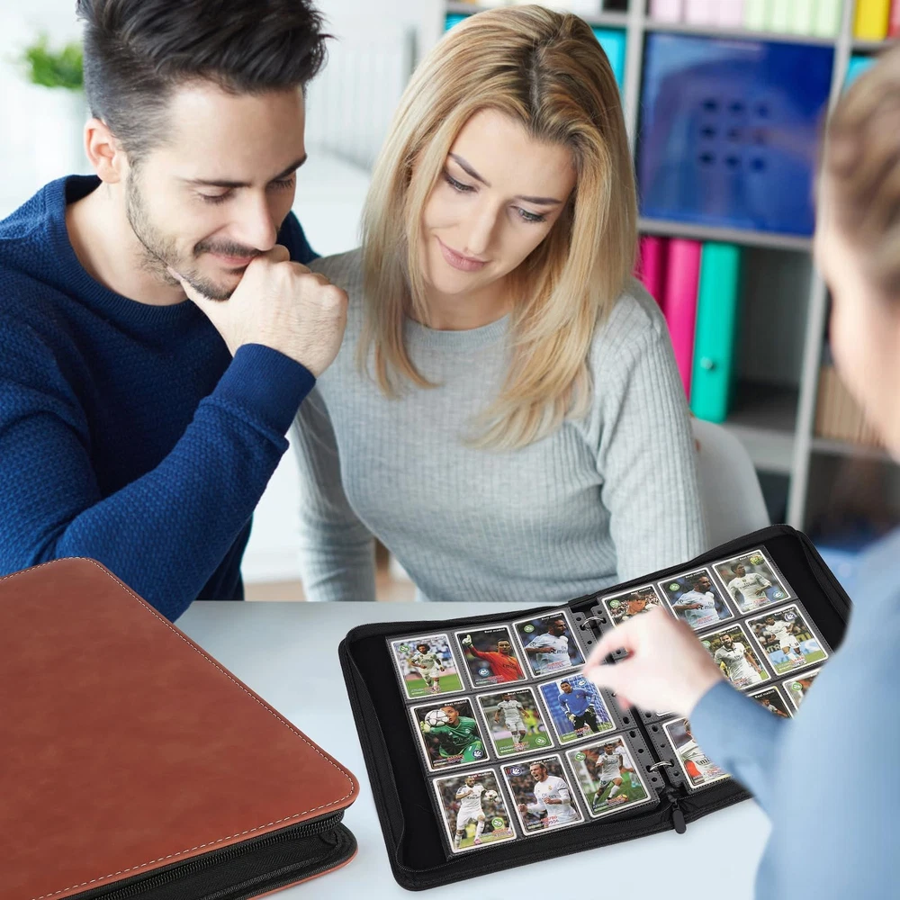 9-Pocket Binder for Cards fit for 720 cards: A must have for trading card collector's, beautiful and compact card binder for kids to carry around wherever they go, get this zipper binder by . Features You’ll Love: 1. 9-Pocket cards binder for trading cards with PVC-Free EVA foam and PU leather 2. cards holder for trading card with sleeves with plenty of room to hold 720 trading cards 3.binder for trading cards with sleeves have all cards in the binder and not all over the place 4.card binder for trading cards with 40 sleeves compatible with universal standard size trading cards, game cards, sports cards and more. Perfect Match Standard Binder : Our card binder for trading cards with sleeves is great for trading cards storage, keeps your trading cards safe, protected, and organized! perfect for most. What’s In The Box A carrying binder with total 720 pockets card sleeves ( 40 pages, double-sided use), trading cards are NOT INCLUDED. After Sales Service: Please don't hesitate to reach out to us if you have any issues with your purchase - we're here to help! Our company will reply within 12 hours after receiving the email and resolve it until you are satisfied. 【Best Gifts for Kids】 A perfect gift for 3-12 year old kids to put their favorite cards in and carry around to show off at school and to their friends' houses. Designed for trading card lovers! Must have if you own a bunch of cards. 【Premium Details】 The card binder for trading cards is made of premium PU leather, Water or raindrops won’t seep through. the black card sleeves' main material is clear polypropylene, durable quality, Acid Free, waterproof, super sturdy that won't get cards bend up, protect your card from fading and stain. 9-pocket card binder is just a right size for kids or adaults to carry around with a wrist strap. A soft exterior, perfectly 【3-Ring Binder with 40 Pages Sheets】 The 3-ring design is convenient for you to add or remove sheets at will. 9-Pocket binder with 40 pages of sheets can hold up to 720 cards, providing plenty of space to get all your cards organized. 【Multiple Protection】 The card binder for trading cards is made from durable and waterproof PU material for easy cleaning, Our card binder has good dust-free and moisture resistance. Great for trading cards collection and storage, or as an album for school supplies 【Applicable Card】 Our Card Binder for trading cards is compatible with standard sized cards such as Fuji mini Polaroid photos, Yu-Gi-Oh Card Game, Skylanders, Football Cards, Baseball Cards, MTG Card Game, Dutch Blitz Card Games, etc.( trading cards are not included )