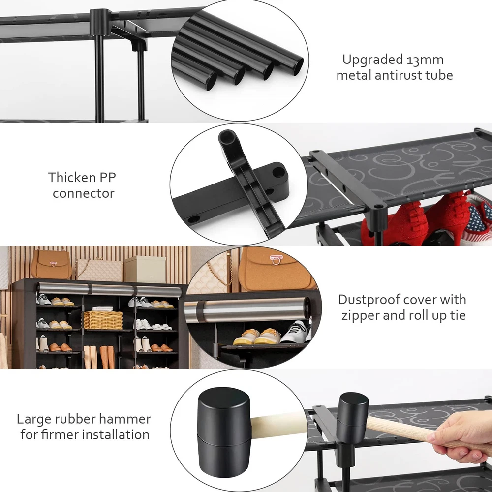 9-Tier Large Tall Shoe Rack with Covers 40-46 Pairs, Sneaker Rack Organizer Shoes Cabinet Closed Shelves Shoe Stand Holder for Garage Bedroom,Zapateras Organizer for Shoes 50 Pares Product Features 【Covered Shoe Rack for Dustproof】-This large shoe closet comes with visual cabinet door design, at a glance, you can easily find the shoes you want.The non-woven dustproof cover with zipper to keep dust off your shoes and stuff, and there is a velcro so you can roll up the curtain for easy access or storage. 【Upgraded PP Layers Tall Shoes Shelf】-The shoes organizer cabinet composed of high-quality PP sheets. Compared with non-woven layers, the PP layers bearing stronger and not easy to deformation.Most importantly, it’s much more convenient for storing high heels,no more falling through the slots. 【Large Capacity Shoe Storage Rack】-This closed shoe rack is capable of holding up to 32-38 pairs of shoes and 8 pairs of boots.Perfect large tall covered shoe holder for garage, bedroom,closet and entryway.Size:50.4”X12.2”X55.9”,The top of the tall shoe stand with cover can be put bags,green plants and other daily products, etc.There are 4 large cells for kneel boots and other big storage boxes.So it will also be a big great organizer shelves for home and dormitory. 【Large Rubber Hammer for Easier Installation】-Use the rubber mallet banging hard to keep all the parts tightly together, allowing you to get a more stable garage shoe rack.We also provide detailed installation guide and installation videos to help you install quickly. 【Portable & Sturdy Shoe Organizer Cabinet】-Our tall shoe rack is made of upgraded 13mm anti-rust metal tubes,strengthened connectors and PP sheets,all of these to ensure excellent stability and load-bearing capacity.This large enclosed shoe rack is compact yet light weight.You can easily move and place it to the place you planned. 【Excellent After-service】-The quality and service is our first priority.Please feel free to contact us if you have any problems about the shoe closet. We offer refund service to help you get a great shopping experience. Shipping: Shipping is complimentary within the lower 48 US States. We Do Not Ship to PO/APO Boxes, HI or Alaska We Do Not Ship Outside of the Continental US All items ship within 24-72 hours of Payment For large items that require Freight shipping a valid phone number is required to call and schedule your delivery Terms of Sale and Feedback: Feedback is extremely important to us and eBay If you are satisfied with our transaction, please take a moment to leave Positive Feedback. YOUR Satisfaction is our #1 Priority! If there are any issues, PLEASE contact us BEFORE leaving a neutral or negative rating so that we may resolve any concerns. We PROMISE we can make you happy if you give us a fair chance. Returns / Concerns: All items qualify for returns within 14 - 30 days of receipt. Buyer is responsible for return shipping on any item that is not damaged Please be sure this is an item you want before making your purchase. Customer Satisfaction is our TOP priority! All items are IN STOCK at time of listing. Inventory on eBay changes constantly and it is impossible to maintain a perfectly accurate count of all items. Please do not penalize us if we have to issue you a refund! Thank You For Your Business!