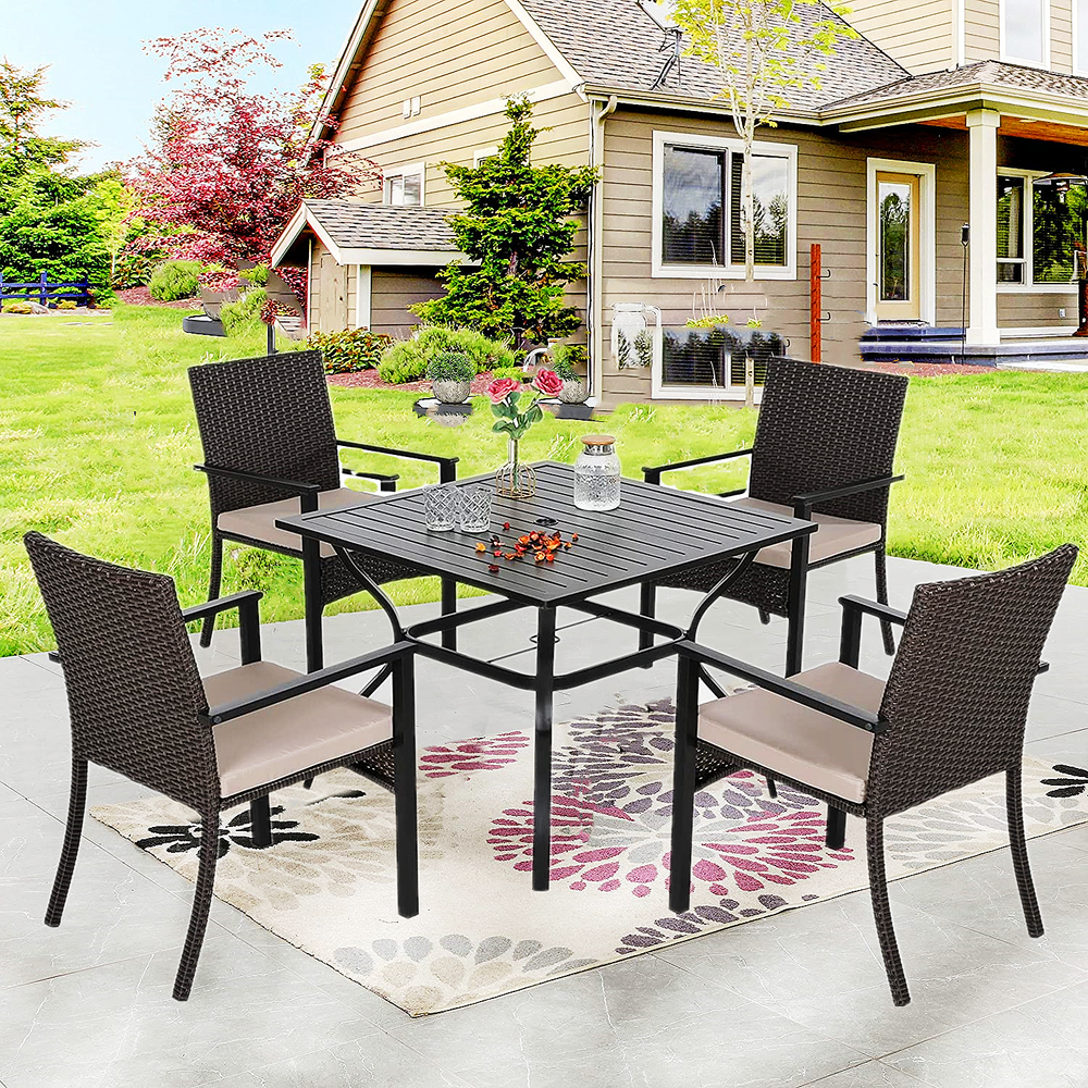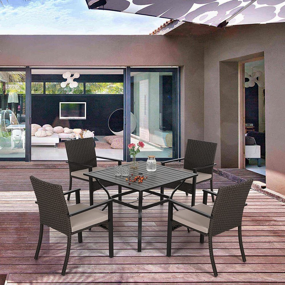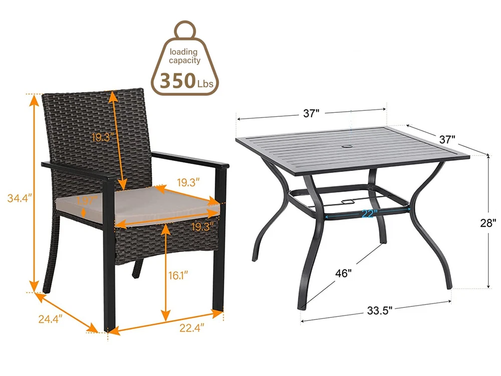 Department: Adults FSC Certified: Yes Chair Height: 34.5 in Umbrella Size: 9 ft Color: Dark Brown Assembly Required: Yes Seating Capacity: Up to 4 Type: Dining Set Number of Items in Set: Six-Piece Assembly Status: Part Assembled Brand: PHI VILLA Chair Back Material: Rattan Cushions Included: Yes Table Length: 37 in Umbrella Included: Yes Seat Height: 16 in Style: Outdoor Dining Set MPN: Does Not Apply For 1: Outdoor Dining Sets Tabletop Color: Black Year Manufactured: 2024 Umbrella Color: Beige Tabletop Material: Metal gtin13: Does Not Apply Seat Depth: 19.3 in Required Tools: Screwdriver Table Width: 37 in Table Height: 28 in Material: Metal, Rattan, Wicker Model: Patio Dining Furniture Chair Depth: 19.3 in UPC: Does Not Apply Finish: Metallic Set Includes: Chairs, Seat Cushion/Pad, Table For: Patio Umbrella Chair Color: Dark Brown Table Shape: Square Manufacturer Warranty: 1 Year Chair Width: 22.4 in Features: Umbrella Hole, UV Protected, Waterproof Cushion Color: Beige