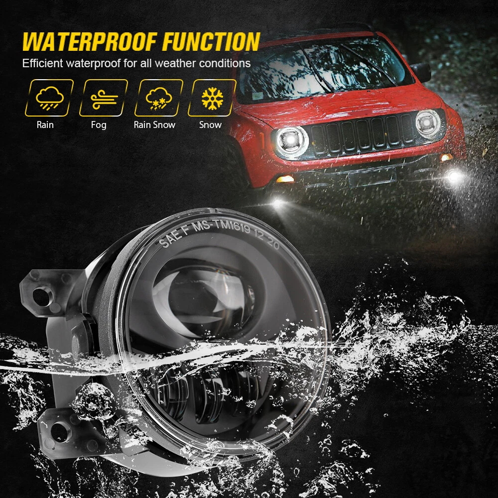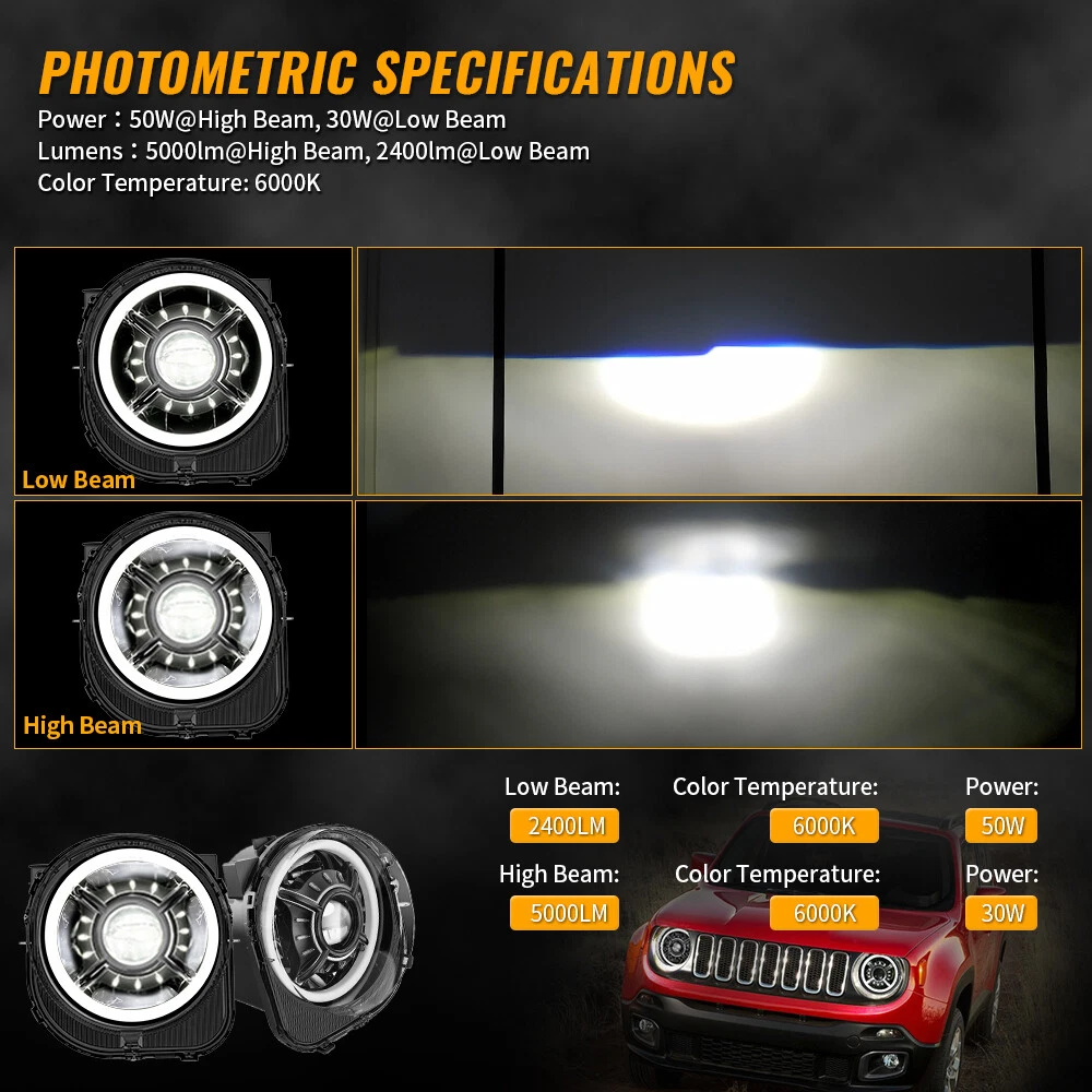 9inch LED Halo Headlights +LED Fog Lights Assembly For Jeep Renegade 2015-2018 FITMENT For Jeep Renegade 2015-2021 9 Inch DOT Approved LED Headlights SPECIFICATIONS Height: 250.4mm/ 9.86inch Width: 237.3mm/ 9.34inch Depth: 203.6mm/ 8.02inch Color Temperature: 6000K Voltage: DC 12V Power:50W@High Beam, 30W@Low Beam Lumens:5000lm@High Beam, 2400lm@Low Beam Position lamp:3.9W Outer Lens Material: PC Outer Lens Color: Clear Housing Material: Die-cast Aluminum Housing Color: Black DESCRIPTION DOT Compliant-- The DOT-compliant headlight lights guarantee your lights are Compliant in the United States Department of Transportation for use in the U.S. & Canada to secure the safety of others. Exclusive Latest Design Headlights-- 12 starry and “X” design with Halo ring. Projector and reflector combination, ensure the lights source pass through the cover in high transmission rate, keep the light steadier concentrated. More brighter 3 times than stock halogen bulbs or other similar led headlights. Provides you the best driving experience. Super Brightness-- High Beam@2600LM Low Beam@1400LM Pure White DRL Daytime Running Lights for 9 Inch LED headlight. Built-in antiflicker harness to avoid any flicker issues. Sharp cut-off line with perfect halo beam pattern gives off a more even light, NOT blind other drivers while providing the brightest and widest vision. High Quality & Durability-- Better Waterproof with 3 rebreather valves on the back to avoid fog get inside the headlights. Die-cast Aluminum Housing and Anti-scratch Polycarbonate lens will resist the test of time up to 50,000 hrs. 4" Round LED Fog Lights SPECIFICATION Diameter: 91.8mm/ 3.61 inch Depth: 76.9mm/ 3.03 inch Color Temperature: 6000K Voltage: 12V DC Power: 27W Lumen:1200lm Outer Lens Material: PC Housing Material: Die-cast Aluminum Housing Color: Black DESCRIPTION Durable Construction-- The steady housing is made of strengthened PC lens and Die-cast aluminum that the lifespan is more than 50,000 hours which it's strong enough to deal with all kinds of bad conditions. Excellent Heat Dissipation System-- Die-cast aluminum alloy housing can efficiently dissipate more heat and keep cool, make the lamp lifespan that more than 50,000hrs; IP waterproof 67 rating ensures all-weather dependability. Easy Installation-- Just Plug and Play. Complete set fog Lights are designed to simply plug into your existing wiring without any cutting or drilling. Safe Driving-- The response speed of LED lights is faster than halogen lights, and it have ultra-high brightness and ultra-wide field of view, so the driver can drive freely in the dark without worrying about driving problems caused by the darkness of the road. PACKAGE INCLUDED 2pcs LED Fog Lights 2 pcs 9 Inch LED Headlights with Daytime Running Light Payment Shipping Returns Contact us Feedback Payment Payment methods : Payment is expected within 7 days of auction close. Unpaid Items will be forfeited per eBay . Immediate payment needs to be processed for items with Add to Cart option so that any promotional discounts can be applied to your order immediately. International Buyers – Please Note: a) Import duties, taxes and charges are not included in the item price or shipping charges. These charges are the buyer's responsibility. b) Please check with your country’s customs office to determine what these additional costs will be prior to bidding /bu ying. Shipping 1.All items will be shipped to your eBay Address .Please update your latest address when you check out,and please make sure to provide us with correct,precise and detailed shipping address. 2.If your shipping address and the item location both are US, it will be shipped by USPS or UPS. All items will ship within 1-2 business days after the we receiving clear payment. 3.Service transit time is provided by the carrier. Transit times may be a little delayed during holiday season. 4.International order will be sent from China within 3 business day after the we receiving clear payment. ---For International Orders. Both are the same products and same warranty. Duties and taxes may apply. Please check with your country's custom and eBay policy for more information. 5.Where is my tracking number? Please log on your account, click "my eBay"-->"my summary", or open your email box and find the shipping notification email. Returns Our 30 days Satisfaction Guarantee assures our customers that they will receive all orders promptly and exactly as described. In addition, we offer FREE RETURNS for US buyers. It allows customers to return faulty and unused products for any reason within 30 days from the date of purchase. *Please contact us first before you sent a return request* The seller is responsible for all return shipping, including those due to customer errors or defective items. 1) If you receive an item that is incorrect, damaged, defective or not as described, please contact us for a partial/full refund or replacement. 2) If you want to return the item, please contact us within 30 days after receiving the package. 3) If you open a return request ,please select the reason for return: Doesn't fit/Changed my mind/Just didn't like it/Order by mistake. 4) We provide the 1 year of product warranty. If your product have quality problem within the warranty period, please contact us to provide repair or replacement services to you. Note: Return products must also be in its original condition: including box, packaging and all other accessories Contact us Our Working Time:(GMT+8)Monday to Friday,9:00-18:00. Have Question or Problem? Please contact us first! 1. We will reply you within 24 hours once we receive your email during business days. There will be some delay on response if you send message or E-Mail on weekend. 2. Describe your question clearly. We have a very professional and attentive customer support team. We will give you the best solution by our great communications. 3. We have always been trying to provide the best service and reliable pro