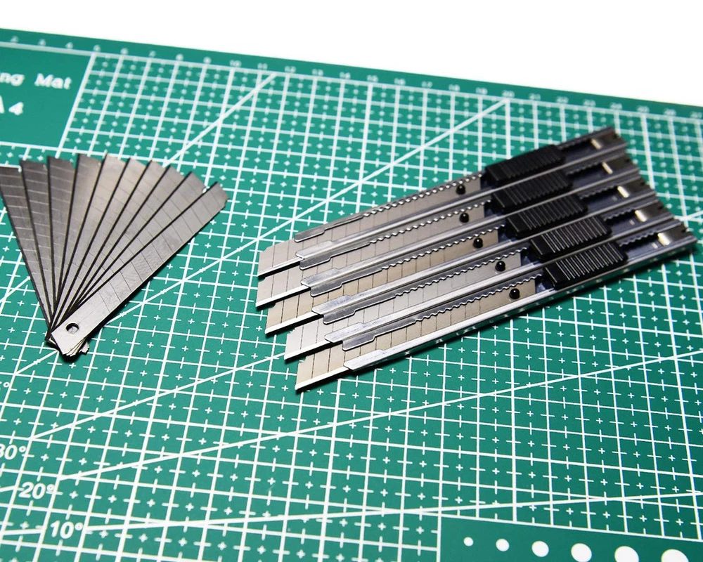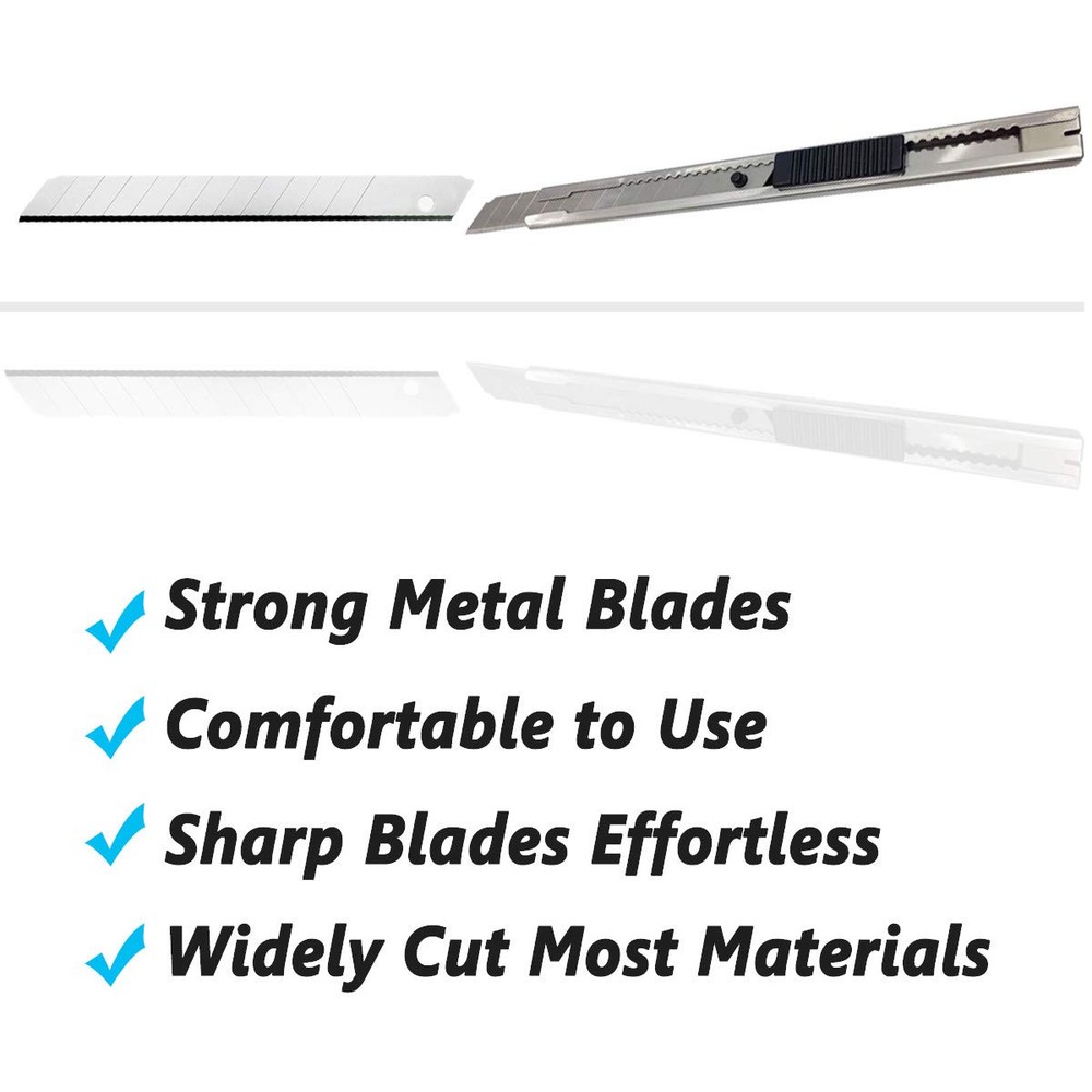 【Value retractable razor knife set】comes with 5 pcs excellent 9mm utility knife, extra 10 pcs carbon steel snap off blades well packed in a plastic box 【Sharp snap off blade】auto lock knife with 9mm wide sharp blade, made of high grade steel, sharp to use; sharp angle blade enable your cutter razor blade always sharp 【Easy to change】easy to change the blade within seconds, simple and flexible to use. Ideally utility knife set for cutting your paper,foam,vinyl,wallpaper,or opening the Amazon packages 【Stable to use】with auto-lock design,stable to use the cutters.small pocket clips,convenient to carry around,fits into your tool-case,pocket,belt pouch, tool kit, shirt pocket 【Wide application】ideal for basic cutting tasks,great for wallpaper,vinyl,foam,cardboard ,craft hobbyists and artists, office, home ,warehouse,usage