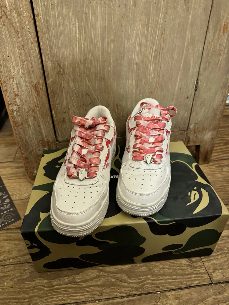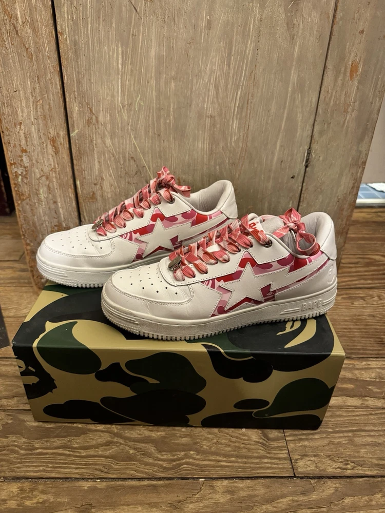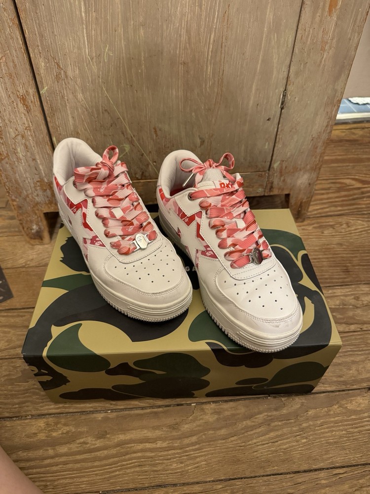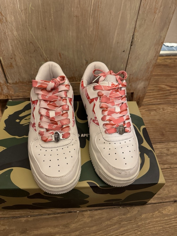 These pre-owned A Bathing Ape Men's Low-Top Sneakers feature the iconic ABC CAMO pattern in a vibrant pink colorway. The sneakers are part of the 2025 Model ABC CAMO BAPE STA collection and boast a BAPE STA motif. Crafted from cowhide, the upper material provides durability and style, while the rubber outsole ensures traction and comfort. With a US shoe size of 8, these sneakers are a stylish choice for casual wear for men who appreciate the unique and recognizable A BATHING APE brand.