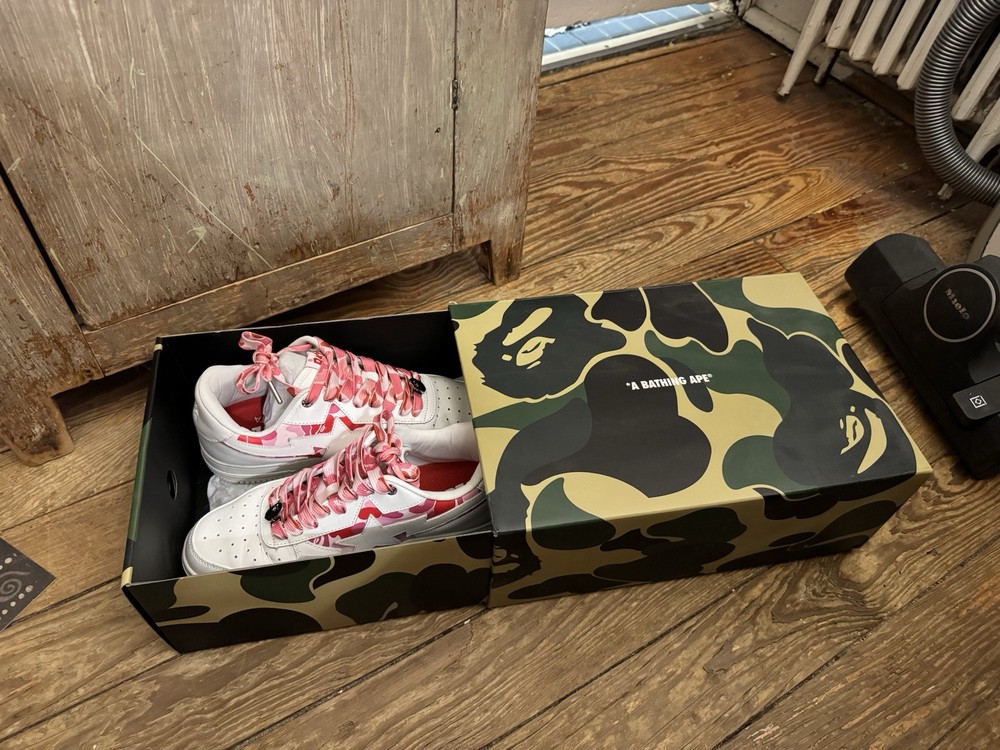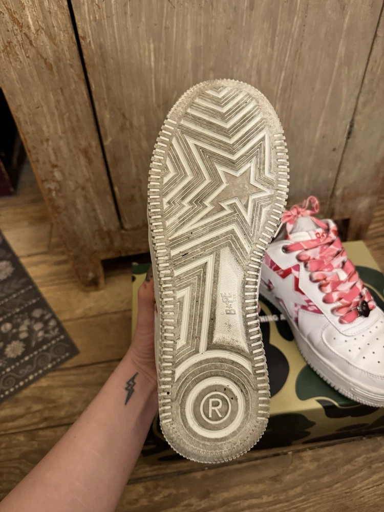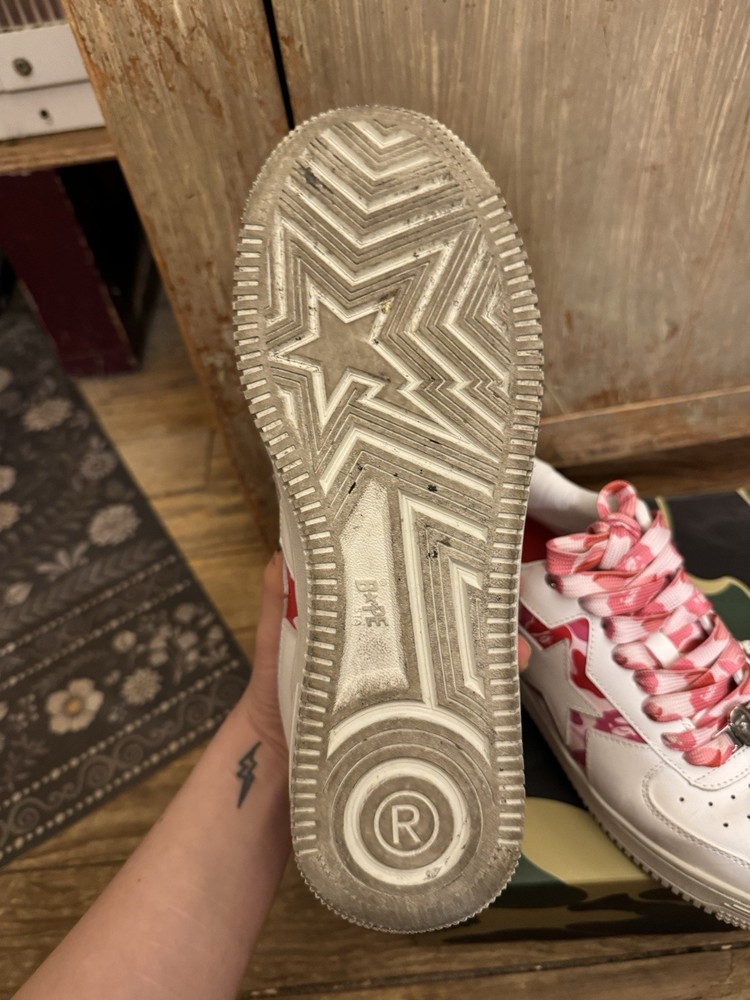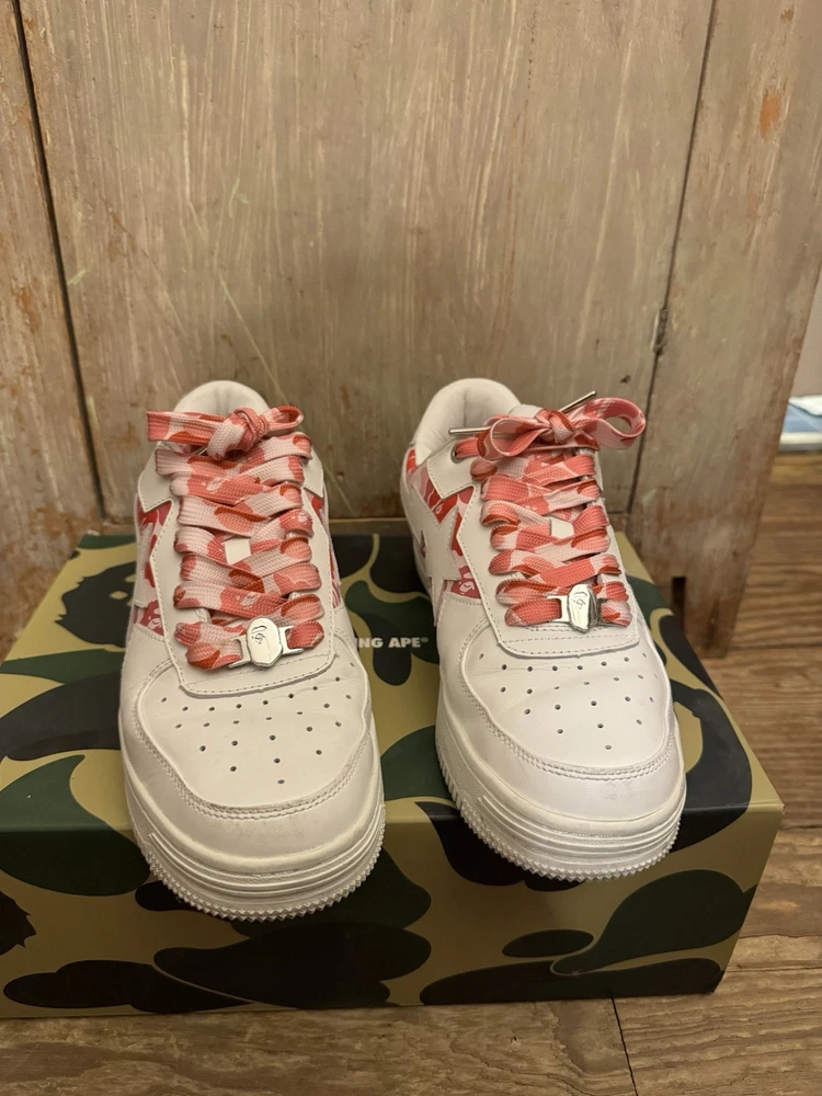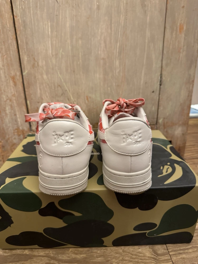 These pre-owned A Bathing Ape Men's Low-Top Sneakers feature the iconic ABC CAMO pattern in a vibrant pink colorway. The sneakers are part of the 2025 Model ABC CAMO BAPE STA collection and boast a BAPE STA motif. Crafted from cowhide, the upper material provides durability and style, while the rubber outsole ensures traction and comfort. With a US shoe size of 8, these sneakers are a stylish choice for casual wear for men who appreciate the unique and recognizable A BATHING APE brand.