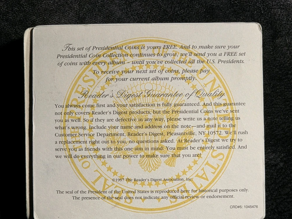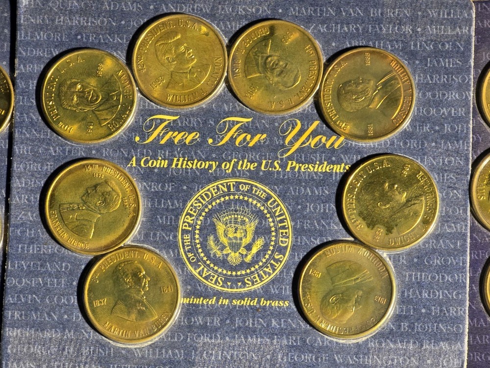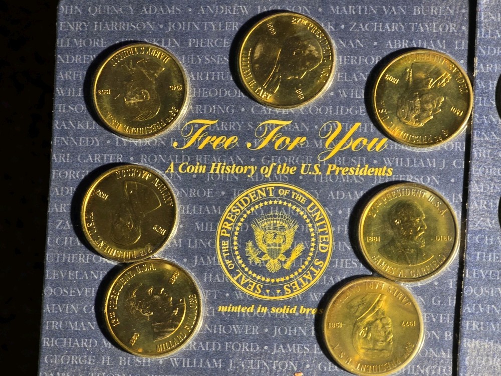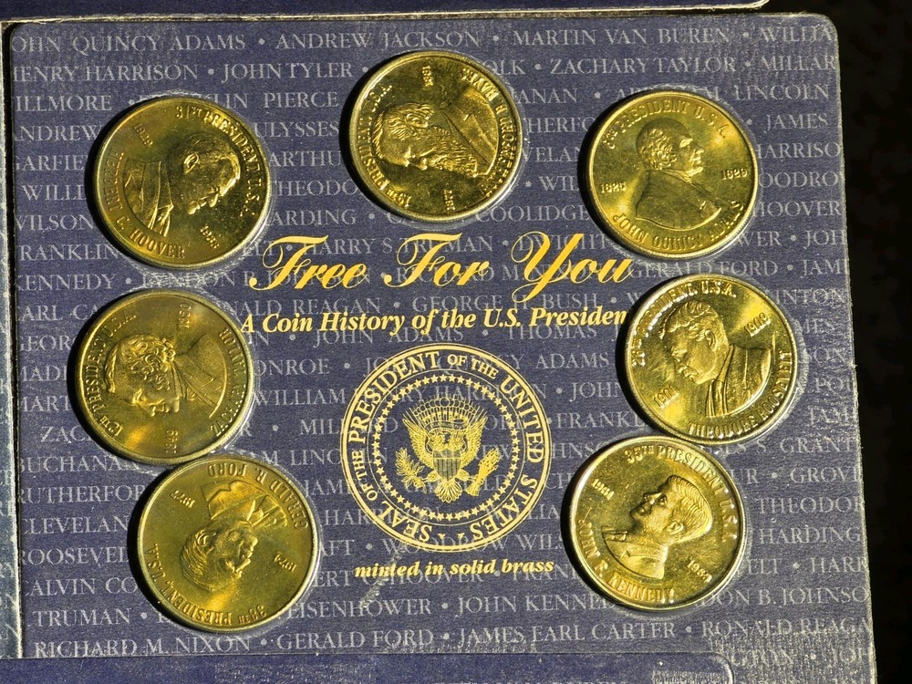 The product is >> NINE << setS of five uncirculated solid brass coins depicting US presidents, housed in a sealed container. Each coin is a unique piece of exonumia, showcasing the history and likeness of different American presidents. This collection serves as a commemorative piece for collectors or those interested in numismatics, offering a tangible connection to the past leaders of the United States. The coins are a representation of American heritage and can make for a meaningful addition to any numismatic collection.