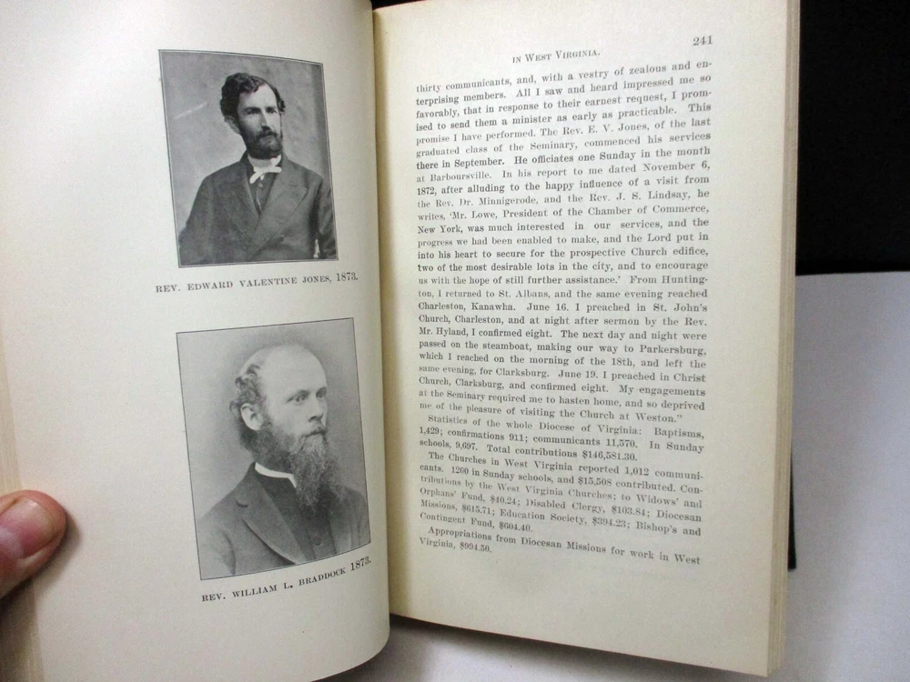 A History And Record Of The Protestant Episcopal Church West Virginia Diocese 1902 A History And Record Of The Protestant Episcopal Church In The Diocese Of West Virginia By Geo. W. Peterkin Published 1902 Entered according to an act of congress in the year 1901 854 Pages Condition: The cover has light wear on the corners and light fading on the bottom edge. The hinges have partial cracks in the paper covering. Shipping Notes: We do offer reduced shipping costs when buying multiple items.
