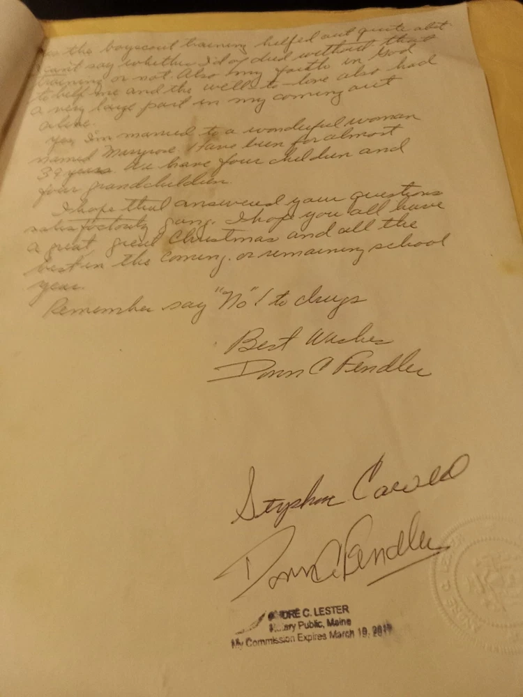 This is a unique collectible item that features a letter from Donn Fendler to Bill Guerette and Class on December 11, 1990. The item is perfect for those who are interested in correspondence and wants to add a piece of history to their collection. The letter is written in English and is a great addition to any paper collection. The item has been well-preserved and is in excellent shape. It is perfect for display or for reference purposes. Get your hands on this rare item today and add it to your collection! The letter has been authenticated by a Notary Public in Newport Maine on March 10 2019.