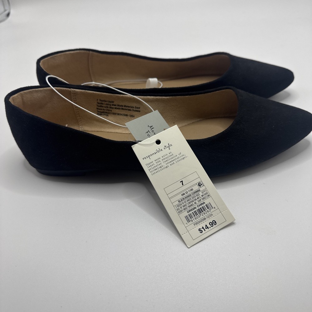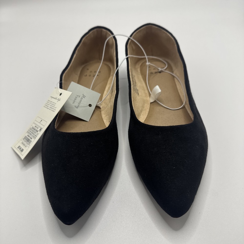 The product is a pair of A New Day women's size 7 flat shoes in black. Made of synthetic material, these flats are stylish and comfortable for everyday wear. Perfect for any casual outfit, these shoes are a versatile addition to any wardrobe. A2T4 0373