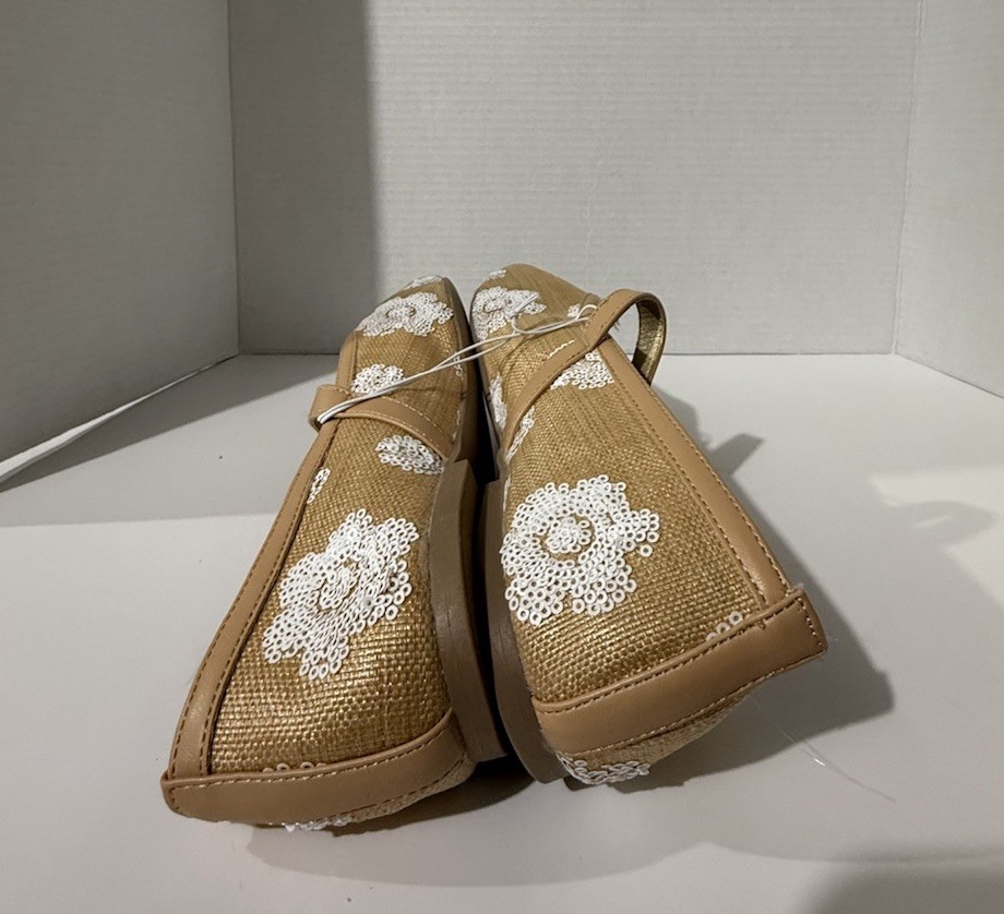 The A New Day tan white floral Mary Jane flats in size 10 are a stylish and comfortable choice for women. These flats feature a feminine floral pattern with a white color, perfect for adding a touch of spring to any outfit. The Mary Jane style, synthetic upper material, and flat sole make these shoes both trendy and practical for everyday wear. Whether for work or play, these A New Day flats are sure to be a versatile addition to any wardrobe.