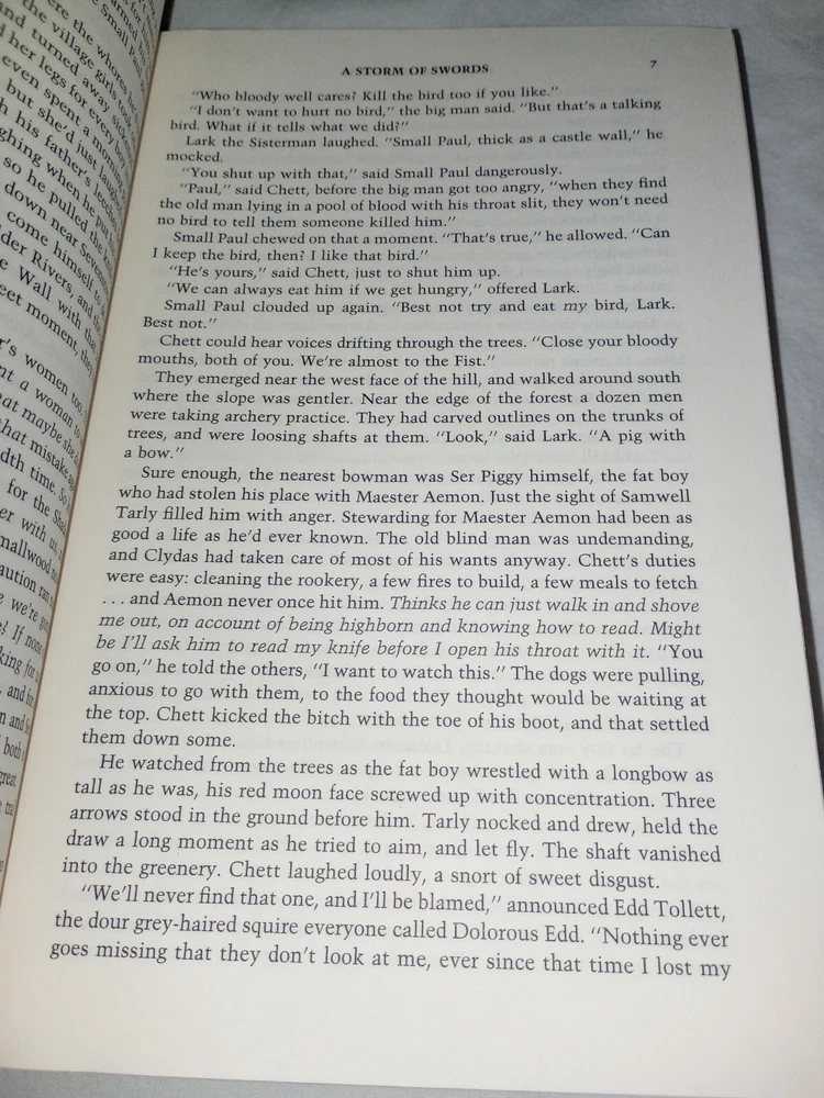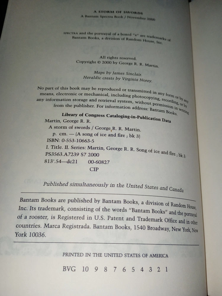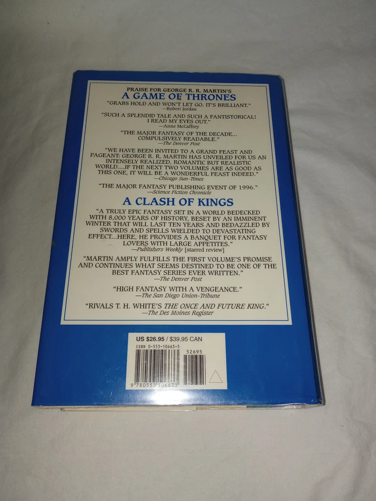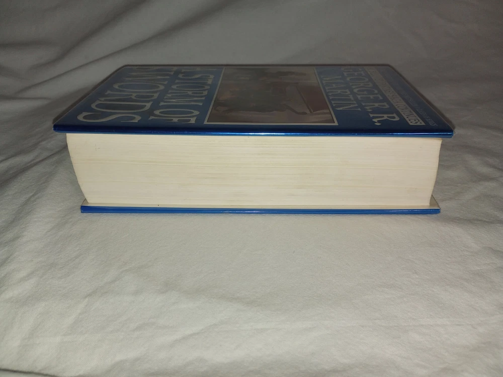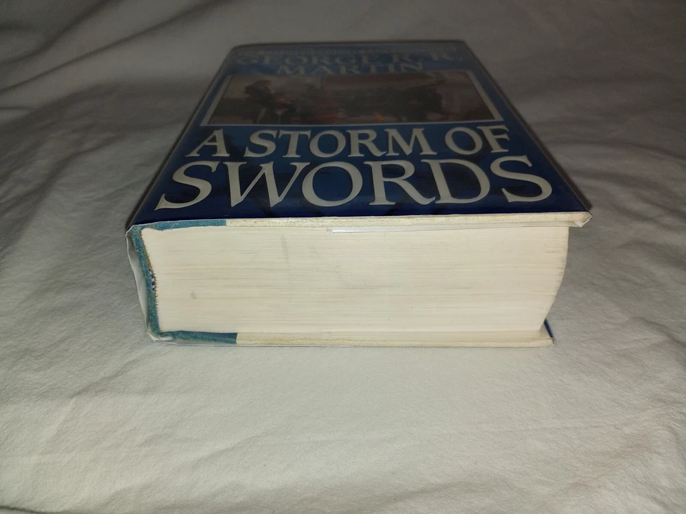 Item Weight:49.5 OzPublisher:Random House Publishing GroupTopic:Science Fiction / Action & Adventure, Action & Adventure, Fantasy / EpicAuthor:George R.R. MartinOriginal Language:Englishgtin13:9780553106633Book Series:A Song of Ice and Fire Ser.Seller Notes:“There is a slight bit of pink coloring on the top of the book's paper. (picture 7)”Genre:FictionItem Width:6.2 inISBN:9780553106633Era:2000sFormat:HardcoverItem Length:9.5 inPublication Year:2000Edition:First EditionType:NovelIllustrator:YesNumber of Pages:992 PagesItem Height:2.2 inBook Title:Storm of SwordsLanguage:English