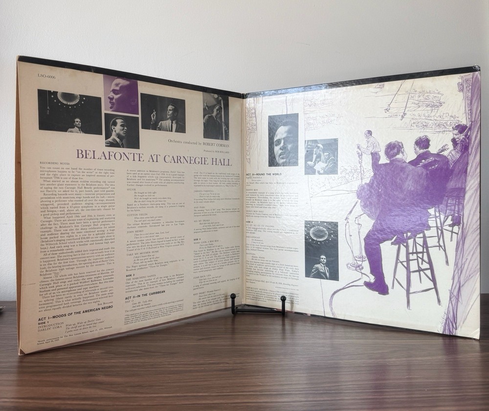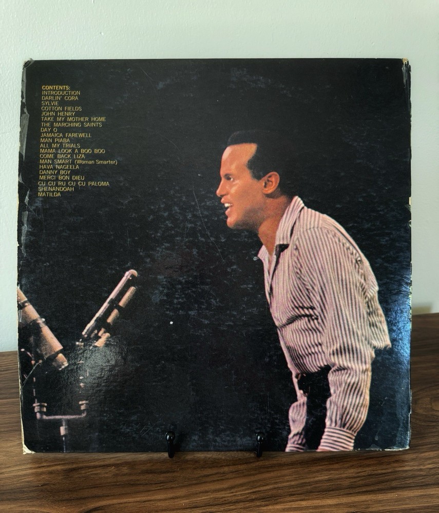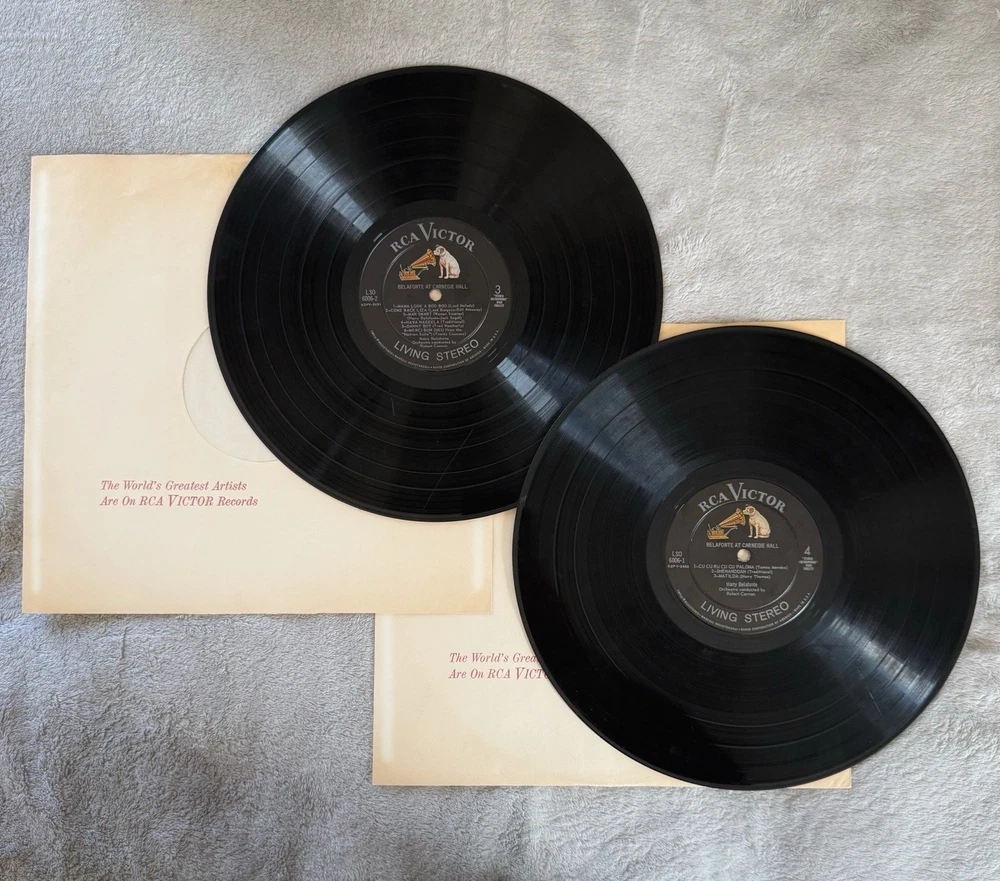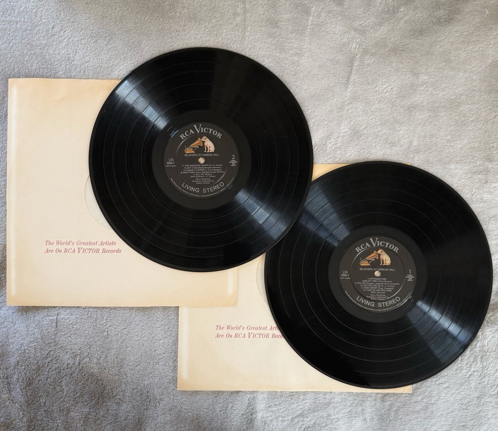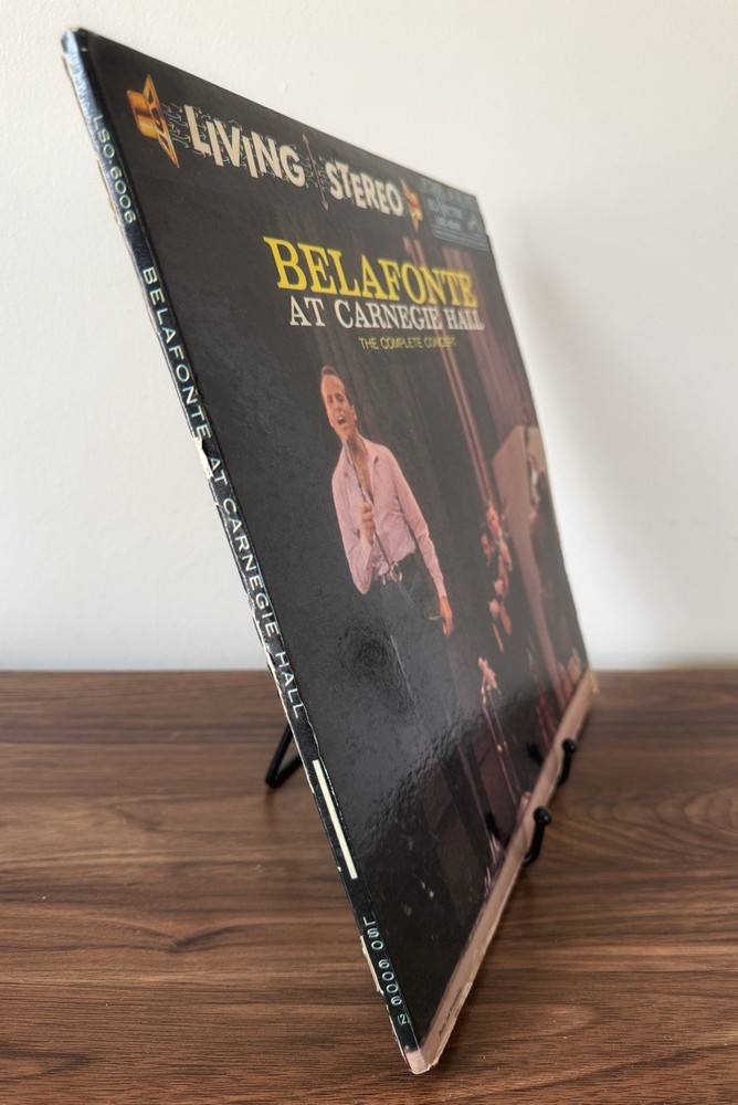 The product is a vintage 1959 Harry Belafonte live double vinyl album at Carnegie Hall. This first edition LP features vocals from the 1950s singer/songwriter and is presented in a cardboard sleeve with the original cover. The record is a 12" LP on the RCA record label, with a stereo audio channel format, making it a valuable collectible for fans of Harry Belafonte and classic music from the era.