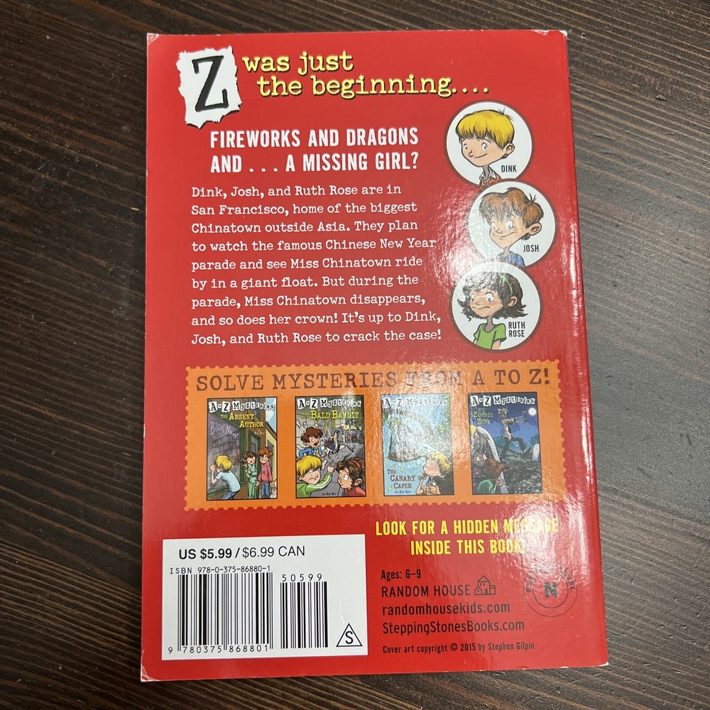 Topic:Law & Crime, Holidays & Celebrations / Other, Non-Religious, Mysteries & Detective Stories, General, People & Places / United States / General, People & Places / United States / Asian AmericanBook Series:A to Z Mysteries Ser.ISBN:9780375868801Publisher:Random House Children's BooksEdition:5gtin13:9780375868801Format:Digest PaperbackItem Weight:3.6 OzPublication Year:2011Item Length:5.1 inItem Height:0.4 inIllustrator:Yes, Gurney, John StevenAuthor:Ron RoyBrand:UnbrandedItem Width:7.6 inLanguage:EnglishBook Title:To Z Mysteries Super Edition #5: the New Year Dragon DilemmaMPN:Does not applyGenre:Juvenile FictionNumber of Pages:144 Pages