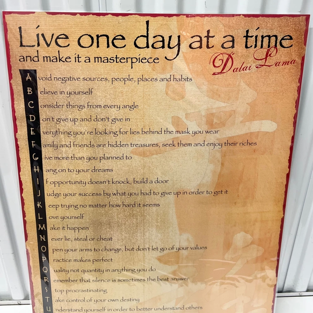 A to Zen Live One Day At A Time Dalai Lama Motivational Cool Wall Decor Art Print Measures: 24inch H X 36inch L The new poster is inside a plastic protector. It has some minor creases at the bottom, but overall it's in good condition. General Safety Warning : intended for Adult Collectors. Products may contain sharp points, small parts, choking hazards, and other elements not suitable for children under 16 years old