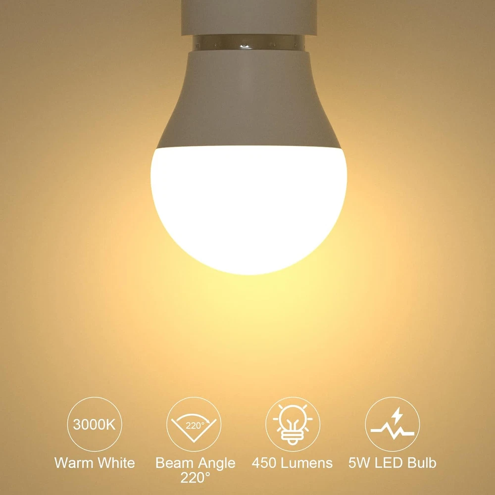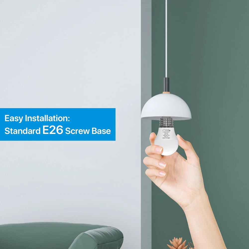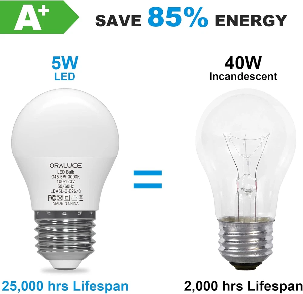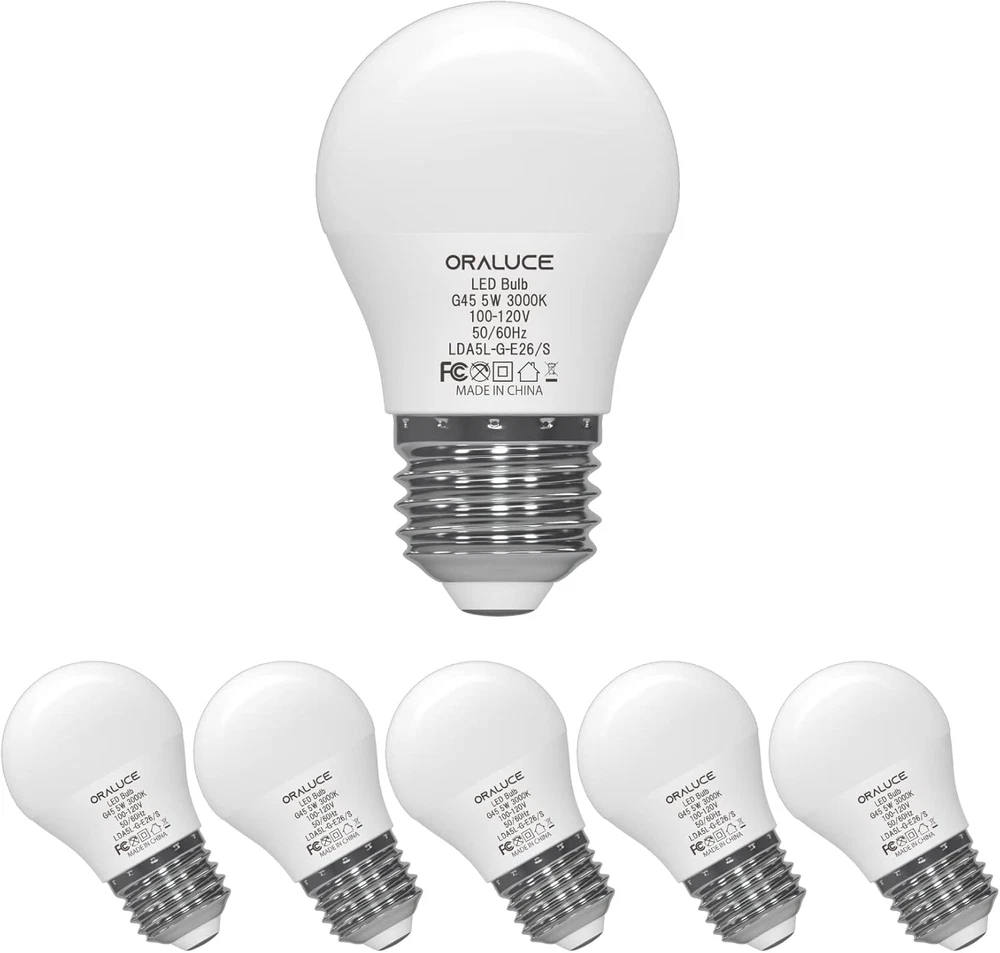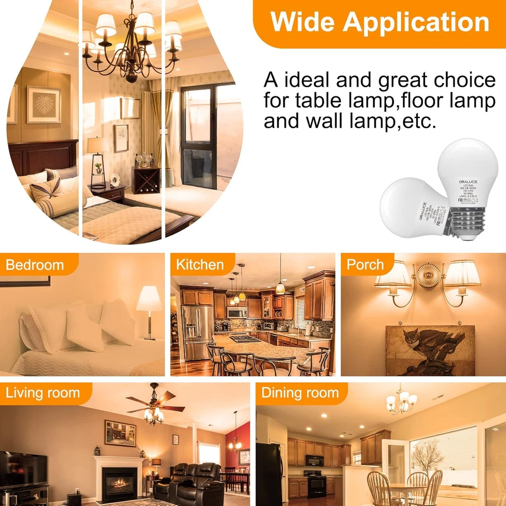 【Compact Size】 Featuring a compact A15 design and a standard E26 base, this bulb is ideally suited for a wide range of fixtures, including ceiling fans, pendant lights, and table lamps, offering a versatile and elegant lighting solution. 【Superior Energy Efficiency】 Upgrade your lighting with our LED bulbs that significantly reduce energy usage, providing a more efficient solution than both traditional incandescent and fluorescent bulbs. 【Prolonged Lifespan】 Benefit from an exceptionally long lifespan with our bulbs, which are designed to minimize the need for frequent replacements, ensuring enduring brilliance and reliability. 【Enhanced Color Accuracy】 Illuminate your surroundings with our high CRI of 82 bulbs, which enhance the true colors of your view. This superior color accuracy brings a vibrant and natural quality to every space. 【Optimal Eye Comfort】 Our bulbs are engineered to provide a stable, flicker-free glow, safeguarding your eyes from strain and creating a more comfortable illumination for reading or work. 【NOTE】 These A15 LED Bulbs are Not dimmable; please DO NOT use them with a dimmer switch. Additionally, it is not recommended to use them in a refrigerator or freezer. Product Description Elegance, Efficiency, and Endurance ORALUCE A15 LED Bulb - Brilliance Redefined Discover the art of illumination with our exquisite A15 LED bulb. Revel in its radiant glow, expertly crafted for optimal brightness and energy efficiency. With unparalleled longevity, this masterpiece redefines the essence of lighting, transcending the mundane to embrace the extraordinary. The video showcases the product in use. The video guides you through product setup. The video compares multiple products. The video shows the product being unpacked. Quality Illumination Dependable Craftsmanship, Notable Excellence A fine example of quality illumination. Thoughtfully constructed with a reliable aluminum substrate, durable LED chips, and robust materials, our bulb offers noteworthy performance and longevity. NO Flicker Non-Flickering led bulbs can bring NO strain to your eyes and protect eyes greatly. Higher CRI With high color rendering index(82+), every thing's color in you home would always remain true and natural. Selectable Color Temperature PRODUCT SPECIFICATION Shape G45/A15 Base 26mm Power Consumption 5 Watts Equivalency 40 Watts Color Rendering Index 82+ Luminous flux 450lm Color Warm White 3000K Package 6 Pieces / box ATTENTION 1. Attention to Base Size: Please be aware that this product features a 12mm base diameter, not the standard 26mm. Ensure you have the correct size before purchasing to avoid any inconvenience. 2.For making sure it is the right product you want, please read the products specifications before buying. 3.For avoiding the risk of electric shock, please make sure electricity is cut off during installation. 4.It is NOT DIMMABLE, so please DO NOT use it with any dimmer switch or dimmable socket. PRODUCT COMPARISON Add to Cart Add to Cart Add to Cart Add to Cart Add to Cart Customer Reviews 4.6 out of 5 stars 207 4.3 out of 5 stars 55 4.5 out of 5 stars 1,445 4.2 out of 5 stars 388 4.1 out of 5 stars 417 Price $9.99 $ 9 . 99 $9.99 $ 9 . 99 $9.99 $ 9 . 99 $12.99 $ 12 . 99 $13.99 $ 13 . 99 Dimmable or not Not dimmable Not dimmable Not dimmable Not dimmable Not dimmable Base size 26mm 12mm 12mm 26mm 26mm Equivalent to incandescent 40 watts 40 watts 40 watts 60 watts 100 watts Color temperature 3000K Warm White 3000K Warm White 3000K Warm White 3000K Warm White 3000K Warm White Brightness 450lm 450lm 450lm 900lm 1200lm Package 6 Pack 6 Pack 6 Pack 6 Pack 6 Pack