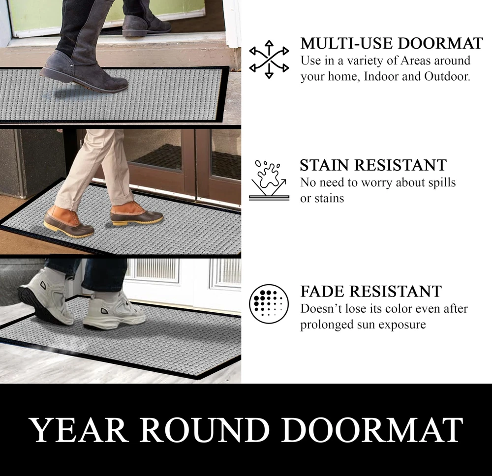 Elevate your entrance with A1HC Polypropylene rubber door mat: Its formidable dirt trapper, super absorbent, and keeps floors clean and safe. The perfect welcome mat for your front door. Dirt-Catcher & Fade-Resistant: The deep grooves of this outdoor mat efficiently trap dirt, mud, and moisture from shoes, helping to keep your floors clean and protected. Crafted with fade-resistant materials, this heavy duty door mat retains its color and appearance even after prolonged sun exposure. Non-Slip Backing & Durability: This doormat features a non-slip natural recycled rubber backing for superior traction, preventing slipping. Designed with high tensile strength, it is tear-resistant and built to withstand heavy foot traffic. The robust pet fiber face is crafted with grooves and durable geometric and floral patterns, ensuring long-lasting performance and resilience. Perfect mat for indoor or outdoor use, this doormat offers both functionality and style. Multi Purpose Mat: Measures 32 inches long x 48 inches wide, Ideal for an outdoor or indoor entrance mat, patio mat, garage mat, garden mat, or winter mat, Kitchen mat, Office mat, Hallway mat, Laundry Room mat providing durable protection for floors against dirt, moisture, and debris in high-traffic areas. Eco-friendly and Pet Friendly: Our mat, made from high-quality Polypropylene, withstands all weather, dries quickly, and retains vibrant colors. Use it as a boot mat, shoe mat, entry mat, or patio mat for reliable protection and cleanliness indoors or outdoors.The material is likely scratch-resistant or durable enough to withstand pet claws. Effortless Maintenance: Keep your entryway mat fresh and clean with ease. Sweep or vacuum regularly, shake off debris, rinse with a garden hose outdoors,for hassle-free cleaning. Enjoy a consistently tidy entrance without the hassle.