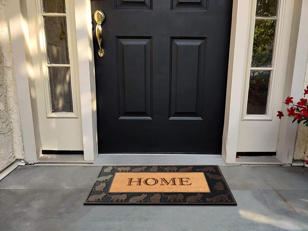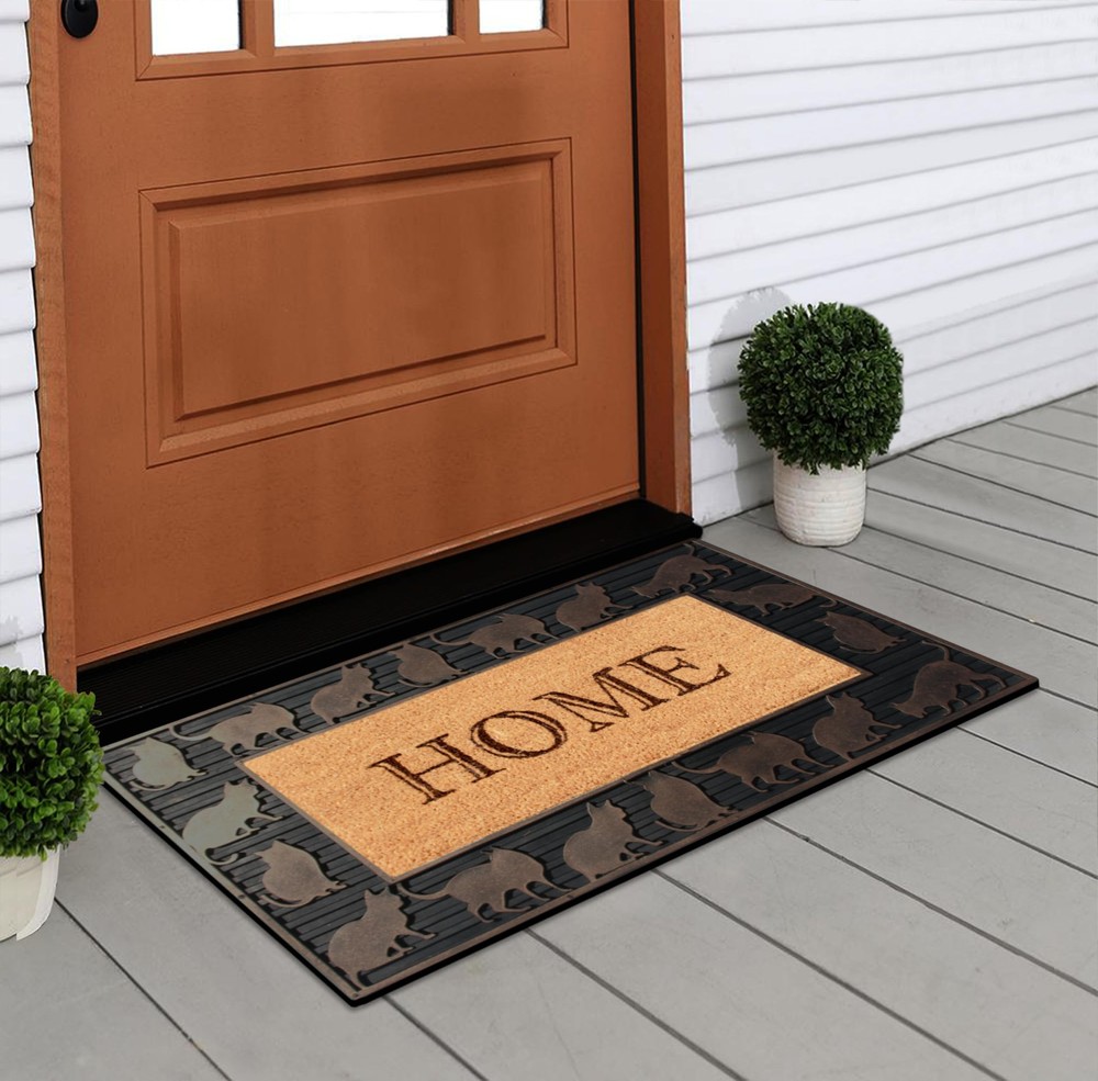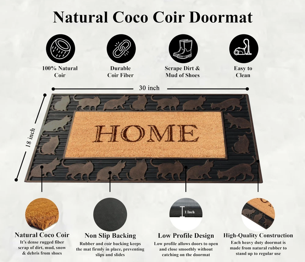 More than a decorative enhancement this rubber & coir molded doormat is made With a heavy rubber backing that anchors it in place while you brush dirt & debris from shoes & boots. The tufted coco-fiber facilitates scrubbing soles clean. Keeps your floor clean when you decorate your entryway with this beautiful doormat, which includes a sturdy rubber backing to help in keep the mat in place & prevent slips. The attractive design of this Coir Door Mat creates a welcoming entrance for your guests & the durable coir material holds up to lots of foot traffic. This Welcome Mat Recommended for outdoor use in covered areas. Vacuum or shake the mat regularly for longer life. NEWLY DEVELOPED RUBBER AND COIR DOOR MAT: This is a completely newly designed door mat, suitable for both single and double doors. The large size door mat is made of Natural coir fiber and high quality rubber. This coir door mat has a large coir area to clean and wipe your shoes which keeps your house clean. These door mats are stronger and more durable lasting thrice as long as regular door mats. Each outdoor rug is QC inspected for 20 quality check points. HEAVY-WEIGHT RUBBER BORDER DOOR MAT: The heavy rubber backing makes sure the doormat in anchored to its place and does not get blown away by wind or tear apart by aggressive wiping. SUPER TOUGH DOOR MAT: constructed with thick coir bristles on the topside with rubber base, the doormat is built tough by nature; its strong bristles create a wiping area and the rubber base adds to the sturdiness. This premium outdoor rug will help stop dirt, debris, moisture and other particles from being tracked into your home and will last at least 3 times longer than regular door mats. PLACE WELCOME MAT BEFORE EVERY EXTERIOR DOOR: Use this welcome mat on a patio, in a garage, laundry room, entryway, and anywhere there is high traffic from outside. Recommended to be used in covered outdoor areas. PERFECT SIZE DOORMAT FOR YOUR LARGE ENTRYWAY: Front doormat measures 18" x 30" and is 0.6" thick to allow your door to easily pass over the mat without getting stuck. This outdoor mat is ideal for both single and double door entrances.