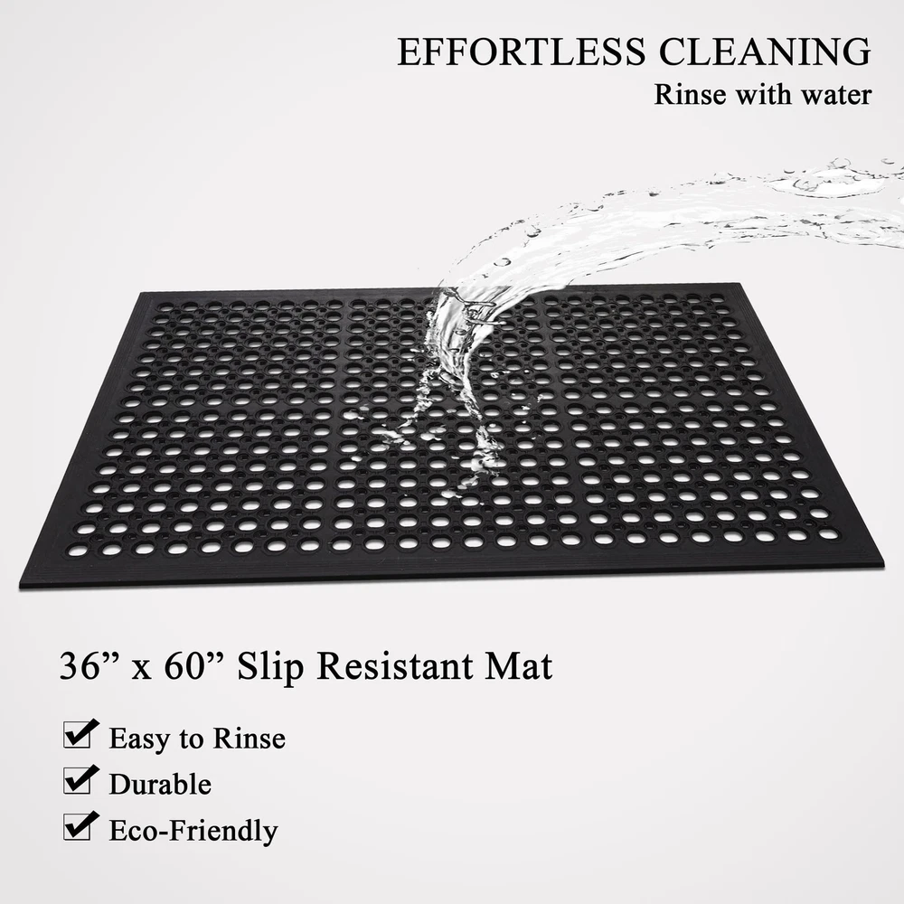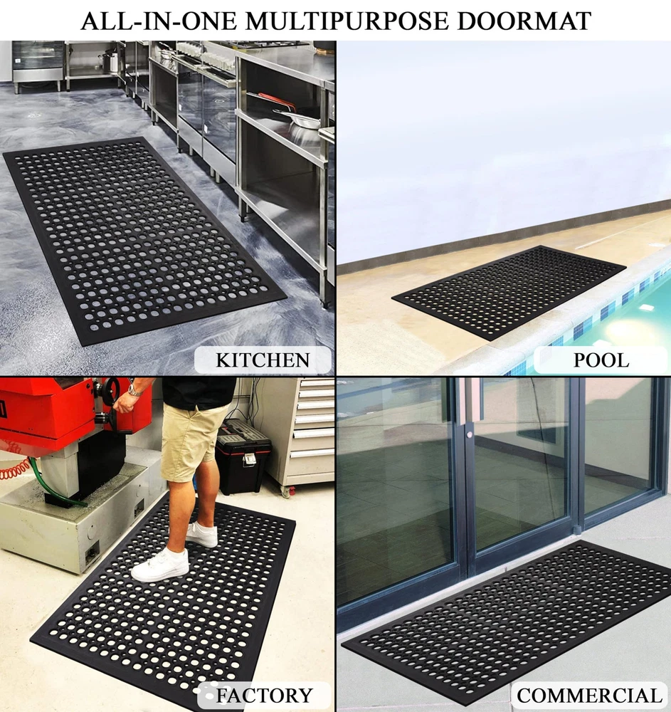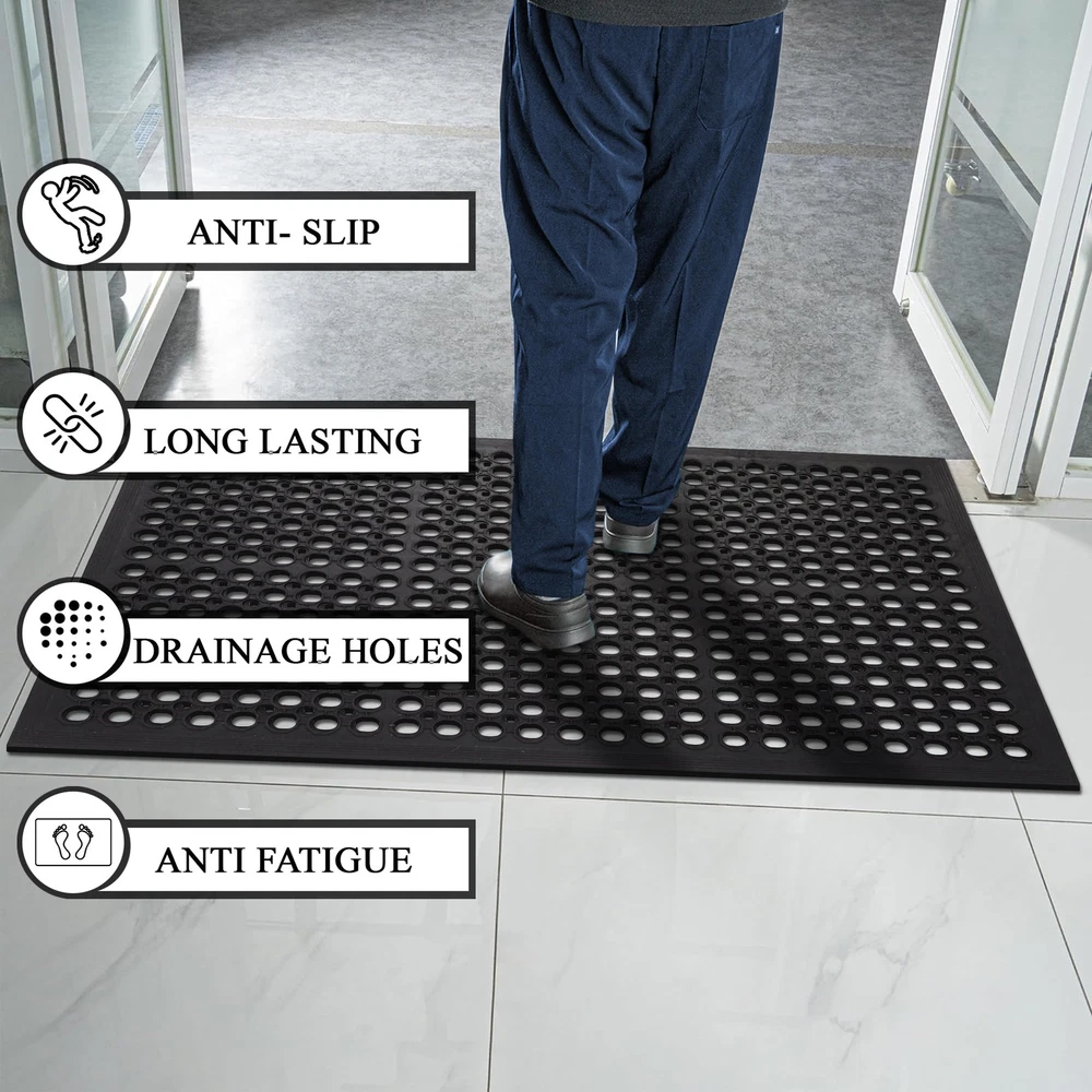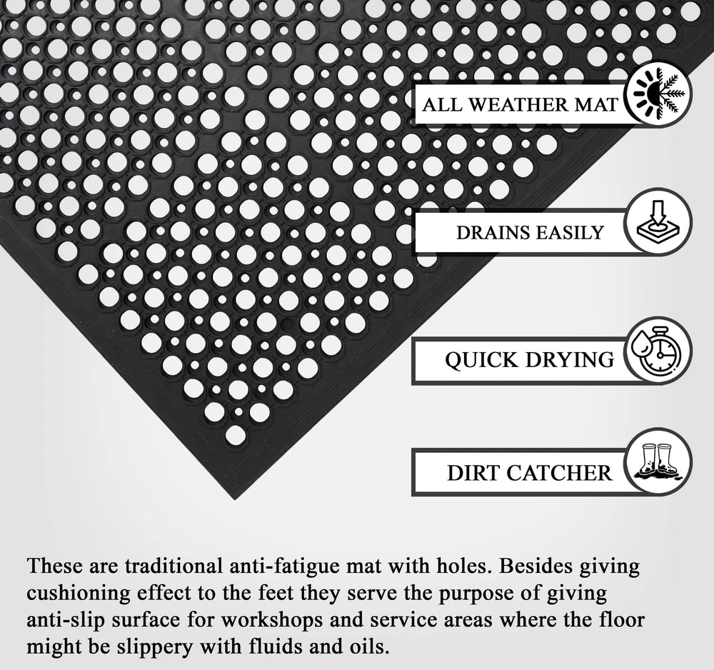 Upgrade your standing experience with A1HC Rubber Anti-Fatigue Mat for Kitchen, Restaurant, Business, and Industrial areas. Enjoy long-lasting comfort and relief indoors or outdoors. Functionality, durability, and style for clean, safe, and sophisticated entryways. Enjoy long-lasting comfort and relief. Heavy-Duty Commercial Mat: Our rugged heavy duty rubber floor mat stands up to the toughest conditions, perfect for high-traffic areas.With excellent durability, it's an ideal commercial doormat, able to handle water, snow, salt, and slush. Drainage-Optimized Commercial Kitchen Mat: Engineered with drainage holes, this mat ensures quick drying - a non-negotiable for any commercial kitchen mat. Keep your cooking space clean, safe, and hygienic. Anti Fatigue Versatile Mat: The thoughtful design makes this provides relief during long standing tasks making it ideal for a wide range of settings including restaurant mats, kitchen mats, gym mats, bar mats, and more, ensuring dependable performance in diverse environments. Whether you need a robust bar mat or a safety-oriented gym mat, our rubber floor mat adapts to your business requirements with ease. All-Weather Performance: Whether indoors or outdoors, this rubber utility mat is perfect for any type of flooring, from entryway Rubber Floor mats and garage mats to laundry room mats and patio mats. This mat effectively cleans off shoes and traps dirt and debris with its perforated hole design. Durable and Slip Resistant: Crafted for long-lasting use, this rubber mat is built to withstand daily wear and tear, ensuring reliable performance over time. It also features a slip-resistant design for added safety, providing stability and traction in high-traffic areas.
