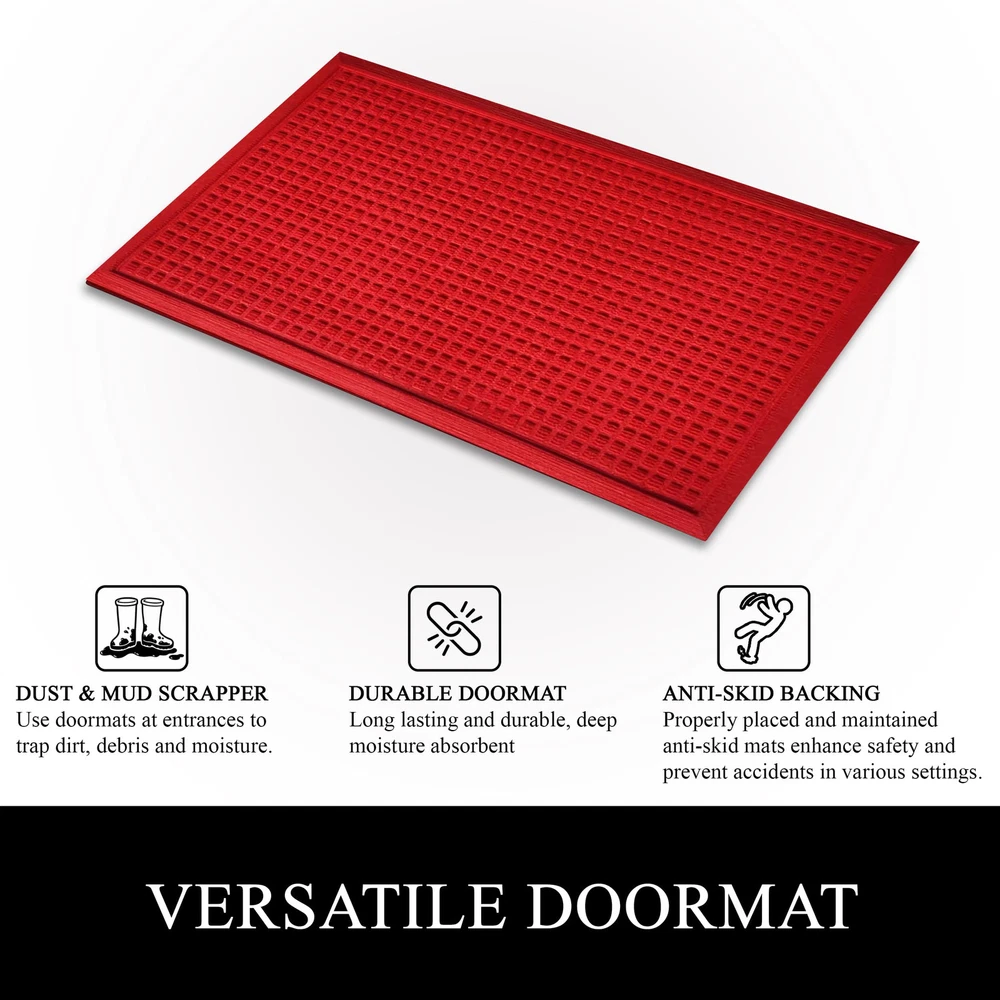 The A1HC Door mat is a welcome mat for your front door that is a formidable dirt trapper, capturing dirt, mud, and other debris. No more worrying about unwanted messes inside your place. This Doormat is designed to keep your floors clean and pristine. Its super absorbent properties make it an excellent front door mat as it quickly soaks up excess moisture, ensuring your floors stay dry and safe. Elevate your entrance with the A1HC Indoor/ Outdoor door mat, the perfect welcome mat for your front door. ALL WEATHER PERFORMANCE WITH SUPERIOR DIRT AND MOISTURE ABSORBING DOOR MAT : These highly absorbing PP door mats are engineered to absorb water, mud, and moisture. The deep grooved poly surface removes dust, pollens and captures allergens keeping your entryways clean and dry, whether it is raining, snowing, or muddy outside, these door mats can handle any weather condition, supplying a reliable barrier against dirt and moisture. VERSATILE INDOOR-OUTDOOR USE : These door mats are suitable for both indoor-outdoor use at the main entrance , patios, kitchens, mudrooms, garages, bar counters, and any high-traffic area where you want to keep dirt and moisture at bay. The mats are otherwise soft and pet friendly, who also love them. SLIP-RESISTANCE SURFACE AND BEVELLED EDGES: The textured surface provides excellent traction, reducing the risk of slips and falls and ensuring safety for your family and guests. These are also pet friendly. Ensure the mat lies flat before using. To flatten, roll the mat in the opposite direction a few times until it falls flat. It is suggested after unpacking to keep the rubber door mat outdoors in direct sunlight for a few hours. EASY TO CLEAN AND MAINTAIN : Cleaning the mats is a breeze - simply shake off debris or hose them down to keep their pristine appearance. They come in stylish Design Options, Choose from a variety of colors and patterns to complement your home's décor while still enjoying the benefits of superior performance. LONG - LASTING INVESTMENT: With their robust construction, these PP door mats are built to last, providing long-term value, and saving you money on costs. This can be an ideal Gift to your friends and family .