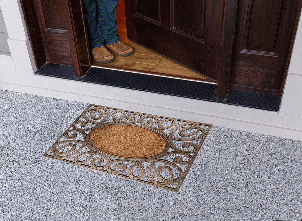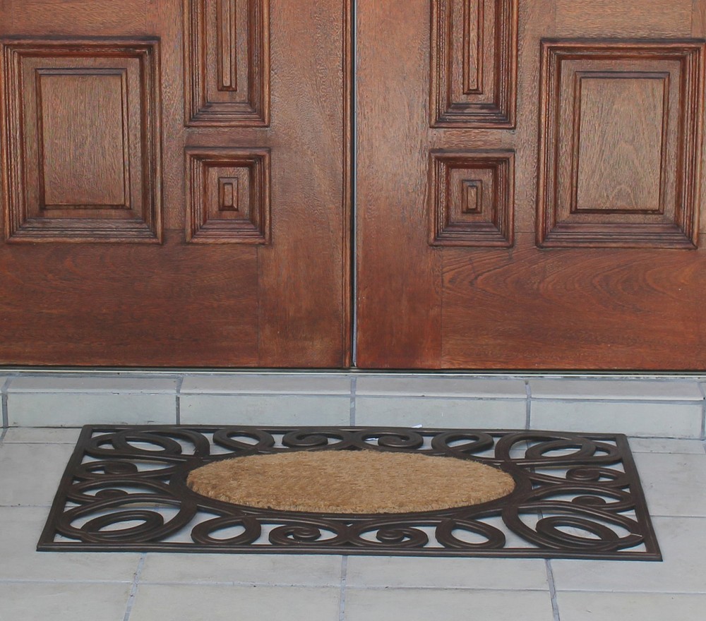 More than a decorative enhancement this rubber and coir molded doormat is made with a heavy rubber backing that anchors it in place while you brush dirt and debris from shoes and boots. The tufted coco-fiber facilitates scrubbing soles clean. 100% COCONUT COIR FIBER - Natural fiber face provides the perfect surface for guests to wipe their shoes before entering your home. HEAVY-WEIGHT MOLDED RUBBER BORDER firmly anchors the mat in place. PLACE BEFORE EVERY EXTERIOR DOOR - Use on a patio, in a garage, laundry room, entryway, and anywhere there is high traffic from outside.Use in covered outdoor areas. PERFECT SIZE FOR YOUR LARGE ENTRYWAY - Doormat measures 38" X 23" and is 0.6" thick to allow your door to easily pass over the mat without getting stuck. DECORATIVE DESIGN: adds a unique touch to your front door or back door while being very functional.