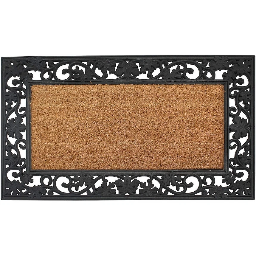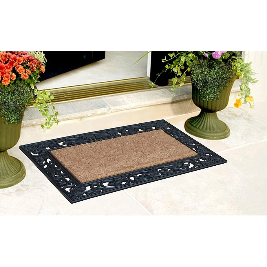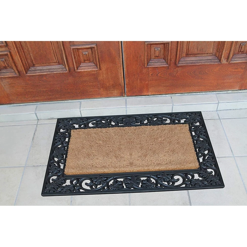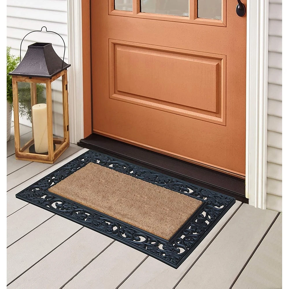 More than a decorative enhancement this rubber & coir molded doormat is made With a heavy rubber backing that anchors it in place while you brush dirt & debris from shoes & boots. The tufted coco-fiber facilitates scrubbing soles clean. 100% COCONUT COIR FIBER: Natural fiber face provides the perfect surface for guests to wipe their shoes before entering your home. HEAVY-WEIGHT MOLDED RUBBER BORDER firmly anchors the mat in place. PLACE BEFORE EVERY EXTERIOR DOOR: Use on a patio, in a garage, laundry room, entryway, and anywhere there is high traffic from outside. PERFECT SIZE FOR YOUR LARGE ENTRYWAY: Doormat measures 38" X 23" / 18" X 30" and is 0.6" thick to allow your door to easily pass over the mat without getting stuck. DECORATIVE DESIGN: Adds a unique touch to your front door Free Shipping Over $49.99* Details A1HC Rubber and Coir Large Heavy-Duty Outdoor Doormat Product Description: More than a decorative enhancement this rubber & coir molded doormat is made With a heavy rubber backing that anchors it in place while you brush dirt & debris from shoes & boots. The tufted coco-fiber facilitates scrubbing soles clean. 100% COCONUT COIR FIBER: Natural fiber face provides the perfect surface for guests to wipe their shoes before entering your home. HEAVY-WEIGHT MOLDED RUBBER BORDER firmly anchors the mat in place. PLACE BEFORE EVERY EXTERIOR DOOR: Use on a patio, in a garage, laundry room, entryway, and anywhere there is high traffic from outside. PERFECT SIZE FOR YOUR LARGE ENTRYWAY: Doormat measures 38" X 23" / 18" X 30" and is 0.6" thick to allow your door to easily pass over the mat without getting stuck. DECORATIVE DESIGN: Adds a unique touch to your front door or back door while being very functional. USE IN COVERED OUTDOOR AREAS ONLY. DO NOT EXPOSE DIRECTLY TO SUNLIGHT OR RAIN.