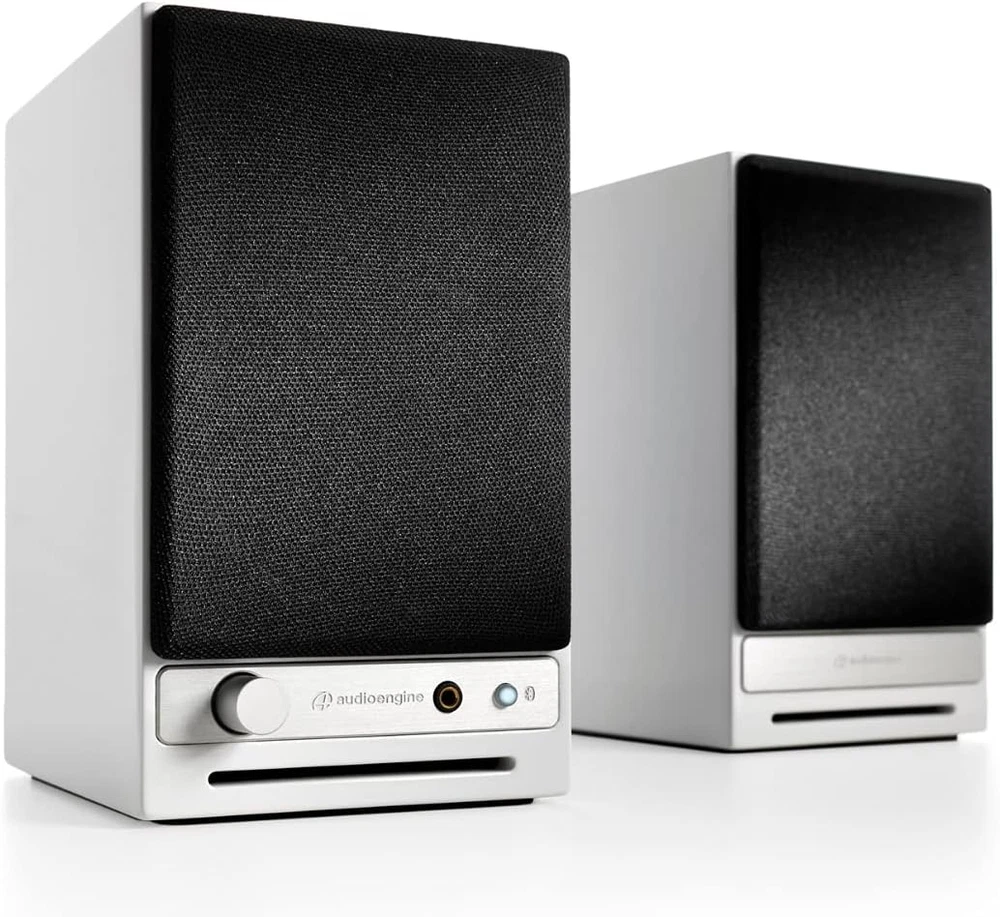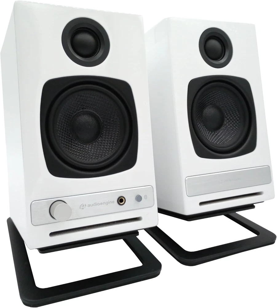 A2 HD White Bluetooth Desktop Speakers and DS1M Metal Stands