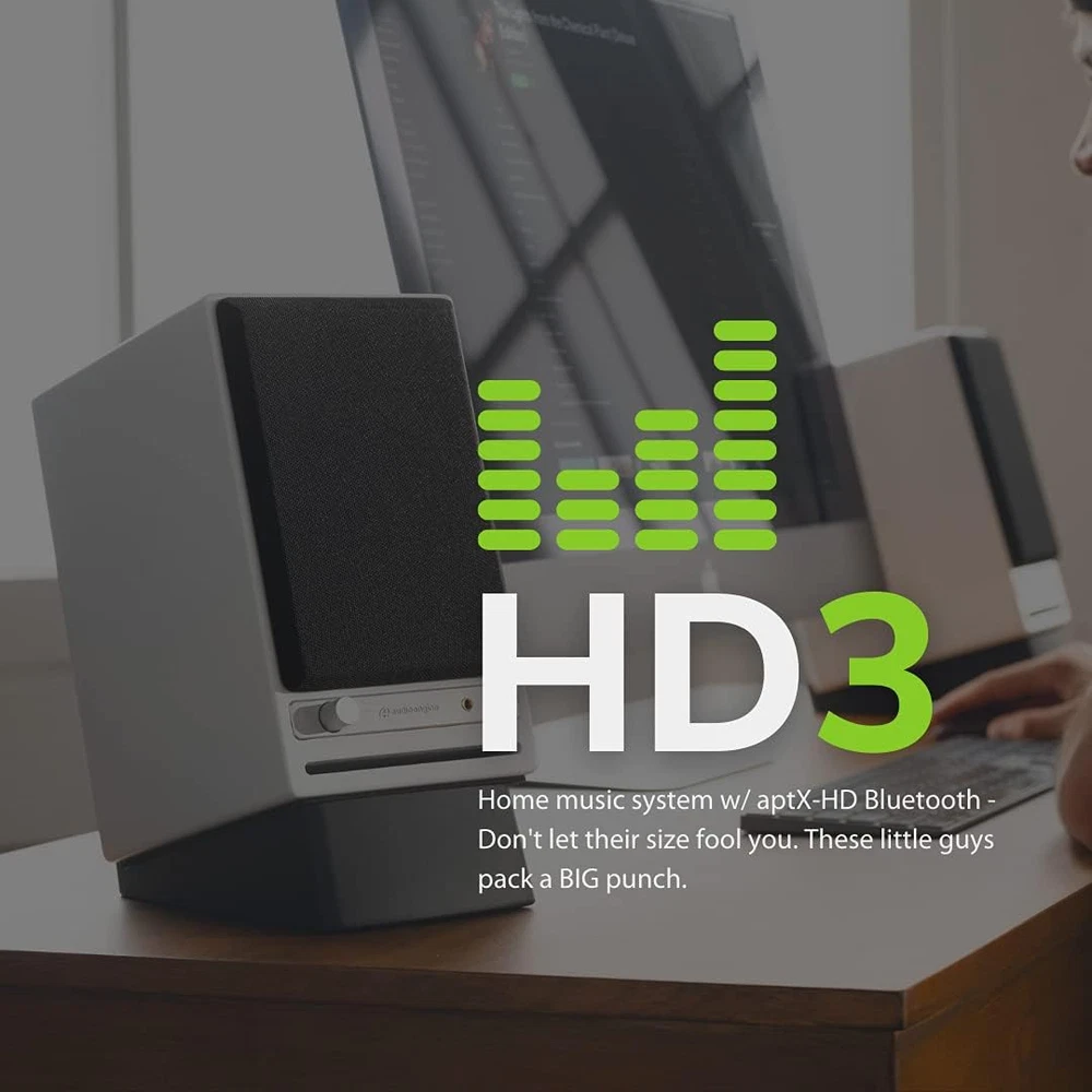 Unit Count: 2.0 Count Model Name: A2-HD UPC: 313043125198 Country of Origin: China Connectivity: Does not apply Power Source: AC Number of Items: 1 Package Type: Standard Signal-to-Noise Ratio: 95 dB Speaker Size: 2.75 Inches Included Components: HD3 Wireless Home Music System and DS1M Metal Desktop Speaker Sta Audio Driver Type: Dynamic Driver Model: Does not apply Type: Does not apply Number Of Circuits: 3 Style: ENHANCE YOUR AUDIO - HD3, DS1M Number of Power Levels: 1 Control Method: Touch Surround Sound Channel Configuration: 3.0 Water Resistance Level: Not Water Resistant Series Number: 2 Is Waterproof: FALSE Controller Type: iOS, Android Wireless Communication Technology: Bluetooth Mounting Type: Tabletop Mount Speaker Type: Bookshelf Speaker Maximum Output Power: 60 Watts Color: White Number of USB 2 Ports: 1 Includes MP3 player?: No Bluetooth Range: 3E+1 Meters Warranty Type: Limited Compatible Devices: Smartphone, Tablet, Laptop, Desktop, Television Impedance: 10000 Ohm Audio Output Mode: Stereo Recommended Uses For Product: For Computers Frequency Response: 65 Hz Age Range (Description): Adult Item model number: HD3 Special Feature: Hi Res Audio Indoor/Outdoor Usage: Indoor Specific Uses For Product: For Computers Brand: Does not apply Material: Wood gtin13: 313043125198 Connectivity Protocol: Bluetooth Connectivity Technology: Bluetooth