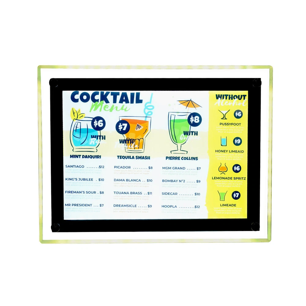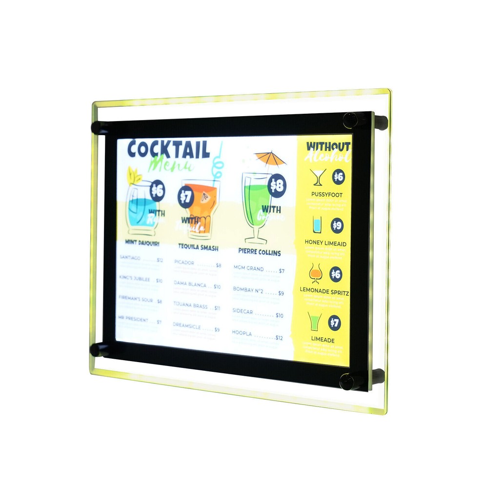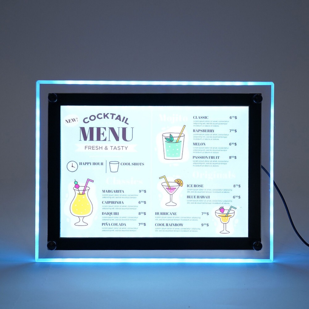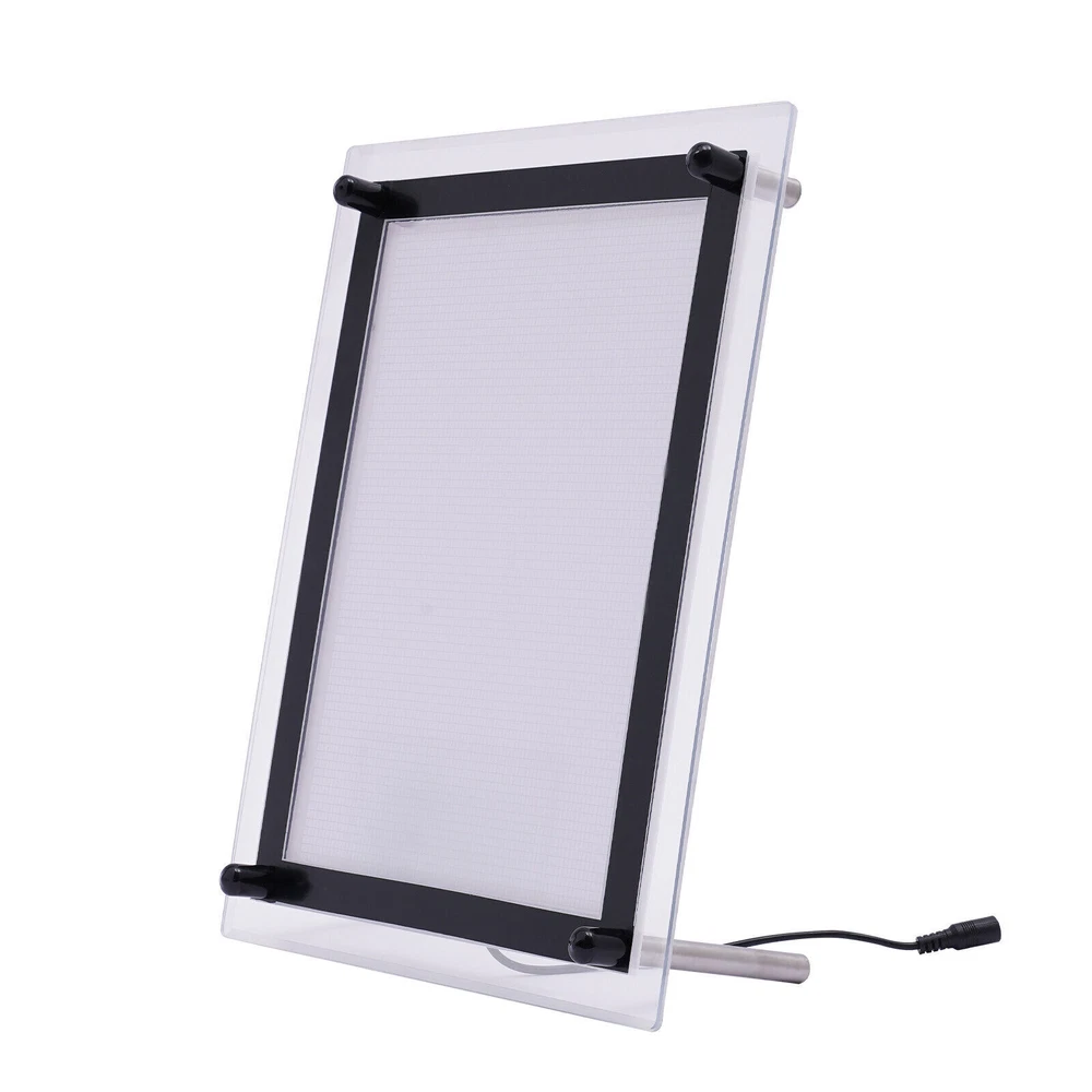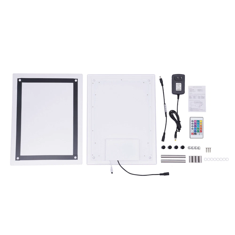 Specification Material: Iron, Acrylic, Hardware Color: Black, Clear Process: Chrome Plated Assembly Required: Yes Shape: Rectangular Style: Modern Mounting Type: Wall Mount Frame Type: Poster Frame Charging Method: Power Cord Plug Standard: US Standard Light Source: RGB LED(Included) Power Consumption: 18W Working Temperature: -20~60℃/-4~140℉ Output: Three CMOS Drain+Open Output Max. Load Current: 2A Each Color Supply Voltage: DC 12V Connecting Mode: Common Anode Charger Voltage: 110-240V 50/60Hz 1.0A Charger Output: 12V 2.0A Connection Cable Voltage: 12-24V Applicable Paper Size: A4 Product Size: 37.7*29cm /14.8*11.4 in Package Included 1 * LED Backlit Poster 1 * Adapter 1 * Connection Cable 1 * Remote Control(Battery Included) 1 * English Manual All Accessories for Installation A4 LED Light Box Poster Frame Indoor Advertising Illuminated Projecting Sign Description A4 LED Light Box Poster Frame Indoor Advertising Illuminated Projecting Sign Description Our LED backlit poster is ideal for commercial promotions and attracting attention. Its magnificent artwork helps you deliver compelling promotional messages that will drive more traffic to your shopping center or event. The simple poster change makes it easy to use and quick to master even for novices. This would be the ideal display board to replace a conventional chalkboard! Key Features ①Sturdy and Durable✔️ : This product is mainly made of iron and acrylic, with high hardness, high wear resistance performance, and long service life. The chrome-plated hardware screws have anti-corrosion and anti-rust properties, thus enabling the product to be assembled more tightly and firmly. ②Powerful Tool✔️ : With this eye-catching poster, which lights up your message like a neon sign and attracts the attention of customers/viewers day and night, your shop will have more traffic. It is ideal for commercial promotion and attracting attention. You can also let your favorite movie posters shine in the new light at all times with this amazing backlit frame. It will help you add a unique touch to your bedroom and show everyone your elegant attitude toward life. ③ Excellent Vision✔️ : The large size of the display panel (11.3*7.87 inches) can give you an ultra-wide visual experience. The design of the scribing light guide plate makes it have a high color rendering and uniform brightness. At the same time, the use of RGB color LED lights can also bring you a richer color viewing experience. ④ Versatility✔️ : You can adjust the mode(Flash, Strobe, Fade, Smooth), speed, and light(16 colors) you want by using the remote control according to the usage environment and thus making your billboard more unique. ⑤ Stylish Appearance✔️ : The clear edges outside the black frame present a crystal-like and modern texture and the colorful lights make it more technological. It is not only a practical billboard but also an ideal decoration. ⑥ High Stability✔️ : The two thickened extension bars at the bottom make the product stand stably on the bar counter, thus providing you with a more stable display. ⑦Easy to Store✔️ : The compact size (11.69*8.27 inches), ultra-thin thickness, and removable stand design make it easy to store in a small drawer. ⑧User-friendly Design✔️ : You only need to unscrew the four fixing screws to change the poster at will, so even a novice can quickly master how to use it. In addition, the simple product structure, complete installation parts, and English manual can help you to quickly and accurately install it. It also has two display methods, standing display and wall display, providing a variety of ways to display your posters. ⑨Energy Saving✔️ : High-quality energy-saving LED lights are up to 85% more energy efficient than halogen lights. The low energy consumption(18W) makes it consume less electricity but has a high brightness output that can save you money on your electricity bill. Details 💛Wire Protection Cover: The wire protection cover with an opening at the bottom effectively prevents rainwater from entering, so you can use it outdoors with confidence. 💛 Rounded Corners: Compared with square corners, rounded corners design can effectively protect your skin from accidental bruises, thus providing you with a higher level of safety. Application This product is very suitable for movie theaters, promotions, retail stores, restaurants, art displays, trade shows, banks, hospitals, libraries, counters, offices, companies, menu boards, jewelry stores, hotels, studios, etc. for exhibition/advertising/decoration. Specification Material: Iron, Acrylic, Hardware Color: Black, Clear Process: Chrome Plated Assembly Required: Yes Shape: Rectangular Style: Modern Mounting Type: Wall Mount Frame Type: Poster Frame Charging Method: Power Cord Plug Standard: US Standard Light Source: RGB LED(Included) Power Consumption: 18W Working Temperature: -20~60℃/-4~140℉ Output: Three CMOS Drain+Open Output Max. Load Current: 2A Each Color Supply Voltage: DC 12V Connecting Mode: Common Anode Charger Voltage: 110-240V 50/60Hz 1.0A Charger Output: 12V 2.0A Connection Cable Voltage: 12-24V Applicable Paper Size: A4 Product Size: 37.7*29cm /14.8*11.4 in Display Size: 28.7*20cm /11.3*7.87in Gross Weight: 2kg/ 4.41 lbs Net Weight: 1.8kg/ 3.97 lbs Package Size: 45*25*6 cm/17.72*9.84*2.36 in Package Included 1 * LED Backlit Poster 1 * Adapter 1 * Connection Cable 1 * Remote Control( Battery I ncluded) 1 * English Manual All Accessories for Installation Notes This package does not include the advertisement poster. Products with electrical plugs are designed for use in the US. Please check compatibility before purchasing. Please read the operating manual completely before use. And pay particular attention to the safety instructions included. Please allow the slight color difference caused by the shooting light and the 1-3 cm error due to manual measurement, and make sure you do not mind before ordering. Pay