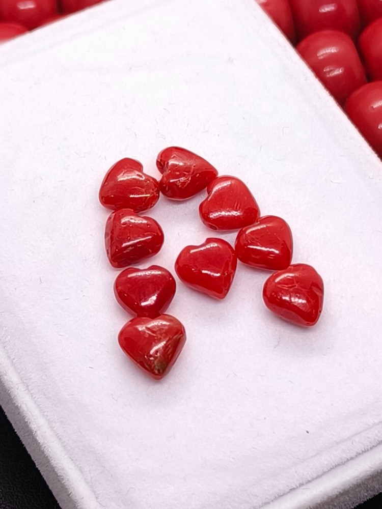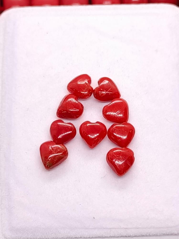 Discover the vibrancy and allure of our AAA Quality Red Coral Heart Shape Cabs, an exquisite selection for making jewelry. Sourced from the rich cliffs of Italy, each piece showcases the natural beauty of coral in a stunning heart cabochon form. The opaque gemstone, boasting an eye-clean clarity grade, measures 7/8mm in length and weighs 16 Crt, composed of nine individual pieces that exude a warm, orange hue. Crafted with excellent cut grade precision, these natural, non-enhanced coral gems are a testament to Italian craftsmanship. The polished cabochons, unbranded and eye-catching, are ideal for creating bespoke jewelry or adding to a discerning collector's array. With the inclusion of IGI certification, these coral cabs are a genuine and luxurious addition to any gemstone collection.