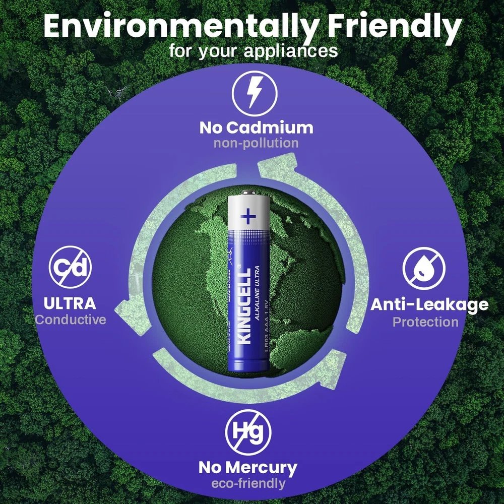 【KINGCELL 36 Pack AAA Batteries】Bundled in a recloseable package for easy storage and organization.Meeting the daily needs of families. 【Dual Leakproof Technology】Multi-seal anti-leakage design can effectively prevent leakage, don‘t have to worry about corrosion damage to your equipment, has a strong protective effect 【10-Year Shelf Life】KINGCELL AAA Batteries High performance battery technology can make KINGCELL maintain power for up to 10 years in proper storage. 【Ultra Long-Lasting】Higher capacity and more cost-effective than regular batteries.No need to replace batteries frequently 【Widely Used】KINGCELL AAA batteries are perfect for various devices, including remotes, flashlights, kid toys, wireless keyboards, and more. 【Environmentally Friendly】Free from harmful substances such as mercury and cadmium, making them safe for your family and the environment. By choosing KINGCELL Batteries, you're making a sustainable choice while enjoying reliable power.