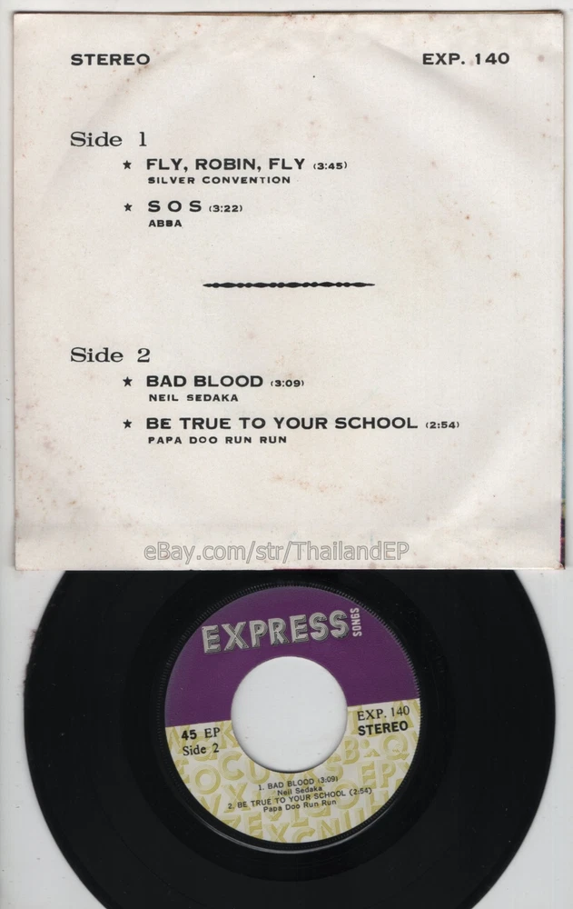 Welcome to The World of ""Thailand Vinyl Records"".Very rare and beutiful picture of cover. Check everyday . This item is for a true 7" single collector. It was printed and sold locally as limited EP back in the early 70's. Only few copies were spread outside Thailand. Most professional record collectors know that it is scarce nowadays and is absolutely a collector's item. If you know a UK magazine called RECORD COLLECTOR then you must have read many articles mentioning THAILAND EP and this is it !!! Here is your chance to own one-of-a-kind piece of Asian's 7" single history. Description Records !!! DETAIL SONG and ARTIST !!! Side A: A1 = Silver Convention - Fly, Robin, Fly / A2 = Abba - S O S Side B: B1 = Neil Sedaka - Bad Blood / B2 = Papa Doo Run Run - Be True To Your Scchool Label&Catalogue number : : EXP140 Country of release : THAILAND Condition (Sleeve/Disc) : MINT / EX and pls see picture too. Shipping I am seller in Thailand not USA.So I can not ship 4$ as policy pls understand this real rate from oversea . Price for shipping(Airmail )&Packaging to worldwide only US 14.99 USD .Except Asia and JAPAN only 14.99 USD. You can save cost for combine shipping only 3 USD$ per each. 2xEP=17.99 USD$ , 3xEP=20.99 USD$ . My package very safety by big cardboard don't worry about your's EP/PS/LP. Time delivered 21-45 days . ***All item : have tracking system no need add money*** **For normal shipping (Airmail).Time delivery to ITALY maybe use 1-2 Months, France use 1-2 Months.But Don't worry item will arrived to you sure!!.For fastest and High value you can use Express Mail Service cost for1 EP =39 USD.EP will arrived to you within 5-7 Days. ***All shipment have fully tracking system *** Payment PAYMENT : I accept the follow payment by eBay managed , . My ID eBay provide by eBay .Account will be provide at the end auction.Charges to be covered by winner. If you have question pls email to me anytime i can answer immediatly. I have many EP,PS 7" Thailand Pls Click => View seller's other items Check my feedback , I care and honest all customer.I welcome 0 feedback but contact me first if you will bidding. Good Luck !!!! and Enjoy . 45 RPM / EP/ LP Grading Scale: Mint /NM/ Excellent(VG++) /VG+/ VG /G+ /Good(G) / Fair / Poor / Bad (According Record Collector Magazine (UK))