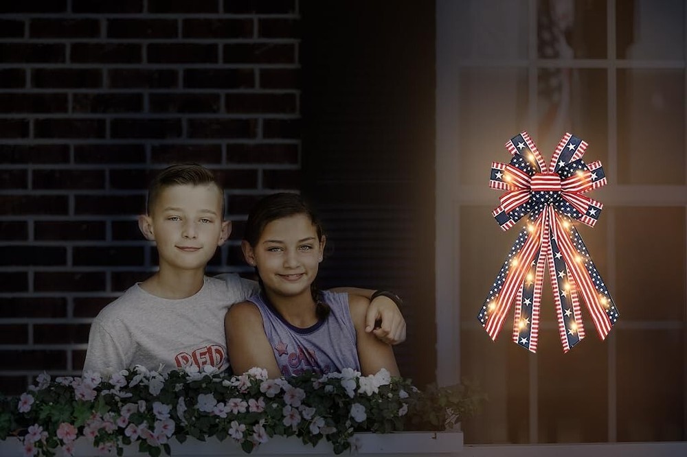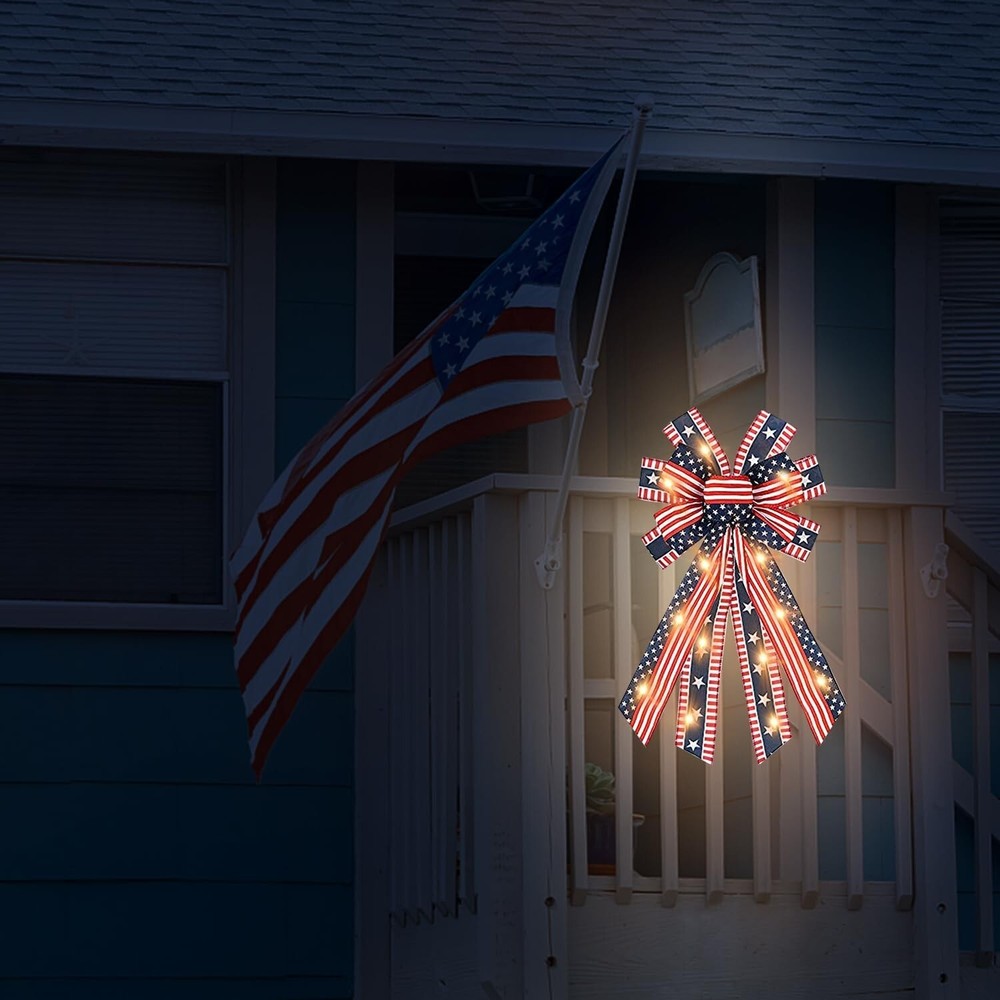 Patriotic style bow: you will get 1 piece of 4th of July LED patriotic star wreath bow, which is designed to be multilayered and three-dimensional, featuring an atmosphere of rejoicing and festivity and bringing you lots of fun to your July 4th party. Patriotic Tree Topper Bow Material: This decorative wreath bow is made of premium plaid cloth, with big bowknot shape, simple but fashion, durable and handmade, lightweight and long-term for you to apply, also not easy to break or fade. Appropriate dimensions: This Veterans Day bow measures 11.42 inch wide and 20.87inch long, which is large and prominent, suitable as centerpiece decoration. Red Blue White Stripe Bows Easy to Use: take out the Memorial Day America flag wreath bows, organize the details, you can restore perfection. Put down the ribbon, then put it on the door, Ideal hanging accessories for archway or wall while Veteran's Day, Christmas,Thanksgiving, Memorial Day, 4th of July, Independence Day Decorations. Can be used for prom, party, church meetings, dancing party, summer picnic, wedding or any other special soiree decoration. Farmhouse Large Gift Bow Wide Application: DIY yarn ornament bows are suitable for kinds of occasions, can be widely applied in 4th of July party or activities, home decors,attach the bow to wreaths, arches, stairways, chairs and other DIY craft projects.Use and satisfy your various decoration requirement in daily life, you can also share them with others.