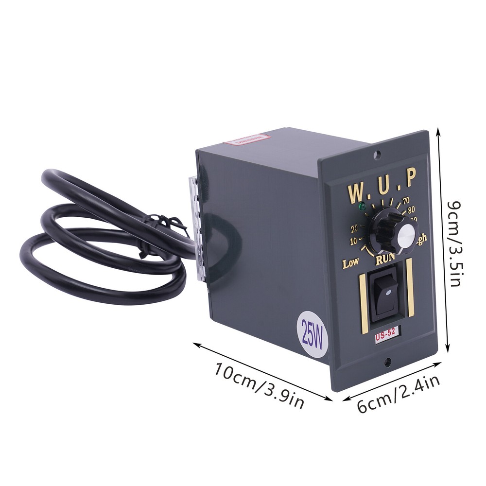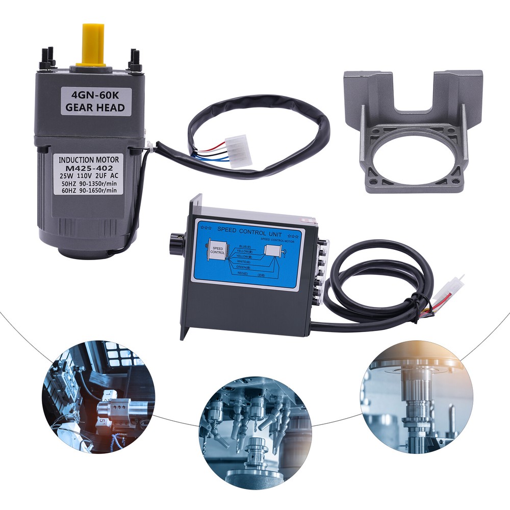 AC 110V Electric Gear Motor Variable Speed Reduction Controller 1:60 90-1350 rpm Description Electric motors are crucial for the operation of equipment. Our 25W gear motor uses a variety of high-quality materials and exquisite processes, with high torque(8Nm) and high rotational speed(90-1350rpm), which can effectively improve work efficiency. The adjustable speed fully meets your various needs. If you're still looking for a powerful motor, it won't let you down. Key Features Build to Last: High-quality cast aluminum, plastic spraying, integration, and heat treatment make the product heat-resistant, impact-resistant, wear-resistant, corrosion-resistant, and solid, so it has a long service life. High Efficiency: The 25W power with small vibration, 90-1350rpm rotational speed, 8Nm torque, 1:60 reduction ratio, reversing function that is flexible with normally open and closed control systems, and integrated reducer can effectively improve work efficiency. Adjustable Speed: With a speed adjustment knob with clear prompts, you can adjust different speeds (0-100%) according to different products to achieve the desired effect. Safety Guard: The built-in cooling fan (>60W), cooling holes, stable pure copper coil, and slow start function that can effectively avoid current overshoot and protect the motor timely can ensure safety and prolong the motor's life. Stable Operation: Ball bearings at both ends of the rotor can reduce friction and temperature during use, ensuring stable operation. Convenient and Simple: Complete accessories, simple structure, convenient switch, knob, and detailed instructions allow you to complete the installation and start using it in a short time Effortless Cleaning: The smooth surface makes it easy for you to clean the residue with water and a towel. Protective Packaging: The foam and bubble bag can better protect your product during transportation so that it can be delivered to you completely Compact and Lightweight: With a weight of 5.51 lbs and an overall size of 3.5*2.4*3.9inch, it allows you to easily move and carry. Details Long Connecting Cable: The 3.28ft cable allows you to have enough disposable length for easier use, and can also further protect your safety. Round Corners: Compared with traditional square corners, an arc design without a burr can better care for your skin. Multiple Power Cords: Different colors of power cords allow you to easily connect them without confusion. Solid Stand: This 6.3*3 inch stand with two outwardly extending feet can better maintain product stability and ensure smooth operation. Application This product can be widely used in packaging, machine tools, transportation equipment, textile machinery, automatic welding machines, automotive industry, elevator machinery, printing, textile, dyeing, chemical, food, pharmaceutical, and other engineering machinery, as well as advertising, office, petrochemical, instrumentation, stage lighting, transmission, automated warehouses, parking lots, and other equipment. How to Install Please remove the holster before installation. Fix the reducer on the gear motor with four M5 screws(not included). Install the keyway at the keyway opening. Plug the speed controller and gear motor together (main wire to main wire). Unscrew the two AC screws(not included) on the back of the speed controller. Connect single-phase power to both AC ports (without distinguishing between zero and fire wires) and tighten the screws. Turn the speed control knob to adjust the motor speed. Install the stand on the motor. Specification Color: Gray Name: 4GN-60K Gear Head Model: M425-402 Material: Cast Aluminum Processes: Plastic Spraying, Integration, Heat Treatment Process Type: AC Gear Motor, Induction Motor Shape: Square, Round Feature: Portable Power Phrase: Single-phrase Motor: Pure Copper Motor Noise: About 50db Built-in Fan: >60W Torque: About 8N.m Voltage: AC 110V Power: 25W Capacitance: 2UF Adjustable Speed: 0-100% Assembly Required: Yes Suitable Screw: M5 (Not Included) Speed: 50Hz 90-1350r/min, 60Hz 90-1650r/min Reduction Ratio: 1:60 (60K) Temperature: -10-60℃/14-140℉ Connecting Line Length: About 1m/3.28ft Shaft Diameter: 10mm/0.39inch Shaft Height: 27mm/1.06inch Speed Controller Size: 9*6*10cm/3.5*2.4*3.9inch Motor Size: 6.7*8*9.7cm/2.6*3.2*3.8inch Reducer Size: 6.7*8*4.6cm/2.6*3.2*1.8inch Stand Size: 16*7.5*12.5cm/6.3*3*4.9inch Stand Top Length: 10.4cm/4.1inch Package Size: 24*24*12.5cm/9.45*9.45*4.92inch Net Weight: 2.5kg/5.51lbs Gross Weight: 3kg/6.61lbs Package Included 1* Gear Motor 1* Speed Controller 1* English Manual 1* Stand Notes Please strictly follow the instructions for use and installation, and pay attention to the safety precautions inside. Please keep this product away from children, and do not knock on or beat this product. Based on the industrial standard, to meet the different needs of customers, our motor does not include a power cord. You need to purchase a power cord to connect. M5 screws and plug are not included. The speed reduction motor is composed of a motor and reducer, different speed ratios can achieve different speed regulation ranges, and they have different strengths. Under different deceleration ratios, the output shaft speed is different. The output shaft speed is equal to the motor speed of 1350 rpm divided by the deceleration ratio. When the gearbox decelerates, the greater the speed ratio, the greater the force. The slower the speed regulated by the governor, the smaller the torque. The motor can run for a long time within the safe speed regulation range. The safety speed range of a small load is 50% of full speed-full speed; The safety speed range of a large load is 70% of full speed-full speed. Please allow the slight color difference caused by the shooting light and 1-3cm error due to manual measurement, and make sure you do not mind before ordering. Payment Delivery details Terms of sales About us Contact us Payment We accept ebay payment 。 Fees such as import dutie