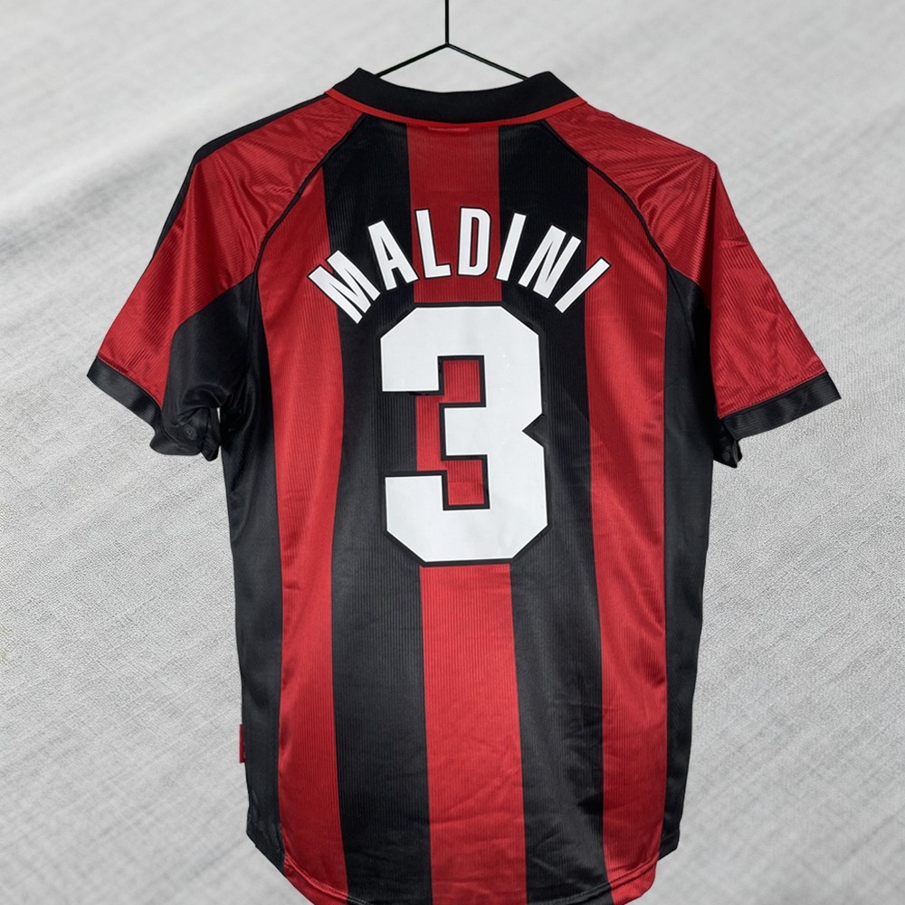 The AC Milan 1998-99 Serie A Home Jersey featuring Maldini #3 is an officially licensed soccer jersey designed for men. The jersey comes in a vibrant multi-color design representing the team's home uniform during the 1998-99 season. Made for fans of AC Milan, this jersey is a must-have item for supporters of the iconic soccer club. With its high-quality construction and authentic player details, this jersey is a perfect piece of fan apparel for any soccer enthusiast.