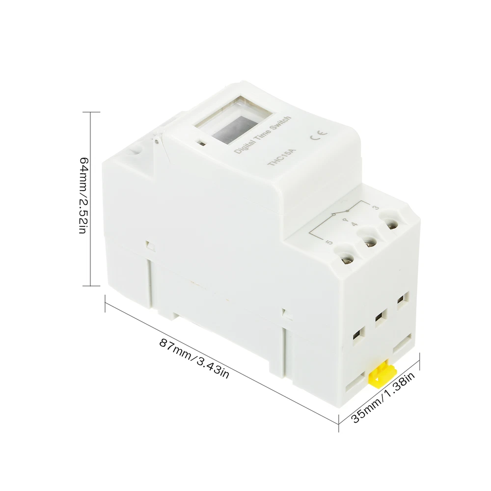 Digital electronics general purpose switch can repeat programs with 16 ON and 16 OFF settings for different uses for flexible scheduling. pre-setting week before. To-the-minute setting accuracy. Built-in rechargeable and intelligent chip, enable to retain programming setting even in a outage. Features: 7 Day Digital Programmable Timer -- Digital electronics general purpose switch with daily and weekly programs (10 different mode). 1 min to 168 hours full . Repeat programs with 16 ON and 16 OFF settings. To-the-minute setting accuracy LCD Display -- LCD displays real to Hour/Minute and ON/AUTO/OFF, large LCD screen for easy reading, you can see every figure on it clearly. Built-In Rechargeable -- It has a built-in 1.2V/40mA rechargeable and a industrial grade chip, so the unit retains the programming setting even in a outage. Easy Operation -- Large screen and clear button for easy and accurate operating. D+(setting the days), H+(setting the hours), M+(setting the minutes). Wide Application -- This timer switch could automatic turn on/off electric equipment according to the user set. With high and strong -interference ability, the timer switch is for controlling street , neon , production equipment, and television and other home appliances. Specification: Voltage: / / / 24V (Optional) Voltage Rating: AC 50/60Hz Number of Circuits: 1 changeover switch (SPDT) Error: ≤2S/day (25℃) On/Off operation: 16 times On and Off (manual / auto) : 4.5VA () Bound: 1min-168hours Backup: ≥15days Minimum Interval: 1 minute Load Capacity: 16A 250VAC Mechanical : 10^7 Electrically : 10^5 Humidity: 35-85%RH Operating : -10 - 55 ℃ Mounting Method: 36mm din rail Item Size: 87*64*35mm/3.43*2.52*1.38in Packing List: 1 * Digital Timer Switch