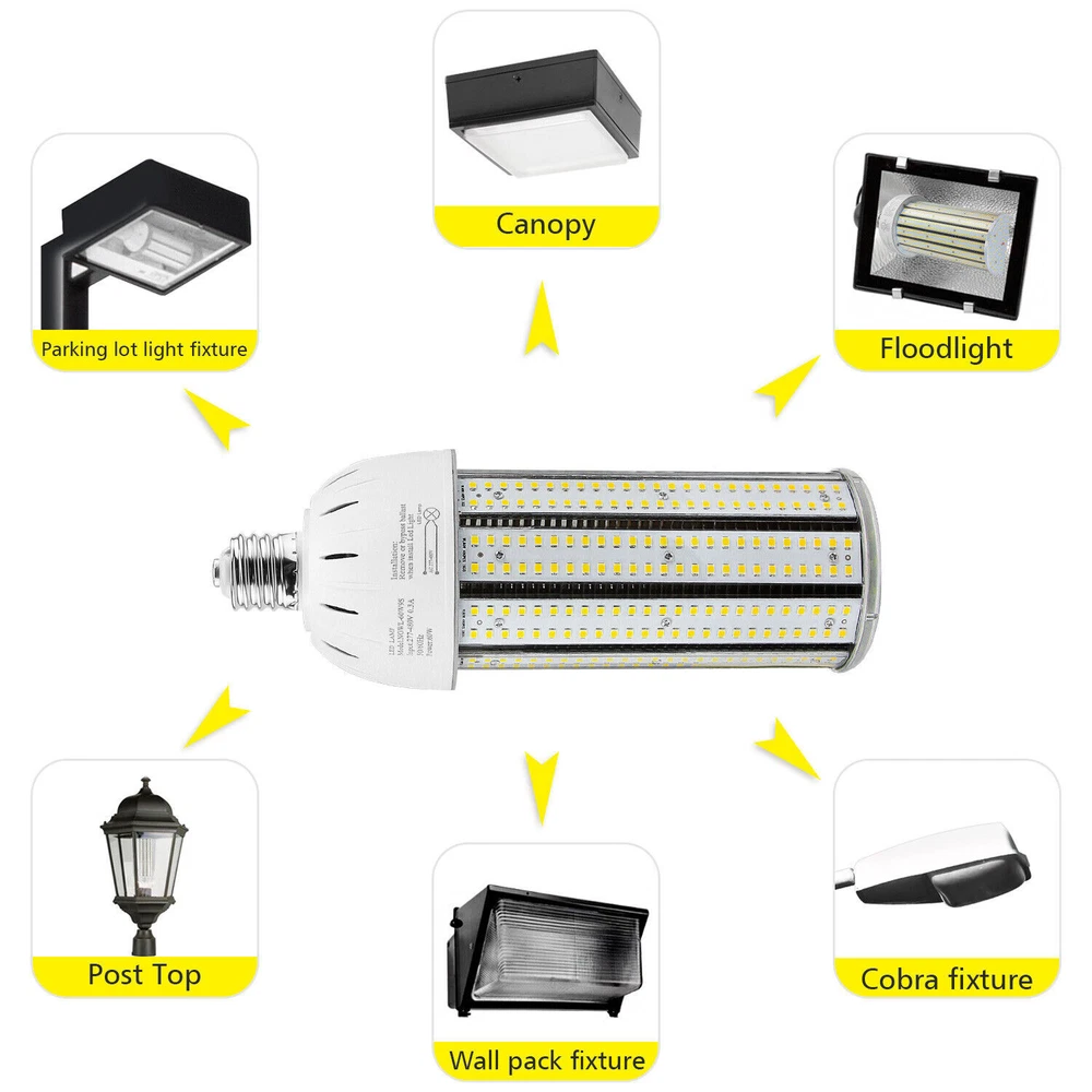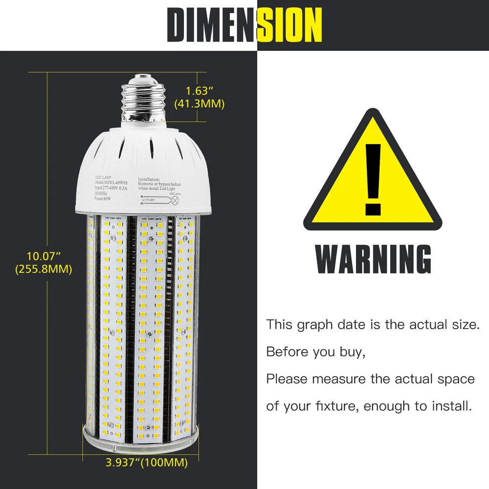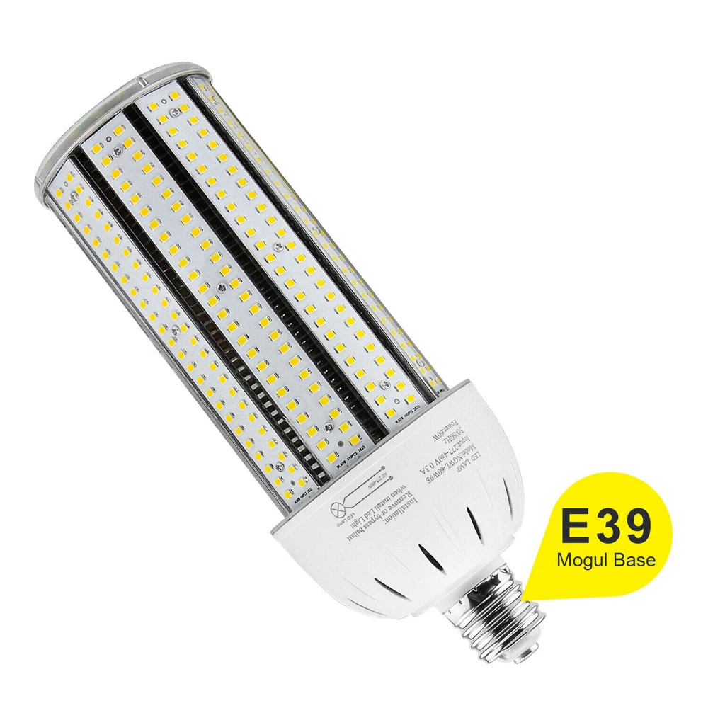 Product Description AC480V 347V LED Corn Cob Light Bulb 60W E39 Mogul Base Led Bulbs 5000K Daylight 【Super Bright】60W led corn cob with 8,400 lumens and 360 degree beam angle fits to be 250W HID Replacement retrofit. The installation height is recommended between 7ft and 12ft. 【90% Energy Saving】The LED corn light reduce more than 90% electricity consume than traditional light. Available for working voltage from 277VAC to 480VAC 【Quality Listed】The industrial quality light passed ETL certification. It offers a safer using at home, commercial, industrial area. 【Easy Installation】E39 Base is easy to Connect directly a screw base. Must be remove or bypass the ballast in your electric circuit before installation. 【Long Lifespan】This bulb has 50,000 hours lifespan. Offering at least 11 years of lighting time if used 12 hours a day. 【Warranty】We provide with 5 years warranty for all our bulbs. If any problem or question about bulbs please contact us by email. We will reply within 24 hours. Product Description The LED cob bulb are ETL listed with outstanding industrial quality, superb energy efficiency, long lifespan and easy installation. Compared with traditional light bulbs, we provide brighter lighting and wider applications, but we have achieved up to 90% energy saving. So our LED light bulbs can help you save more than 90% of electricity bills. The design of Non-flickering No UV or IR radiation can provide higher stability and reliability when using the bulbs. Feature: 1. ETL Listed 2.Replace 250W HID bulb 3.Instant lighting 4.6K high voltage surge protection 5.Non-flickering No UV or IR radiation Technical Data: 1.Lighting Technology: LED 2.Bulb Shape: Corn Cob 3.Rated Power: 60 watts 4.Input Voltage: AC277-480V 5.Bulb Base: E39 Base 6.Power Factor: >90% 7.Power Efficacy: 140 Lm/W 8.Color Temperature: 6,000K 9.Color Rendering Index (RA) : >80 10.PC Cover: Transparent 11.Materials:Aluminum+ASA 12.Lifespan: 50,000 hrs Wide Application: Indoor High Bay Area: warehouse, factory, workshop, shopping mall, church, garage, grocery, car wash-shop, gym, basketball court, tennis court, office, garden, community, back-yard, aircraft storage, farm, restaurant, airport, subway, convention center, swimming pool etc. Outdoor: Parking lot: shoebox, pole/box fixture. Street: cobra head, pole fixture. Gas station: canopy/High bay fixture. Yard/Garden: post top, floodlight/wall pack fixture, Billboard etc. About Us Payment Shipping Returns Contact Us SHENZHEN NUOGUAN TECHNOLOGY CO. LTD founded in 2010. We are high-technology comany specialized in manufacture Commercial and industrial LED light. Advanced production equipment and excellend R&D ability help us to combining service ,production sell together provide top-level products to our customers. 1. Payment is expected within 7 days of auction close. Or Unpaid Items will be forfeited per eBay . 2. Taxes may be applicable at checkout as states adopt new laws and regulations regarding sales tax collection. 1. We ONLY ship to USA . 2. Orders processed within 1-2 business day of payment verification. There’s no Delivery service or courier service on Saturdays, Sundays or Public Holidays. 3. We have 3 different warehouse in US,so due to stock status and time differences, we will choose to ship your item from our first available warehouse for fast delivery. 4. We offer Free Shipping within the Lower 48 states! All packages are sent via UPS or USPS.The delivery time for UPS Ground is typically 2-5 business days. We strive to ensure 100% satisfaction for each and every one of our customers. we offer a 30-day 100% money-back guarantee on all eBay orders. If your item isn't just as you wished, simply send it back to us and we'll refund or replace your item. Please note that all returns must be authorized by our Customer Service department. please contact us though message first if you have any problem. USA Warehouse. Fast shipping! We are appreciated your purchasing form our eBay store. Office Time: 9:30 - 18:30, Monday - Saturday (UTC+8) Please contact us with eBay Message. We will respond you within 24 hours on business day. About Us SHENZHEN NUOGUAN TECHNOLOGY CO. LTD founded in 2010. We are high-technology comany specialized in manufacture Commercial and industrial LED light. Advanced production equipment and excellend R&D ability help us to combining service ,production sell together provide top-level products to our customers. Payment 1. Payment is expected within 7 days of auction close. Or Unpaid Items will be forfeited per eBay . 2. Taxes may be applicable at checkout as states adopt new laws and regulations regarding sales tax collection. Shipping 1. We ONLY ship to USA . 2. Orders processed within 1-2 business day of payment verification. There’s no Delivery service or courier service on Saturdays, Sundays or Public Holidays. 3. We have 3 different warehouse in US,so due to stock status and time differences, we will choose to ship your item from our first available warehouse for fast delivery. 4. We offer Free Shipping within the Lower 48 states! All packages are sent via UPS or USPS.The delivery time for UPS Ground is typically 2-5 business days. Returns We strive to ensure 100% satisfaction for each and every one of our customers. we offer a 30-day 100% money-back guarantee on all eBay orders. If your item isn't just as you wished, simply send it back to us and we'll refund or replace your item. Please note that all returns must be authorized by our Customer Service department. please contact us though message first if you have any problem. Contact Us USA Warehouse. Fast shipping! We are appreciated your purchasing form our eBay store. Office Time: 9:30 - 18:30, Monday - Saturday (UTC+8) Please contact us with eBay Message. We will respond you within 24 hours on business day. You may also like 100W LED Barn Light with Dusk To Dawn Photocell Outdoor Garden Yard Night Light 69.05 USD Free shipping 200W UFO LED High Bay Light In