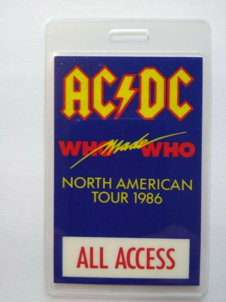 Unused old stock AC/DC original plastic laminated backstage pass from the1986 Who Made Who US tour. 4.25" x 2.5" size. Made by Otto but not marked. More rock, pop, new wave, original backstage concert passes for sale in our store.