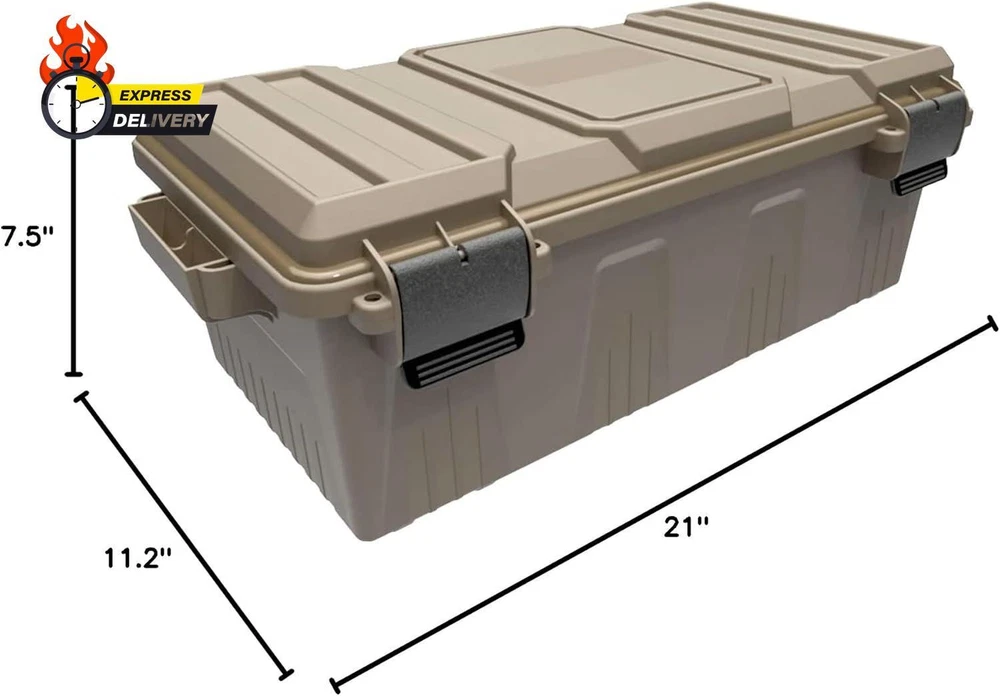 Ideal for easier carry and transport of multi-caliber ammo storage Spacious, compartmented interior with 3 removable partitions Water-resistant O-Ring seal (non-submersible); Stackable design with tie-down and strap-over points Strong snap latches plus 4 padlock tabs; Heavy-lift handles with a 75-lb carrying capacity Made in the USA; Inside Dimensions: 17.7”(45cm) x 8.6”(22cm) x 6.6”(17cm); Outside Dimensions: 21”(53cm) x 11.2”(28cm) x 7.5”(19cm)