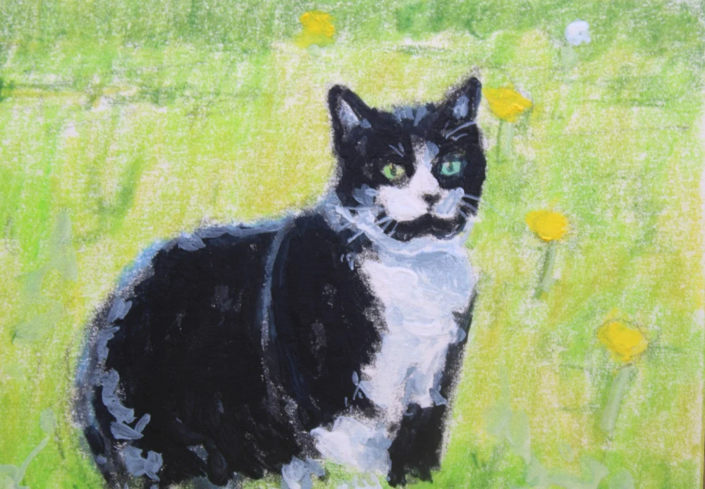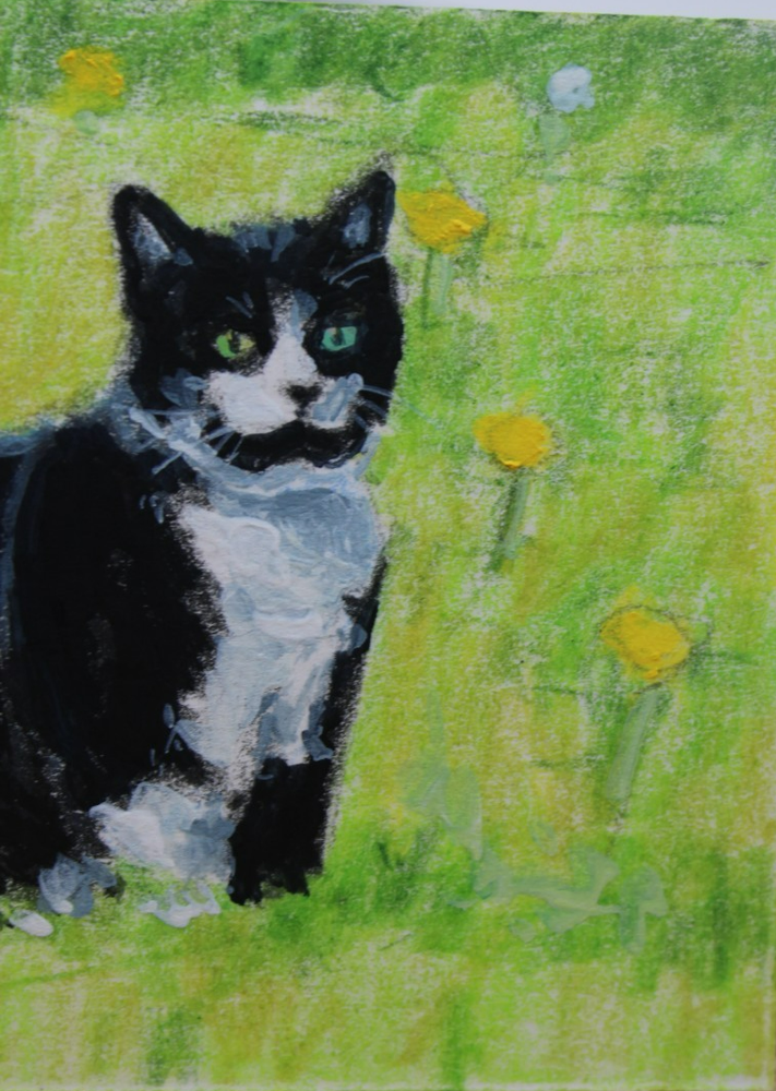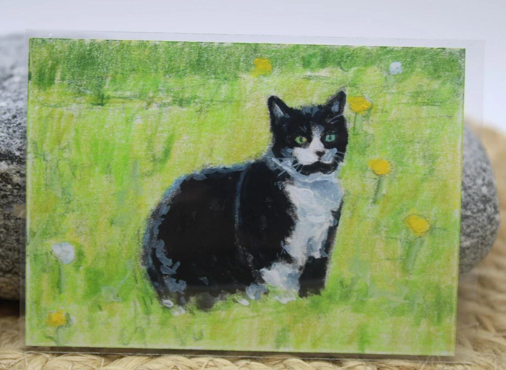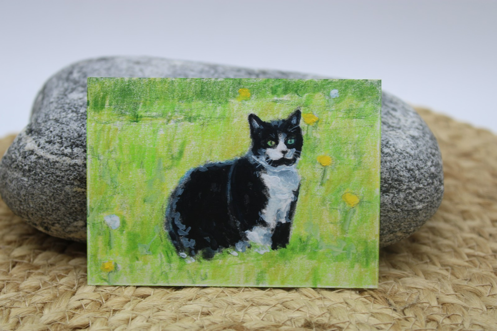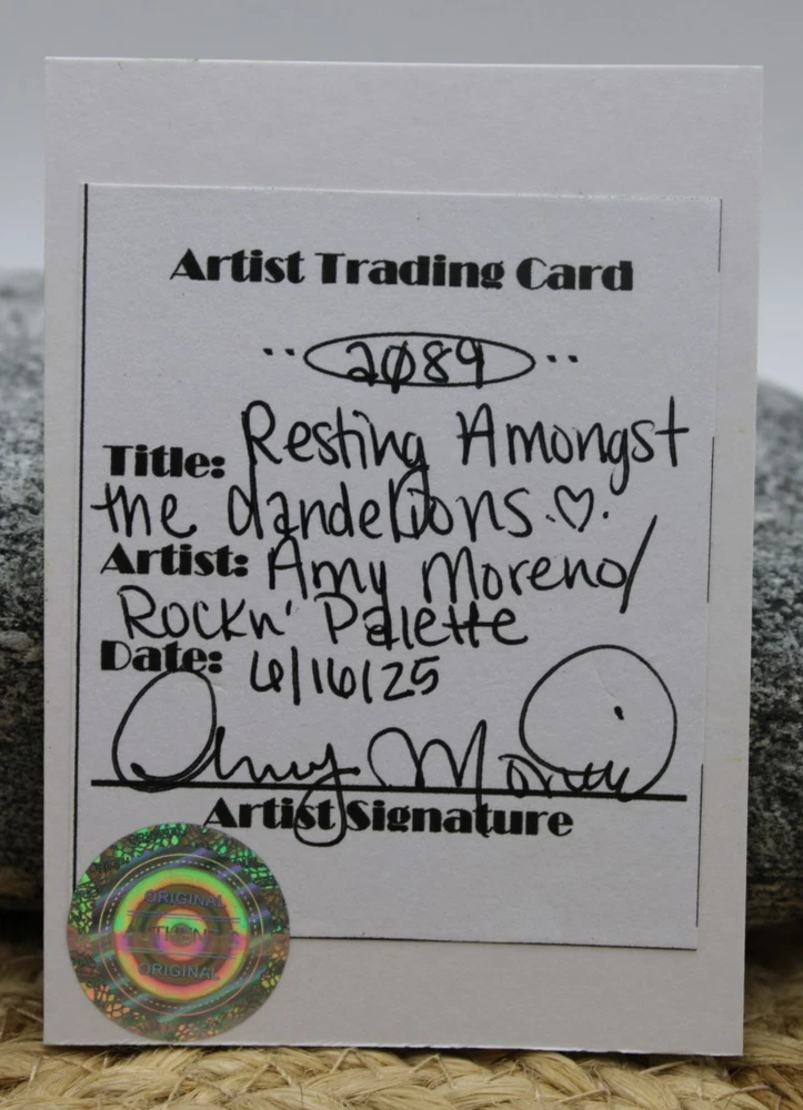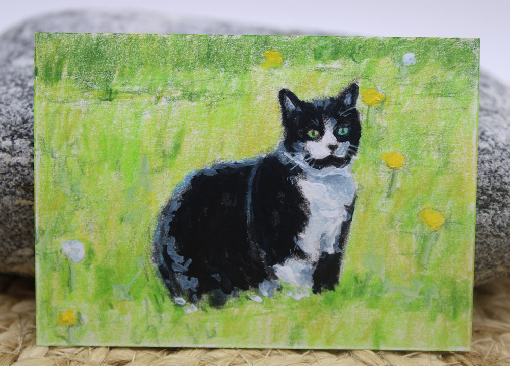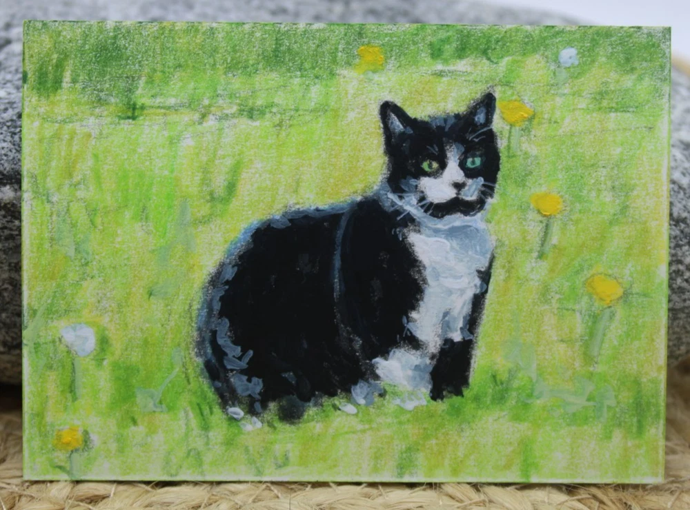 This is a cute original artwork done by me, Rockn Palette/ Amy Moreno. It is of a cute tuxedo cat sitting outdoors in a field of dandelions. This artwork is made with (mixed media) colored pencil and acrylic paint on mixed media paper. It is signed on the back with COA attached. Title: Resting amongst the dandelions. . ❤️ . Size: 2.5" by 3.5" Date: 6/16/25 This will ship in a regular envelope with stamps. I will make sure artwork in protected in envelope.