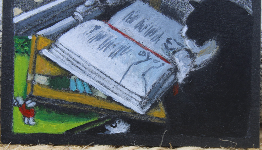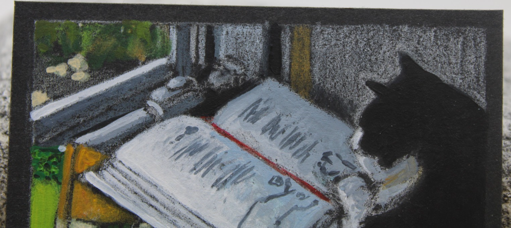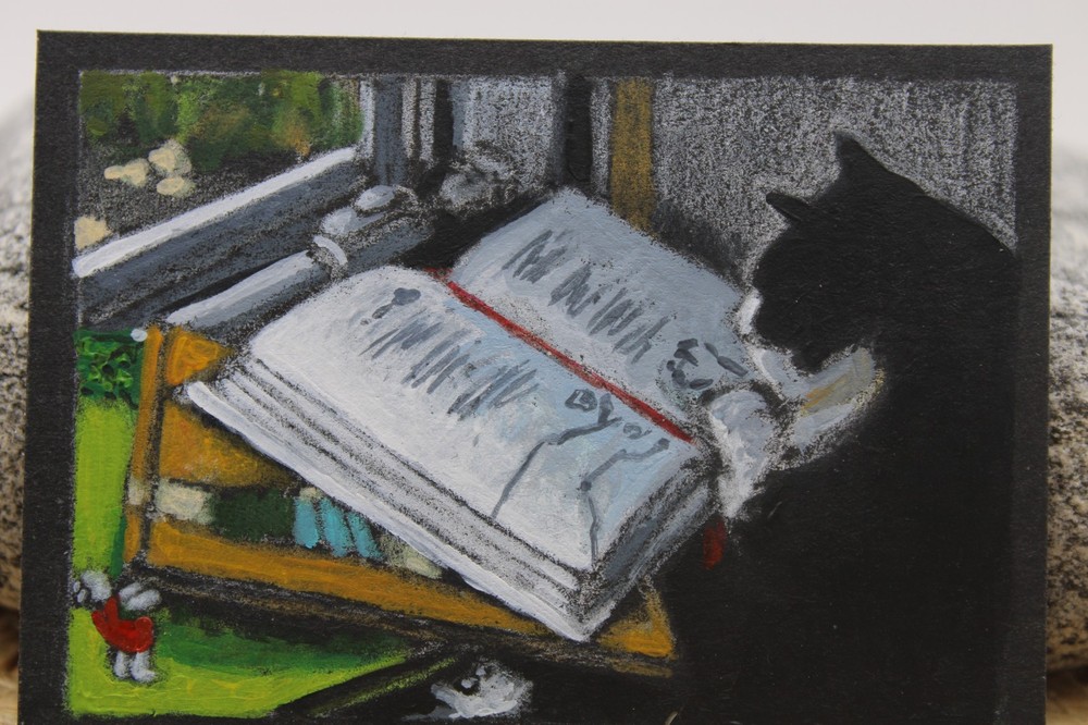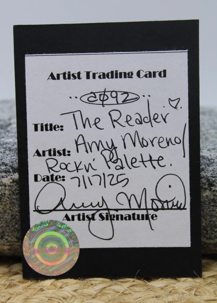 This is an adorable original artwork done by me, Rockn Palette/ Amy Moreno. It is of my cute tuxedo cat, Thomas, sitting at my front door "reading". This artwork is made with (mixed media) colored pencil and acrylic paint on black mixed media paper. It is signed on the back with COA attached. Title: The Reader. ❤️ . Size: 3.5" by 2.5" Date: 7/17/25 This will ship in a regular envelope with stamps. I will make sure artwork in protected in envelope.
