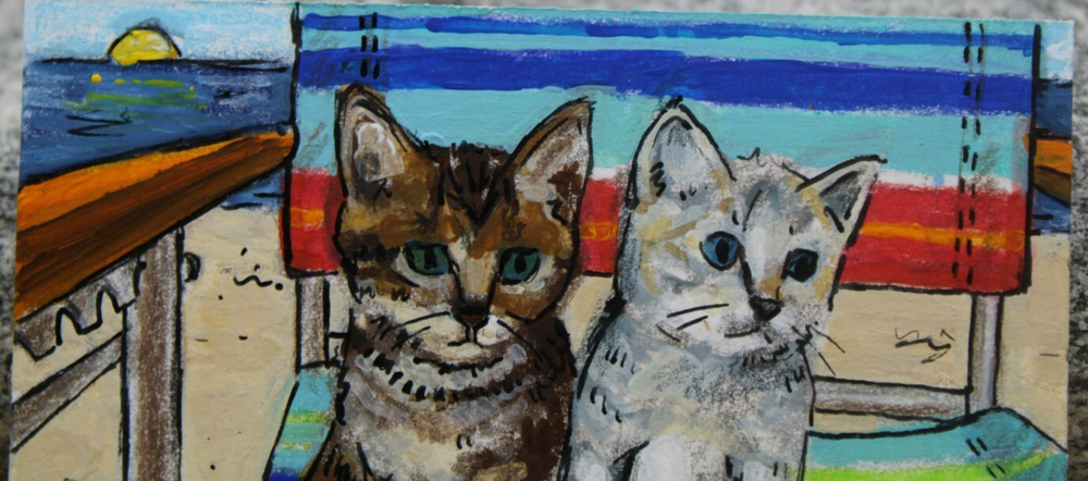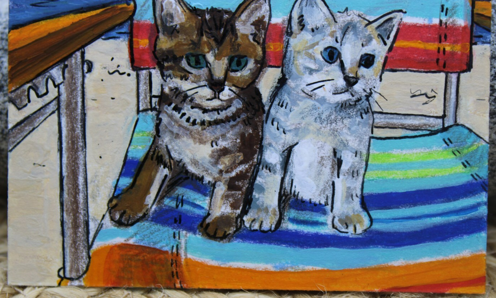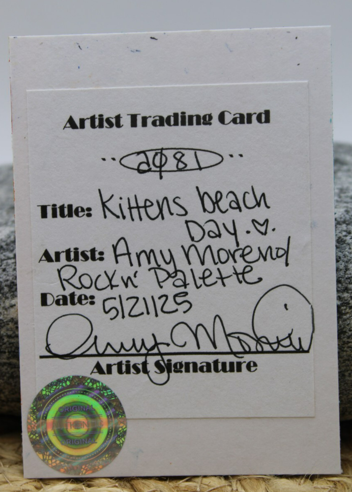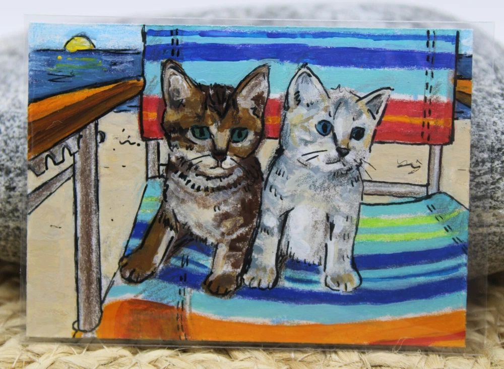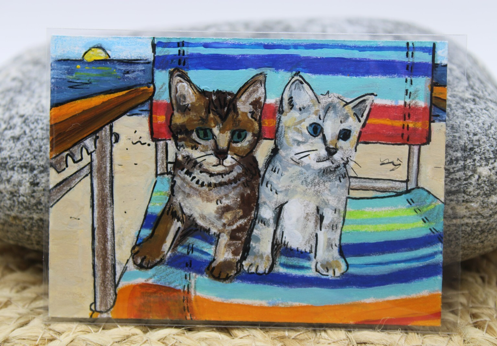 This is an adorable original artwork done by me, Rockn Palette/ Amy Moreno. The artwork is of two cute tabby kittens sitting on a beach chair with the ocean in the background. This artwork is made with (mixed media) colored pencil and acrylic paint on mixed media paper. It is signed on the back with COA attached. Title: Kittens beach day. Size: 2.5" by 3.5" Date: 5/21/25 This will ship in a regular envelope with stamps. I will make sure artwork in protected in envelope.