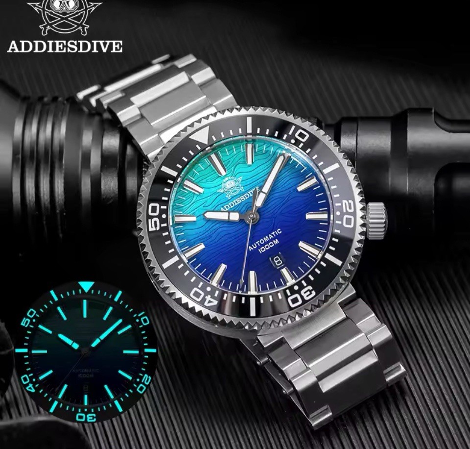 The ADDIESDIVE Men's Tuna 1000M Diver Watch is a stylish and functional timepiece designed for underwater adventures. With a silver case, black bezel, and blue dial, this automatic watch features a unidirectional rotating bezel, screwdown crown, and luminous hands and indexes for visibility in the deep sea. Water-resistant up to 1000 meters, this watch also boasts a 12-hour dial, sapphire crystal, and a 2-year manufacturer warranty. The sleek stainless steel bracelet and double-locking fold-over clasp ensure a secure fit on the wrist, making it a reliable choice for diving enthusiasts.