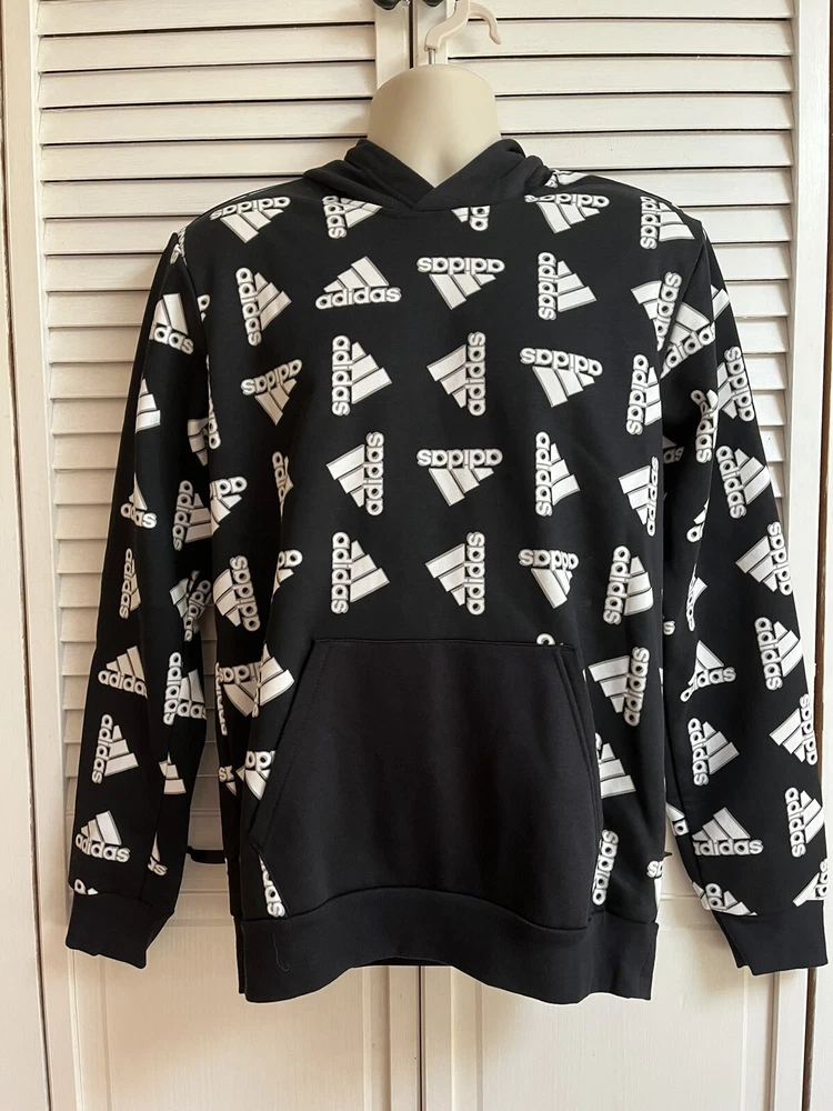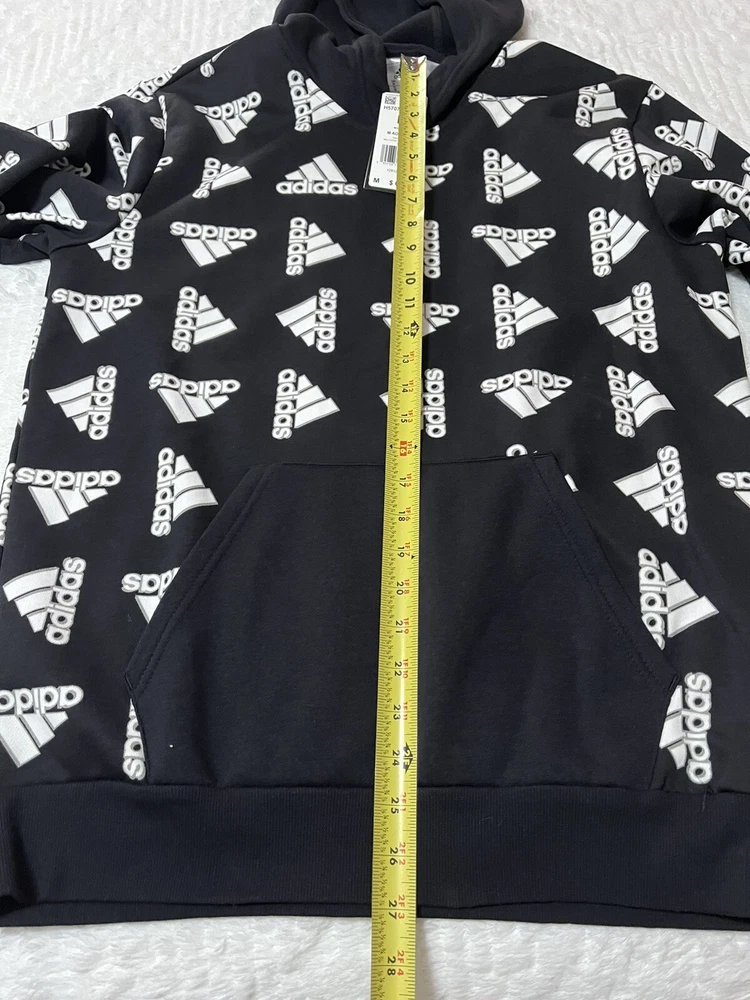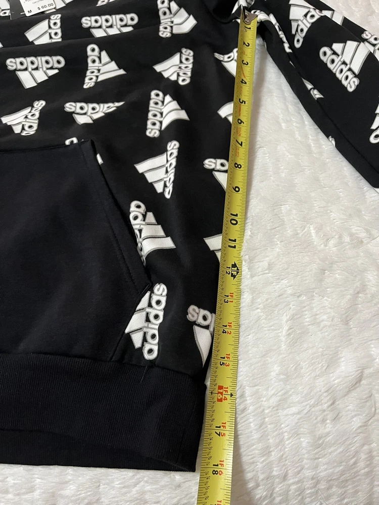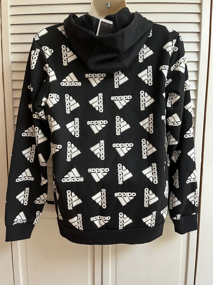 ADIDAS Hoodie BLACK ALL OVER PRINT Hooded SWEATSHIRT Pockets SZ Medium NWT. Retails for $ 60.00 great for fall or Christmas gifts. See pictures for details & measurements , thank you Shipped with USPS Ground Advantage.