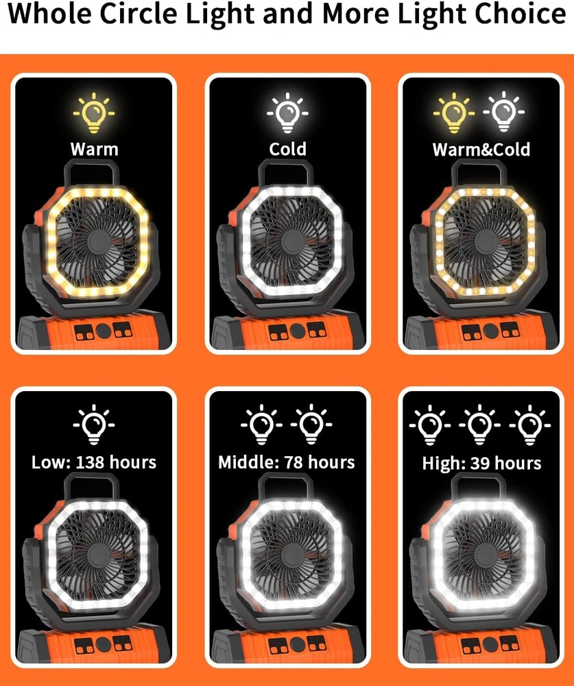ADUST Camping Fan Battery Operated Powered with LED Lantern F6, Orange Product Details Brand: ADUST Color: Orange Electric fan design: Table Fan Power Source: Battery Powered Style: Modern Product Dimensions: 4.5"D x 8.8"W x 11.2"H Room Type: Jobsite, beach, Bedroom, Patio, Camp Special Feature: Remote Controlled, Portable, LED Light, Timer, Oscillating Recommended Uses For Product: Air Circulation Wattage: 15 watts Number of Blades: 5 Theme: Versatile Voltage: 5 Volts Collection Name: battery operated powered camping fan rechargeable fan portable for tent beach canopy desk table Switch Type: Push Button Item Weight: 2.76 Pounds Included Components: Fan/Remote/USB Cable Indoor/Outdoor Usage: Outdoor, Indoor Model Name: F6 Control Method: Remote Light Type: LED Connector Type: USB Type C Blade Material: Plastic Reusability: Rechargeable Is Cordless?: Yes Number of Power Levels: 4 Manufacturer: ADUST Size: F6 Item Weight: 2.76 pounds Item model number: F6 Batteries: 2 Lithium Ion batteries required. (included) Mounting TypeController Type: Freestanding, Hanging HookRemote Control & Button Control MaterialNumber of Speeds: Plastic4 20000mAh Battery with Power Bank Function - ADUST 3 in 1 Rechargeable battery powered fan, equipping with a light, power bank and fan, has 20000mAh longevity large capacity battery with high conversion rate. 100% power can be used continuously for 12-138 hours depending on different options. The portable camping fan have 5V/3A Type-C input/output and 5V/3A USB output charging port. Therefore you can use the battery operated fan as a large portable charger to reverse charging 2 phones for emergency using. Shut off the Noisy Beeping - Enjoy all-day serenity and comfort, enable by long press the sleep mode button. Along with indicator lights off, short pressing the sleep mode buttton to archieve. You can always get restful and quiet sleep. Remote Control & Button Operation - This portable fan can be controlled by button on the fan base or controlled by remote so you don't have to go to the fan position and press the button. Fan speeds, light temperature, light brightness, timer, auto oscillation, sleep mode (turn off all indicator and response sound), all these functions can be achieved by combining base buttons and remote controls.(Note: Remove the insulating plate in the slot on the back of the remote) 45°/90° Auto Oscillation & 270° Manual Pivoting & 360° Hanging Hook - Selectable 45°/90° oscillation provides you a comfortable and natural wind instead of straight wind(The angle can also be fixed). Our portable fan is designed with 270° manual upside down pivoting. 360° Hanging Hook design allows you to hang it anywhere and at any direction. 4 Level of Wind Speeds - Choose from gentle airflow to a powerful gust, depending on your preference. Fully charged battery fan can be used for 12-19-32-58 hours according to the 4-3-2-1 wind speed strength. Whether used indoors or outdoors, it can keep you cool and keep the air flowing. 3 Level of Light Brightness & 3 Color Temperature - This camping tent fan with LED latern can illuminate your enviroment when it's dark. 3 color temperature, warm/cold/warm&cold, provide more options to meet your preference. Choose from low brightness to high brightness, a fully charged battery fan can be used for 138-78-39 hours. 1/2/4/8H Timer and More Functions - 4 timing options to match your different needs. Whether it’s air circulation throughout the night while sleeping, or a brief moment of coolness. If you are worried that the fan indicator light will disturb you at night, you can short press the 'Sleep Mode' button to turn off the indicator light; if you do not want to be disturbed by the fan's response sound at night, you can long press the 'Sleep Mode' button to turn off the sound. Excellent design for multiple scenarios - Build-in battery operated fan can keep you whole day cool and use as a lantern to bright up the darkness if you encounter extreme weather causing power outages. This portable electric fan can work while charging so you don’t have to worry about the low electricity. You can put it in house as a floor fan with rubber feets installed on the bottom, you can also use it in outdoor travel trips due to the durability, carry this portable fan outside to beach for relax or to jobsite for canopy hanging.