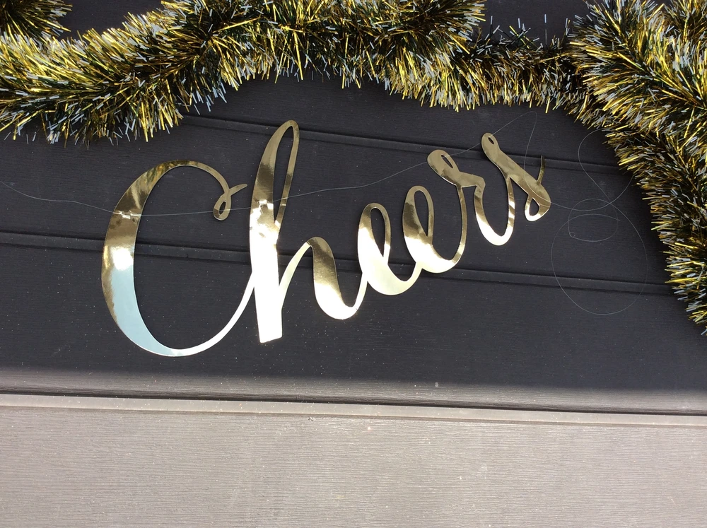 ITEM: New Years Eve Decor - Black Gold Tinsel with Cheers Sign Garland 12ft DETAILS: Lighted tinsel garland. 150 clustered red/white lights bulbs on red cord. Indoor use only. See picture for details. SIZE: Garland: 12 feet long approx. Die-cut Word: 17 x 7 -inch on a clear 7 foot line MFG: Agape Gifts
