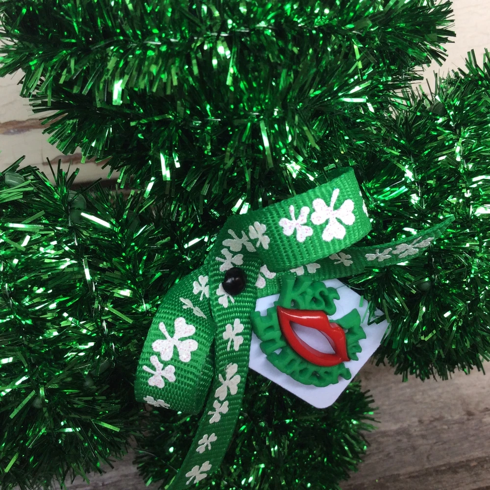 ITEM: St Patrick's Decor - Kiss Me Irish Mini Tinsel Shamrock Display DETAILS: Plastic and tinsel construction with various embellishments. See picture for details. SIZE: 6 x 6 x 1.5-inch MFG: Agape Gifts Designs