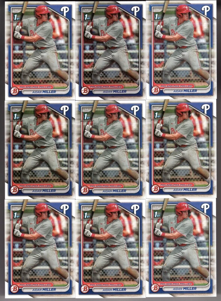 You are bidding on a lot of 10 2024 Bowman Prospects Aidan Miller RC #BP-27. The winner will please include $3.49 for the first item and $0.99 for each additional item for secure, padded shipping. There is a maximum shipping charge of $9.95 no matter how many items you win! International shipping will be extra. Thank you and good luck!
